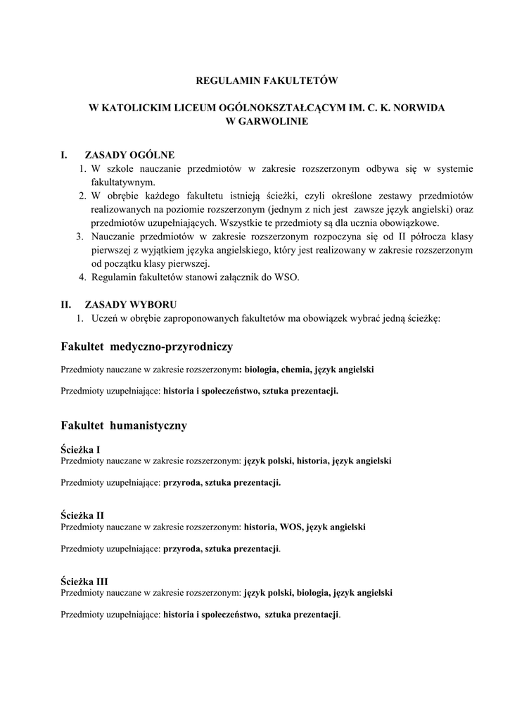 REGULAMIN FAKULTETÓW W KATOLICKIM LICEUM OGÓLNOKSZTAŁCĄCYM IM. C. K. NORWIDA W GARWOLINIE I. ZASADY OGÓLNE 1. W szkole nauczanie przedmiotów w zakresie rozszerzonym odbywa się w systemie fakultatywnym. 2. W obrębie każdego fakultetu istnieją ścieżki, czyli określone zestawy przedmiotów realizowanych na poziomie rozszerzonym (jednym z nich jest zawsze język angielski) oraz przedmiotów uzupełniających. Wszystkie te przedmioty są dla ucznia obowiązkowe. 3. Nauczanie przedmiotów w zakresie rozszerzonym rozpoczyna się od II półrocza klasy pierwszej z wyjątkiem języka angielskiego, który jest realizowany w zakresie rozszerzonym od początku klasy pierwszej. 4. Regulamin fakultetów stanowi załącznik do WSO. II. ZASADY WYBORU 1. Uczeń w obrębie zaproponowanych fakultetów ma obowiązek wybrać jedną ścieżkę: Fakultet medyczno-przyrodniczy Przedmioty nauczane w zakresie rozszerzonym: biologia, chemia, język angielski Przedmioty uzupełniające: historia i społeczeństwo, sztuka prezentacji. Fakultet humanistyczny Ścieżka I Przedmioty nauczane w zakresie rozszerzonym: język polski, historia, język angielski Przedmioty uzupełniające: przyroda, sztuka prezentacji. Ścieżka II Przedmioty nauczane w zakresie rozszerzonym: historia, WOS, język angielski Przedmioty uzupełniające: przyroda, sztuka prezentacji. Ścieżka III Przedmioty nauczane w zakresie rozszerzonym: język polski, biologia, język angielski Przedmioty uzupełniające: historia i społeczeństwo, sztuka prezentacji. Ścieżka IV Przedmioty nauczane w zakresie rozszerzonym: język polski, WOS, geografia, język angielski Przedmioty uzupełniające: historia i społeczeństwo, sztuka prezentacji. Fakultet politechniczny Ścieżka I Przedmioty nauczane w zakresie rozszerzonym: matematyka, fizyka, język angielski Przedmioty uzupełniające: historia i społeczeństwo, sztuka prezentacji. Ścieżka II Przedmioty nauczane w zakresie rozszerzonym: matematyka, chemia, język angielski Przedmioty uzupełniające: historia i społeczeństwo, sztuka prezentacji. Ścieżka III Przedmioty nauczane w zakresie rozszerzonym: matematyka, biologia, język angielski Przedmioty uzupełniające: historia i społeczeństwo, sztuka prezentacji. Fakultet ekonomiczny Ścieżka I Przedmioty nauczane w zakresie rozszerzonym: matematyka, geografia, język angielski (plus dla chętnych drugi język obcy) Przedmioty uzupełniające: historia i społeczeństwo, sztuka prezentacji. Ścieżka II Przedmioty nauczane w zakresie rozszerzonym: matematyka, historia, język angielski Przedmioty uzupełniające: przyroda, sztuka prezentacji. Ścieżka III Przedmioty nauczane w zakresie rozszerzonym: WOS, geografia, język angielski Przedmioty uzupełniające: historia i społeczeństwo, sztuka prezentacji. 2. Uczniowie dokonują wyboru ścieżki w klasie pierwszej do 30 listopada danego roku szkolnego. Wybór potwierdzają złożeniem do wychowawcy pisemnej deklaracji. Formularz deklaracji stanowi załącznik do Regulaminu fakultetów. III. ZASADY ZMIANY 1. Wszelkie zmiany decyzji w późniejszym czasie są możliwe tylko w uzasadnionych przypadkach i po konsultacji z nauczycielem uczącym na danym poziomie oraz nauczycielem odpowiedzialnym za tygodniowy rozkład zajęć. Zmiana ścieżki może nastąpić po zaakceptowaniu przez dyrektora szkoły. 2. Podanie o zmianę ścieżki uczeń składa do dyrektora szkoły. Po zaakceptowaniu zmiany przez dyrektora szkoły uczeń informuje o niej wychowawcę i nauczyciela odpowiedzialnego za tygodniowy rozkład zajęć. 3. Wychowawca klasy ma obowiązek posiadać aktualne informacje o tym, jaką ścieżkę realizuje dany uczeń. 4. W przypadku zmiany ścieżki w drugim półroczu klasy pierwszej, uczeń ma obowiązek zaliczyć zrealizowany materiał z przedmiotów, których dotąd nie realizował na poziomie rozszerzonym, w terminie i formie wyznaczonej przez nauczyciela. Każda ocena z zaliczenia różnic programowych wpisywana jest do dziennika na czerwono. 5. Jeśli zmiana ta następuje z końcem półrocza/roku szkolnego, uczeń ma obowiązek napisać sprawdzian w terminie wyznaczonym przez dyrektora szkoły. Sprawdzian uznaje się za zaliczony, jeśli uczeń uzyska przynajmniej 36% wymaganych punktów. 6. Zaliczony sprawdzian jest warunkiem uczęszczania na przedmiot w zakresie rozszerzonym w następnym półroczu/roku szkolnym. 7. Jeżeli przy zmianie ścieżki następuje zmiana przedmiotów uzupełniających, uczeń ma obowiązek zaliczyć zrealizowany materiał w terminie i formie wyznaczonej przez nauczyciela. IV. ZASADY UCZESTNICZENIA W ZAJĘCIACH W ZAKRESIE ROZSZERZONYM Z JĘZYKÓW OBCYCH Nauczanie języka angielskiego odbywa się przez trzy lata w grupach (międzyoddziałowych) z podziałem na stopnie zaawansowania. Każda z grup realizuje zakres rozszerzony i ma tę samą liczbę godzin. Nauczanie drugiego języka obcego nowożytnego na poziomie rozszerzonym odbywać się będzie poza ścieżkami przyporządkowanymi do poszczególnych fakultetów dla grup (międzyoddziałowych) minimum ośmioosobowych. Regulamin zatwierdzono na posiedzeniu rady pedagogicznej w dniu 27 czerwca 2016 r.