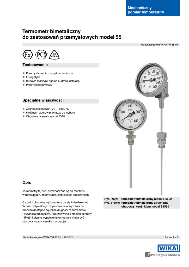 Mechaniczny pomiar temperatury Termometr bimetaliczny do zastosowań przemysłowych model 55 Karta katalogowa WIKA TM 55.01 Zastosowanie Przemysł chemiczny, petrochemiczny Energetyka Budowa maszyn i ogólna budowa instalacji Przemysł spożywczy Specjalne właściwości Zakres zastosowań -70 ... +600 °C 6 różnych wzorów przyłączy do wyboru Obudowa i czujnik ze stali CrNi Opis Termometry tej serii przeznaczone są do montażu w rurociągach, zbiornikach, instalacjach i maszynach. Czujnik i obudowa wykonane są ze stali nierdzewnej. W celu optymalnego dopasowania urządzenia do procesu dostępne są różne długości zanurzeniowe i przyłącza procesowe. Poprzez wysoki stopień ochrony ( IP 65) i płynne wypełnienie termometr może być stosowany przy wysokich wibracjach. Karta katalogowa WIKA TM 55.01 ∙ 12/2012 Rys. lewy: termometr bimetaliczny model R5502 Rys. prawy: termometr bimetaliczny z ruchomą obudową i czujnikiem model S5550 Strona 1 z 5 Cechy standardowe Podzielnia Białe aluminium, skala czarna Element pomiarowy spirala bimetaliczna Szyba Szkło przemysłowe NS 63: szyba poliweglanowa Wskazówka Aluminum czarne, wskazówka nastawna - mikro Rozmiar nominalny w mm 63, 100, 160 Forma budowy złącza S standardowa (przyłącze gwintowe, stałe) 1 czujnik gładki (bez gwintu) 2 złącze ruchome z gwintem zew. 3 złącze ruchome z gwintem wew. 4 złącze zaciskowe (przesuwne na czujniku) 5 złącze ruchome z uszczelką Model Model A5525 A5500 A5501 R5526 R5502 R5503 S5550 S5551 NS 63 100 160 63 100 160 100 160 Korekta zera Z tyłu obudowy, na zewnątrz tylko dla termometrów z ruchomą obudową i podzielnią (opcjonalnie) Dopuszczalne ciśnienie na czujnik max. 25 bar, statyczne Dopuszczalna temperatura otoczenia na obudowe -20 ... +60 °C (opcjonalnie: -50 ... +60 °C) Wersja tylne położenie czujnika (axial) Dopuszczlna temperatura przechowywania i transportu -20 ... +60 °C (EN 13190) dolne położenie czujnika (radialny) Stopień ochrony obudowy IP 65 wg EN 60 529 tylne położenie czujnika, ruchoma obudowa i czujnik Klasa dokładności Klasa 1 wg DIN EN 13 190 Zakres pracy Stały (1 rok): zakres pomiarowy (DIN EN 13 190) Pomiar chwilowy (max. 24 h): zakres wskazań (DIN EN 13 190) Obudowa i pokrywa typu twist Stal CrNi Czujnik i przyłącze procesowe Stal CrNi 1.4571 Opcje Zakres wskazań °F, °C / °F (podwójna skala) Płynne wypełnienie max. do 250 °C (na czujnik) Szyba wielowarstwowa bezpieczna, szkło akrylowe Średnica czujnika 6, 10, 12 mm Stopień ochrony IP 66 Termometr z przełącznikiem kontaktowym (karta katalogowa TV 25.01) Specjalne zakresy pomiarowe lub znakowanie zgodnie ze specyfikacją klienta (na zapytanie) Wersja wg ATEX Ex II 2GD c TX Zakres pomiarowy, wskazań, błąd graniczny (DIN EN 13 190) Skalowanie wg normy WIKA Zakres wskazań w °C -70 ... +30 -50 ... +50 -30 ... +50 -20 ... +60 0 ... 60 0 ... 80 0 ... 100 0 ... 120 0 ... 160 0 ... 200 0 ... 250 0 ... 300 0 ... 400 0 ... 500 0 ... 600 Zakres pomiarowy 1) Elementarna podziałka skali Błąd graniczny w °C w °C w°C -60 ... +20 -40 ... +40 -20 ... +40 -10 ... +50 10 ... 50 10 ... 70 10 ... 90 10 ... 110 20 ... 140 20 ... 180 30 ... 220 30 ... 270 50 ... 350 50 ... 450 100 ... 500 1 1 1 1 1 1 1 2 2 2 5 5 5 5 10 1 1 1 1 1 1 1 2 2 2 2,5 5 5 5 10 1) Zakres pomiaru jest wskazany na podzielni przez 2 trójkątne znaczniki. Według DIN EN 13 190 tylko w tym zakresie obowiązuje ustalony limit błędów Strona 2 z 5 Karta katalogowa WIKA TM 55.01 ∙ 12/2012 3073050.05 Forma budowy złącza Forma złącza, standardowa ( przyłącze gwintowe, stałe)1) Stałe przyłącze procesowe: G ½ B, G ¾ B, ½ NPT, ¾ NPT Długość zanurzeniowa: l1 = 63, 100, 160, 200, 250 mm Rozmiar NS Przyłącze procesoG i 63, 100, 160 G ½ B G¾B ½ NPT ¾ NPT 14 16 19 20 Wymiary w mm SW d4 Ød 27 32 22 30 26 32 - 8 8 8 8 Legenda: G gwint zewnętrzny i długość gwintu Ø d4 średnica kołnierza uszczelniającego SW pod klucz Ø d średnica czujnika l2 długość aktywna Rozmiar NS 63 100, 160 Wymiary w d1 Ød 14 18 8 8 a przy a przy ruchomej 15 15 25 25 tylnym obudowie i czujniku 3073050.05 Forma złącza 1, czujnik gładki ( bez gwintu) Długość zanurzeniowa: l1 = 140, 200, 240, 290 mm Legenda: a odległość od obudowy /kolanka Ø d1 średnica szyjki Ø d średnica czujnika l2 długość aktywna Rozmiar NS 3073050.05 Forma złącza 2, ruchoma z gwintem zew. Długość zanurzeniowa: l1 = 80, 140, 180, 230 mm Przyłącze procesowe Wymiary w mm G i SW Ød 63, 100, 160 G ½ B 20 27 8 Legenda: G gwint zewnętrzny i długość gwintu SW pod klucz Ø d średnica czujnika długość aktywna l2 Legenda: G1 gwint wew. i długość gwintu SW pod klucz Ø d średnica czujnika l2 długość aktywna Rozmiar NS 63, 100, Przyłącze procesowe G1 i G½ 8,5 G¾ 10,5 M24 x 1,5 13,5 3073050.05 Forma złącza 3, ruchoma z gwintem wew. Długość zanurzeniowa: l1 = 89, 126, 186, 226, 276 mm Wymiary w mm SW Ød 27 32 32 8 8 8 Rozmiar NS 63, 100, 160 Przyłącze procesowe Wymiary w mm G i SW d4 Ød G½B G¾B M18 x 1,5 ½ NPT ¾ NPT 14 16 12 19 20 27 32 24 22 30 Karta katalogowa WIKA TM 55.01 ∙ 12/2012 26 32 23 - 8 8 8 8 8 3073050.05 Forma złącza 4, złącze zaciskowe (przesuwne na czujniku) Standardowe dł. zanurzeniowe l1: 63, 100, 160, 200, 250 mm Długość L = l1 + 40 mm uszczelka Legenda: G gwint zewnętrzny i długość gwintu Ø d4 średnica kołnierza uszczelniającego SW pod klucz Ø d średnica czujnika długość aktywna l2 Strona 3 z 5 Rozmiar NS 3073050.05 Forma złącza 5, złącze ruchome z uszczelką ¾ B, M18 x 1,5 jak również ½ NPT, ¾ NPT Min. długość zanurzeniowa lmin ok. 60 mm Długość zanurzeniowa l1 = różna Długość L = l1 + 40 mm Stal CrNi 1.4571 Przyłącze procesowe Wymiary w mm G i SW d4 Ød G½B G¾B M18 x 1,5 ½ NPT ¾ NPT 63, 100, 14 16 12 19 20 27 32 24 22 30 26 32 23 - SW pod klucz Ø d średnica czujnika l2 długość aktywna Legenda: G gwint zewnętrzny i długość gwintu Ø d4 ś