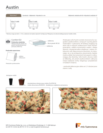 Austin Wymiary* Szerokość • Głębokość • Wysokość w cm Głębokość siedziska 60-50 • Wysokość siedziska 47 1 2,5 3 143x111x90 224x111x90 243x111x90 105 186 205 * Wymiary mogą się różnić +/- 3%, w zależności od wyboru tapicerki i konfiguracji. Piktogramy nie odzwierciedlają proporcji i kształtu mebla. Comfort EU Poduszka siedziska EU Wkład poduszki składa się pianki wysokoelastycznej pokrytej włókniną. włóknina 18cm pianki HR 30 włóknina Poduszka oparciowa włókna silikonowe Poduszki są odwracalne. Atrakcyjna sofa Austin została stworzona ku wygodzie użytkowników, ceniących wysoką jakość materiałów i wykonania. W kolekcji znajdują się dwie sofy w różnych wielkościach i fotel. Ponadprzeciętna, solidna konstrukcja mebla z litego drewna, niezaprzeczalna elegancja i walory estetyczne sofy dają poczucie pewności, że zanurzając się w jej przepastne przestrzenie, będzie można oddać się marzeniom lub zapaść w odnawiającą siły drzemkę. Sofa Austin ukrywa nóżki za falbanką, ale przed użytkownikiem odkrywa swoje najlepsze cechy: elegancję i przydatność w każdym wnętrzu. - poduszki dekoracyjne deko art. 21 dostarczane razem z sofą dostępne nóżki: standardowo dostarczana nóżka PLASTIK 90 nóżka drewniana RHODOS - dodatkowo odpłatnie zamawiana MTI-Furninova Polska Sp. z o.o., ul. Bolesława Chrobrego 3, 11-400 Kętrzyn tel. 89 751 32 65, fax 89 751 51 57, e-mail: [email protected]