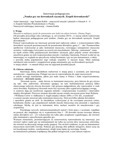 Innowacja pedagogiczna „Nauka gry na dzwonkach ręcznych. Zespół dzwonkarski” Autor innowacji – mgr Joanna Kukla – nauczyciel muzyki i plastyki w klasach 4 – 6 w Zespole Szkolno-Przedszkolnym w Piasku. Nauczyciel realizujący innowację – Joanna Kukla I. Wstęp Muzyka to najlepszy język do poruszenia serc ludzi na całym świecie. (Jimmy Page) Od początku przyszłego roku szkolnego, tj. od września 2015r., w naszej szkole realizowana będzie innowacja pedagogiczna pod tytułem „Nauka gry na dzwonkach ręcznych. Zespół dzwonkarski.” Pomysł wprowadzenia tej innowacji powstał pod wpływem zabaw z wykorzystaniem kilku dzwonków ręcznych przeznaczonych do poznawania dźwięków gamy C – dur. Postanowiłam spróbować wykorzystać je jako instrument muzyczny, rozwijający umiejętności muzyczne uczniów i wpływający korzystnie na rozwój ich muzykalności. Mówiąc „instrument”, mam na myśli zestaw kilku pojedynczych dzwonków ręcznych, gdyż jedynie zestaw dzwonków umożliwia granie na nich rozpoznawalnej muzyki z melodią i harmonią. Pomysł wydał mi się interesujący ze względu na specyficzny rodzaj brzmienia i gry na tym instrumencie, a także z powodu małej popularności tego rodzaju zespołów w naszym kraju. Mam nadzieję zaciekawić nim uczniów i zorganizować grupę entuzjastów gry na dzwonkach ręcznych w mojej szkole – w ramach lekcji oraz na zajęciach pozalekcyjnych. II. Główne założenia Innowacja, którą chciałabym realizować w mojej pracy z uczniami, jest innowacją metodyczno - organizacyjną. Polegać ma ona na wprowadzeniu do zajęć muzycznych w szkole nowego instrumentu, jakim jest mało znany w Polsce i mało rozpowszechniony instrument – dzwonek ręczny. Dzwonek ręczny – mały dzwon, to instrument muzyczny, przy którym do gry używa się ręki. Aby zadzwonić, dzwoniarz (grający na tym instrumencie)za pomocą lekko elastycznego uchwytu chwyta dzwonek i tak porusza nadgarstkiem, aby wprowadzić w ruch serce dzwonka. Pojedynczy dzwonek może być używany jako sygnał przyciągający uwagę, w zestawie dają już możliwość zagrania melodii i rozpoznawania wysokości i interwałów między dźwiękami. Pierwsze strojone dzwonki ręczne zostały stworzone przez braci Roberta i Williama Corów w Aldbourne w Anglii między rokiem 1696 a 1724. Ich „wynalazek” z czasem zaczęto stosować jako instrument muzyczny. Dziś jest kilka odmian dzwonków i sposobów grania na nich. Ja chciałabym wykorzystać je do rozwijania poczucia rytmu, kształcenia słuchu i gry popularnych melodii muzyki klasycznej oraz piosenek z repertuaru szkolnego. Myślę, że jest to instrument, który zachęci uczniów do muzykowania i gry zespołowej. Poszukując nowych, niekonwencjonalnych metod i form pracy z uczniami, wpadłam na pomysł, aby znajdujące się w wyposażeniu klas I – III dzwonki ręczne tworzące oktawę ośmiu dźwięków (c2 - c3) wykorzystać nie tylko jako urządzenie sygnalizujące, ale również jako instrument o specyficznym sposobie gry. Ważnym elementem, przemawiającym za sensownością wprowadzenia tej innowacji, jest również wpływ nauki gry na instrumentach nie tylko na rozwój sfery muzycznej człowieka, ale również na aktywację mózgu osoby grającej. Nie od dziś wiadomo, że gra na instrumencie muzycznym niezwykle rozwija. Podczas gry pracują obie półkule mózgowe, dzieci uczą się też koordynacji ruchów, synchronizacji, dzięki temu lepiej się rozwijają. Granie na instrumencie pobudza współpracę obu półkul mózgowych, a tym samym wpływa na rozwój zdolności uczenia się i zapamiętywania. Uczy też samodyscypliny, rozwija wyobraźnię i wrażliwość człowieka. Zagranie melodii na dzwonkach ręcznych wymaga doskonałej współpracy grupy osób grających, ponieważ specyfiką tego instrumentu jest to, iż stanowi on małą cząstkę większej całości. Zespół uczniów grających na dzwonkach tworzy jakby żywy instrument, gdyż każdy dźwięk (lub ewentualnie dwa dźwięki) znajduje się w rękach innej osoby. Aby więc zagrać na dzwonkach melodię, wszyscy muszą pracować wspólnie i działać jak elementy układanki, w której , gdy jednego elementu brakuje – całość nie jest skończona. Taki rodzaj pracy wymaga od uczniów dużej odpowiedzialności, dyscypliny i uwagi, szacunku do cudzej pracy i umiejętności współpracy. Jeśli więc praca z uczniami i nauka gry na dzwonkach przyniesie planowane efekty, zamierzam rozszerzyć w przyszłości skalę posiadanych instrumentów, o ile będzie to możliwe, i tym samym powiększyć skalę możliwych do wykonania utworów. III. Cele Cele główne : - rozwijanie zdolności muzycznych uczniów - nauka gry na mało znanym instrumencie, jakim w Polsce są dzwonki ręczne - założenie zespołu dzwonkarzy grającego repertuar melodii popularnych, należących do kanonu muzyki klasycznej. Cele szczegółowe: - rozwijanie aktywności twórczej i odtwórczej uczniów - poznanie nowego instrumentu i technik gry na nim - wzbogacenie instrumentarium szkolnego - kształcenie słuchu muzycznego i poczucia rytmu - doskonalenie umiejętności manualnych uczniów - rozwijanie wrażliwości, poczucia estetyki i wyobraźni - poznanie utworów muzyki klasycznej poprzez wykonywanie ich w zespole - kształcenie umiejętności pracy w zespole, poczucia odpowiedzialności za efekt wspólnej pracy i przekonania, że każdy grający jest równie ważnym członkiem grupy - rozwijanie prawidłowych postaw i relacji interpersonalnych - zapoznanie uczniów z historią i dniem dzisiejszym zespołów dzwonkowych w Europie i na świecie (głównie Niemcy i USA) - wzrost zainteresowania uczniów zajęciami muzycznymi - doskonaleni warsztatu pracy nauczyciela - wzbogacenie oferty edukacyjnej szkoły. IV. Opis innowacji pedagogicznej 1. Rodzaj innowacji – metodyczno - organizacyjna 2. Zakres innowacji – uczniowie klas 4-6 3. Termin realizacji – od 1w