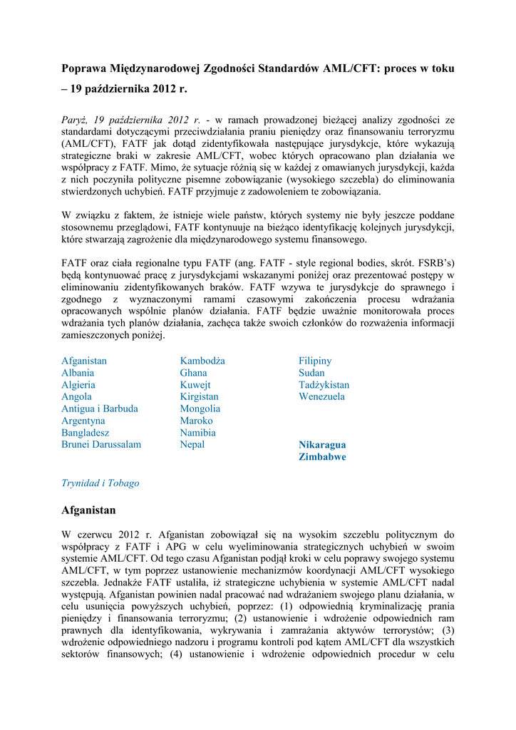 Poprawa Międzynarodowej Zgodności Standardów AML/CFT: proces w toku – 19 października 2012 r. ParyŜ, 19 października 2012 r. - w ramach prowadzonej bieŜącej analizy zgodności ze standardami dotyczącymi przeciwdziałania praniu pieniędzy oraz finansowaniu terroryzmu (AML/CFT), FATF jak dotąd zidentyfikowała następujące jurysdykcje, które wykazują strategiczne braki w zakresie AML/CFT, wobec których opracowano plan działania we współpracy z FATF. Mimo, Ŝe sytuacje róŜnią się w kaŜdej z omawianych jurysdykcji, kaŜda z nich poczyniła polityczne pisemne zobowiązanie (wysokiego szczebla) do eliminowania stwierdzonych uchybień. FATF przyjmuje z zadowoleniem te zobowiązania. W związku z faktem, Ŝe istnieje wiele państw, których systemy nie były jeszcze poddane stosownemu przeglądowi, FATF kontynuuje na bieŜąco identyfikację kolejnych jurysdykcji, które stwarzają zagroŜenie dla międzynarodowego systemu finansowego. FATF oraz ciała regionalne typu FATF (ang. FATF - style regional bodies, skrót. FSRB’s) będą kontynuować pracę z jurysdykcjami wskazanymi poniŜej oraz prezentować postępy w eliminowaniu zidentyfikowanych braków. FATF wzywa te jurysdykcje do sprawnego i zgodnego z wyznaczonymi ramami czasowymi zakończenia procesu wdraŜania opracowanych wspólnie planów działania. FATF będzie uwaŜnie monitorowała proces wdraŜania tych planów działania, zachęca takŜe swoich członków do rozwaŜenia informacji zamieszczonych poniŜej. Afganistan Albania Algieria Angola Antigua i Barbuda Argentyna Bangladesz Brunei Darussalam KambodŜa Ghana Kuwejt Kirgistan Mongolia Maroko Namibia Nepal Filipiny Sudan TadŜykistan Wenezuela Nikaragua Zimbabwe Trynidad i Tobago Afganistan W czerwcu 2012 r. Afganistan zobowiązał się na wysokim szczeblu politycznym do współpracy z FATF i APG w celu wyeliminowania strategicznych uchybień w swoim systemie AML/CFT. Od tego czasu Afganistan podjął kroki w celu poprawy swojego systemu AML/CFT, w tym poprzez ustanowienie mechanizmów koordynacji AML/CFT wysokiego szczebla. JednakŜe FATF ustaliła, iŜ strategiczne uchybienia w systemie AML/CFT nadal występują. Afganistan powinien nadal pracować nad wdraŜaniem swojego planu działania, w celu usunięcia powyŜszych uchybień, poprzez: (1) odpowiednią kryminalizację prania pieniędzy i finansowania terroryzmu; (2) ustanowienie i wdroŜenie odpowiednich ram prawnych dla identyfikowania, wykrywania i zamraŜania aktywów terrorystów; (3) wdroŜenie odpowiedniego nadzoru i programu kontroli pod kątem AML/CFT dla wszystkich sektorów finansowych; (4) ustanowienie i wdroŜenie odpowiednich procedur w celu konfiskowania aktywów związanych z praniem pieniędzy; (5) utworzenie w pełni funkcjonalnej i efektywnie działającej jednostki analityki finansowej; oraz (6) ustanowienie i wdroŜenie skutecznej kontroli w odniesieniu do transgranicznych transakcji gotówkowych. FATF zachęca Afganistan do eliminowania pozostałych uchybień i kontynuowania procesu wdraŜania swojego planu działania. Albania W czerwcu 2012 r. Albania zobowiązała się na wysokim szczeblu politycznym do współpracy z FATF i MONEYVAL w celu wyeliminowania strategicznych uchybień w systemie AML/CFT. Od tego czasu Albania podjęła kroki w kierunku poprawy swojego systemu AML/CFT poprzez uchwalenie prawodawstwa w celu wdroŜenia odpowiednich wytycznych w zakresie środków bezpieczeństwa finansowego (ang. CDD – customer due diligence). JednakŜe FATF ustaliła, iŜ strategiczne uchybienia w systemie AML/CFT nadal występują. Albania powinna pracować nad wdraŜaniem swojego planu działania w celu usunięcia powyŜszych uchybień, poprzez: (1) ustanowienie i wdroŜenie odpowiednich ram prawnych w celu identyfikowania, wykrywania i zamraŜania aktywów terrorystów; oraz (2) wzmocnienie ram współpracy międzynarodowej związanych z finansowaniem terroryzmu. FATF zachęca Albanię do wyeliminowania pozostałych uchybień i kontynuowania procesu wdraŜania swojego planu działania. Algieria W październiku 2011 r. Algieria zobowiązała się na wysokim szczeblu politycznym do współpracy z FATF i MENAFATF w celu wyeliminowania strategicznych uchybień w systemie AML/CFT. Od tego czasu Algieria podjęła kroki w kierunku poprawy swojego systemu AML/CFT, w tym poprzez rozszerzenie katalogu podmiotów finansowych podlegających wymogom sprawozdawczym, zapewniając prawną autonomię jednostkom analityki finansowej i rozszerzenie ich uprawnień do Ŝądania informacji i dzielenia się nimi z innymi właściwymi organami. JednakŜe FATF ma obawy, iŜ niektóre strategiczne uchybienia w systemie AML/CFT nadal występują, w związku z tym istnieje potrzeba większego zaangaŜowania Algierii w celu wyjaśnienia, czy uchybienia te zostały uwzględnione. Algieria powinna kontynuować prace nad wdraŜaniem swojego planu działania, poprzez: (1) stosowną kryminalizację finansowania terroryzmu; (2) ustanowienie i wdroŜenie stosownych ram prawnych dla identyfikowania, wykrywania i zamraŜania aktywów terrorystów; (3) usprawnienie oraz rozszerzenie zakresu stosowanych środków bezpieczeństwa finansowego; oraz (4) zapewnienie pełnej funkcjonalności i efektywności działania jednostki analityki finansowej. FATF zachęca Algierię do eliminowania uchybień i kontynuowania procesu wdraŜania swojego planu działania. Angola W czerwcu 2010 r. Angola zobowiązała się na wysokim szczeblu politycznym do współpracy z FATF w celu wyeliminowania strategicznych uchybień w systemie AML/CFT. Od czerwca 2012 r. Angola podjęła kroki w kierunku poprawy swojego systemu AML/CFT. JednakŜe FATF ustaliła, iŜ niektóre strategiczne uchybienia w systemie AML/CFT nadal występują. Angola powinna kontynuować prace nad wdraŜaniem swojego planu działania, w celu usunięcia powyŜszych uchybień, poprzez: (1) stosowną kryminalizację prania pieniędzy i finansowania terroryzmu; (2) zapewnien