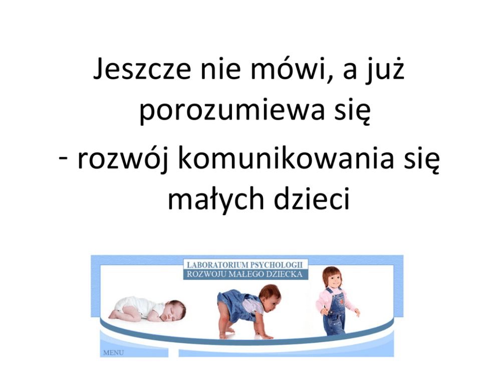 Jeszcze nie mówi, a już porozumiewa się - rozwój komunikowania się małych dzieci Pierwsze miesiące życia dziecka 1. interakcje twarzą w twarz z opiekunem Pierwsze miesiące życia dziecka 1. interakcje twarzą w twarz z opiekunem • dziecko jest wyczulone na przebieg interakcji – to „taniec”, „rozmowa” (dynamiczna koregulacja) dopasowujących się do siebie partnerów – zachowanie dziecka jest odpowiedzią na zachowanie opiekuna – ale dziecko rozpoznaje także, że opiekun reaguje na jego działania (rozpoznaje zależność pomiędzy własnym zachowaniem a reakcjami opiekuna) Pierwsze miesiące życia dziecka 1. interakcje twarzą w twarz z opiekunem 2. zabawa przedmiotem – aktywnie eksploruje – powtarza interesujące rezultaty Ograniczenia wczesnych aktywności • dziecko nie jest w stanie zaangażować się jednocześnie w obie aktywności i np. wspólnie z opiekunem bawić się przedmiotem • albo opiekun albo zabawka DZIECKO OPIEKUN / OPIEKUN PRZEDMIOT Pod koniec pierwszego roku życia • opiekun spogląda w danym kierunku, dziecko patrzy w tym samym kierunku – podążanie za spojrzeniem • opiekun daje dziecku zabawkę – dziecko mu ją oddaje – naprzemienna wymiana przedmiotów Pod koniec pierwszego roku życia DZIECKO OPIEKUN • pojawia się trzeci element – początek relacji trójelementowych • dziecko i opiekun wspólnie spoglądają na ten sam przedmiot, podają sobie go, bawią się nim • pierwsze wizyty w laboratorium Uczestnicząc w relacjach trójelementowych dziecko i dorosły wspólnie skupiają się na elemencie otoczenia > Jest to początek porozumienia się odnoszącego się do otoczenia (szerzej za chwilę) Dla dorosłych są to bardzo proste, oczywiste aktywności, ale w rozwoju dzieci mają one przełomowe znaczenie co można ukazać przyjmując międzygatunkową perspektywę porównawczą Zachowania są nieobecne u innych naczelnych np. szympansy • nie podają sobie naprzemiennie przedmiotów • nie posługują się gestami wskazującymi • nie podążają za spojrzeniem, choć podążają za ułożeniem ciała i głowy – dlaczego szympansy nie podążają za spojrzeniem? Budowa oczu naczelnych • tylko ludzie posiadają białą twardówkę i wyraźnie widoczne tęczówkę i źrenicę • tylko u ludzi na podstawie skierowania gałek ocznych możliwe jest rozpoznanie kierunku spojrzenia na przedmiot Widoczny kierunek spojrzenia – kontakt wzrokowy i wymiana spojrzeń • u szympansów niewidoczny > korzystne w rywalizacji Dlaczego ludzkie oczy mają taką budowę? • u ludzi oczy zaczęły pełnić funkcję komunikacyjne • „chcę byś widział na co spoglądam, gdyż wtedy będziemy mogli wspólnie się na tym skupić” • „popatrz na co patrzę” Widoczny kierunek spojrzenia – kontakt wzrokowy i wymiana spojrzeń • nawiązanie kontaktu wzrokowego i wymiana spojrzeń skierowanych na obiekt lub zdarzenie > to forma komunikowania, porozumiewania się > „porozumiewawcze spojrzenia” • obecne w rozwoju przed posługiwaniem słowami • jest podobne do języka oraz stanowi podstawę jego opanowywania – podobieństwo … Podzielanie uwagi i zainteresowania widocznym przedmiotem kontakt wzrokowy + podążanie za spojrzeniem > wspólnie skupiamy się na przedmiocie „widzę, że widzisz jabłko i widzisz, że ja je widzę” zdajemy sobie sprawę, że wspólnie skupiamy się na tym przedmiocie Użycie języka to podzielanie uwagi i zainteresowania niewidocznym przedmiotem • podobny proces zachodzi, gdy posługujemy się językiem • „podążamy” za cudzą wypowiedzią i wspólnie skupiamy się na tym samym znaczeniu „jabłko” „Kiedy palec wskazuje na księżyc, tylko głupiec patrzy na palec” chińskie przysłowie Rozumienie, że gest wskazujący jest skierowany na przedmiot lub zdarzenie, to nie jest trywialna umiejętność Dzieci także same wykonują gesty wskazujące Gesty wskazujące umożliwiają nieposiadającym jeszcze mowy dzieciom porozumiewanie się Dzieci wykonują gesty wskazujące w celu – zażądania czegoś – oznajmienia czegoś lub dostarczenia informacji czyli realizują tę samą funkcję, co słowa Gesty są podobne do języka także w tym, że – kierują uwagę innej osoby na przedmiot lub zdarzenie – odnoszą się do przedmiotów lub zdarzeń np. można poinformować kogoś, gdzie spadła teczka • dziecko dostarcza badaczowi informacji o lokalizacji teczki • interpretuje zdziwienie badacza jako wynikające z braku wiedzy o lokalizacji teczki • czyli dziecko rozpoznaje stany umysłowe innej osoby oraz chce ją poinformować • informowanie za pomocą gestów stopniowo rozwija się w realizowane za pomocą połączenia gestu wskazującego i słowa > to dodatkowo ukazuje związek gestów i języka • dziecko informuje (gest + słowo) badacza o pojawieniu się poszukiwanej ilustracji (nie jakiejkolwiek ilustracji) • badacz błędnie rozumie komunikat dziecka > dziecko ponawia komunikaty (gesty + słowa) w następstwie bycia niezrozumianym > rozpoznaje, że ktoś je źle zrozumiał • dziecko informuje (słowa) badacza o przeszłości > wyższość języka nad gestami Podsumowując … • Przedjęzykowe formy porozumiewania się (kontakt wzrokowy, wymiana spojrzeń skierowanych na przedmiot, posługiwanie się gestami wskazującymi) są zasadnicze dla rozwoju (1) komunikacyjnego oraz (2) społeczno-poznawczego (1) umożliwiają wspólne skupienie się (odniesienie się) do tego samego przedmiotu lub zdarzenia • oboje widzimy ten sam przedmiot lub zdarzenie > wspólnie się nim interesujemy > wspólnie o nim wiemy (2) udział w relacjach trójelementowych to początek rozumienia drugiego człowieka W ich ramach dzieci zaczynają doświadczać odrębności siebie i innej osoby co pozwala im np. zrozumieć, że choć same widziały jak spadała teczka, to inna osoba tego nie widziała i stąd nie wie gdzie teczka aktualnie się znajduje lub że cho