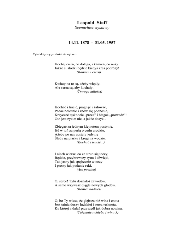 Leopold Staff Scenariusz wystawy 14.11. 1878 - 31.05. 1957 Cytat dotyczący całości do wyboru: Kochaj cierń, co dolega, i kamień, co nuży. Jakże ci słodki będzie kiedyś kres podróży! (Kamień i cierń) Kwiaty na to są, ażeby więdły, Ale serca są, aby kochały. (Trwoga miłości) Kochać i tracić, pragnąć i żałować, Padać boleśnie i znów się podnosić, Krzyczeć tęsknocie „precz” i błagać „prowadź”! Oto jest życie: nic, a jakże dosyć... Zbiegać za jednym klejnotem pustynie, Iść w toń za perłą o cudu urodzie, Ażeby po nas zostały jedynie Ślady na piasku i kręgi na wodzie. (Kochać i tracić...) I niech wiersz, co ze strun się toczy, Będzie, przybrawszy rytm i dźwięki, Tak jasny jak spojrzenie w oczy I prosty jak podanie ręki. (Ars poetica) O, serce! Tylu doznałoś zawodów, A samo wzywasz ciągle nowych głodów. (Koniec nadziei) O, bo Ty wiesz, że głębsza niż wina i cnota Jest tajnia duszy ludzkiej i serca tęsknota, Ku której z dalaś przyszedł jak dobra nowina. (Tajemnica chleba i wina 3) Leopold Staff urodził się 14.11.1878 we Lwowie, zmarł 31.05.1957 w SkarżyskuKamiennej, poeta, dramatopisarz, tłumacz. Studiował w latach 1897-1901 na Uniwersytecie Lwowskim prawo, następnie filozofię pod kierunkiem K. Twardowskiego i romanistykę na seminarium E. Porębowicza. W okresie studiów należał do Stowarzyszenia Czytelni Akademickiej, działając w Kółku Literackim wespół z W. Kozickim, S.A. Muellerem i O. Ortwinem, z którym łączyła go wieloletnia, inspirująca przyjaźń. Brał też udział w redakcji wydawanego w Krakowie pisma akademickiego „Młodość” (1898-99); w tym okresie zetknął się ze współczesną literaturą europejską, m.in. z pismami Nietzschego – co odegrało znaczną rolę w kształtowaniu postawy młodego poety. Był ponadto uczestnikiem zebrań artystyczno - literackich w domu Maryli Wolskiej. Edukację pogłębił Staff przez liczne podróże do Włoch oraz roczny pobyt w Paryżu (1902-03). W latach 1909-14 redagował w Księgarni Polskiej Połonieckiego bibliotekę Symposion. Lata wojny (1915-18) spędził w Charkowie. Od 1918 mieszkał w Warszawie. W latach 1920-21 był współredaktorem, m.in. z Wacławem Berentem, miesięcznika „Nowy Przegląd Literatury i Sztuki”. Członek PAL od 1933 (1934-39 wiceprezes). Okres okupacji (łącznie z powstaniem), a następnie lata 1949-57 spędził w Warszawie (w czasie tułaczko popowstaniowej przebywał do 1949 w Pławowicach i Krakowie). Dwukrotny laureat państwowej nagrody literackiej (1927 i 1951), ponadto nagrody Lwowa (1929) i Warszawy (1938) oraz nagrody Pen Clubu za całokształt twórczości przekładowej. Doktor h.c. UW (1939) i UJ (1949), w 1948 r. uczczony jubileuszem 50-lecia twórczości. Pochowany na warszawskich Powązkach1. WYSTAWKA I Filozofia życia „Już Sny o potędze, a w jeszcze większym stopniu dwa następne tomy: Dzień duszy (1903) i Ptakom niebieskim (1905), zawierały pochwałę życia w każdej postaci. Podejmowały próbę pojednania człowieka z otaczającym go wszechświatem, uczyły wspaniałomyślnej akceptacji cierpienia i zachęcały do odwagi w zmaganiach z losem”2. Czciciel gwiazd i mądrości, miłośnik ogrodów, Wyznawca snów i piękna i uczestnik godów, Na które swych wybrańców sprasza sztuka boska: Znam gorycz i zawody, wiem, co ból i troska, Złuda miłości, zwątpień mrok, tęsknot rozbicia, A jednak śpiewać będę wam pochwałę życia – Bo żyłem długo w górach i mieszkałem w lasach. Pamięcią swe dni chmurne i dni w słońca krasach Przechodzę, jakby jakieś wielkie, dziwne miasta, Z myślą ciężką, jak z dzbanem na głowie niewiasta, A dzban wino ukrywa i łzy w swojej cieśni. Kochałem i wiem teraz, skąd się rodzą pieśni; Widziałem konających w nadziejnej otusze I kobiety przy studniach brzemienne, jak grusze; Szedłem przez pola żniwne i mogilne kopce, 1 2 Por. Literatura polska XX wieku. T.2. Warszawa 2003. s.162. J. Tomkowski, Młoda Polska. Warszawa 2001. s.130. Żyłem i z rzeczy ludzkich nic nie jest mi obce. Przeto myśli me, są pogodne jako starce w sadzie. I uczę miłowania, radości w uśmiechu, W łzach widzieć słodycz smutną, dobroć chorą w grzechu, I pochwalam tajń życia w pieśni i w milczeniu, Pogodny mądrym smutkiem i wprawny w cierpieniu. (Przedśpiew) W swoich kolejnych zbiorkach poezji stworzył Staff symboliczne kreacje mocarzy, zdobywców, a przede wszystkim wędrowców. Kreacja człowieka-wędrowca i pielgrzyma wielokrotnie powtarzana i modyfikowana stała się symboliczną nosicielką sensów filozoficznych jego liryki. Bohaterowie-wędrowcy formułowali ideę wiecznego dążenia i szukania szczęścia3. Czemu patrzycie, oczy moje, zza mgły łez Na ostatniego słońca konanie? Czemu was tak przykuwa jego krew i kres, Chociaż w źrenicach boli jak ostry jad w ranie? Czy wam nie dość, że długi słoneczny był dzień, Nie dość skryć go radośnie wśród pamięci schronu, Zasłonić dłonią oczy, nim zapadnie cień? Czy wszelką radość płaci się smutkiem jej zgonu? Nie całujcie, me wargi, na rozstanie ust, Z których nigdy ostatnich nie piło się miodów. Dreszcz rozkoszy się stanie dwojgiem cierpkich bruzd I ciepłą pamięć czoła zetnie w smutek chłodów. Czy tak bezdennie wielką jest tęsknoty głąb, Aby niedosyt życia pełnić z śmierci plonu? Iść ścieżką, aż zawiedzie nad przepaści zrąb, Czy wszelką radość płaci się smutkiem jej zgonu? Między pieśnią przerwaną a zbudzonym echem, Falą i nagą stopą, co wnet się zanurzy, Przyjściem listu i zdjęciem pieczęci z pośpiechem, Pomiędzy zaproszeniem i rankiem podróży, Między wzniesioną dłonią a owocem drzew Śpi szczęście, co najsłodsze dreszcze daje łonu, Między wargą a czarą, gdzie wina lśni krew... Lecz wszelką radość płaci się smutkiem jej zgonu. (Radość i smutek szczęścia i chwili V) „Tym jednak, co inter
