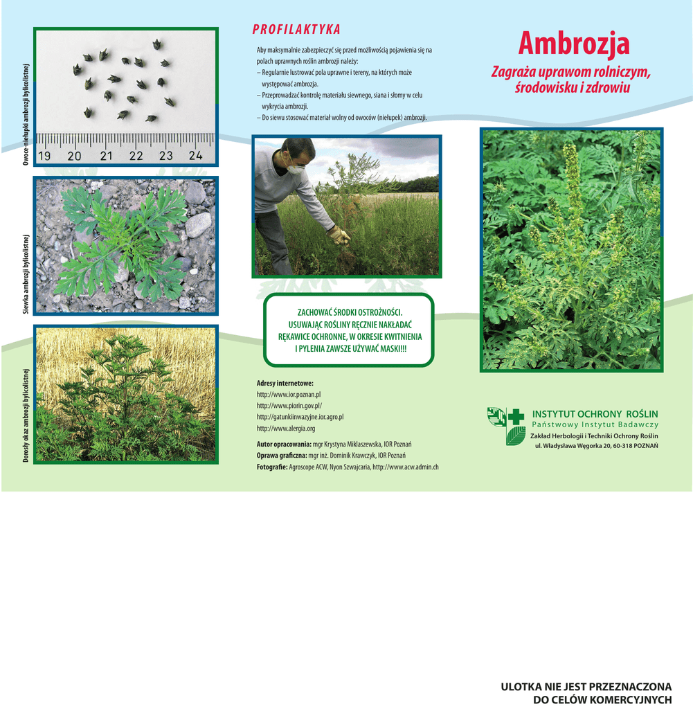 Dorosły okaz ambrozji bylicolistnej Siewka ambrozji bylicolistnej Owoce-niełupki ambrozji bylicolistnej PROFILAKT YKA Aby maksymalnie zabezpieczyć się przed możliwością pojawienia się na polach uprawnych roślin ambrozji należy: – Regularnie lustrować pola uprawne i tereny, na których może występować ambrozja. – Przeprowadzać kontrolę materiału siewnego, siana i słomy w celu wykrycia ambrozji. – Do siewu stosować materiał wolny od owoców (niełupek) ambrozji. Ambrozja Zagraża uprawom rolniczym, środowisku i zdrowiu ZACHOWAĆ ŚRODKI OSTROŻNOŚCI. USUWAJĄC ROŚLINY RĘCZNIE NAKŁADAĆ RĘKAWICE OCHRONNE, W OKRESIE KWITNIENIA I PYLENIA ZAWSZE UŻYWAĆ MASKI!!! Adresy internetowe: http://www.ior.poznan.pl http://www.piorin.gov.pl/ http://gatunkiinwazyjne.ior.agro.pl http://www.alergia.org Autor opracowania: mgr Krystyna Miklaszewska, IOR Poznań Oprawa graficzna: mgr inż. Dominik Krawczyk, IOR Poznań Fotografie: Agroscope ACW, Nyon Szwajcaria, http://www.acw.admin.ch INSTYTUT OCHRONY ROŚLIN Pa ń s t w o w y I n s t y t u t B a d a w c z y Zakład Herbologii i Techniki Ochrony Roślin ul. Władysława Węgorka 20, 60-318 POZNAŃ ULOTKA NIE JEST PRZEZNACZONA DO CELÓW KOMERCYJNYCH SZKODLIWOŚĆ Pyłek ambrozji może przebyć wielkie odległości Rośliny z rodzaju Ambrozja należą do rodziny astrowatych (Asteraceae). Cechą charakterystyczną Ambrozji jest silne alergogenne działanie pyłku. Ponad 12% populacji ludzkiej wykazuje wrażliwość na pyłki tej rośliny, objawiającą się wysoką gorączką, astmą itp. Już 5–10 ziarenek pyłku ambrozji w 1 m3 powietrza może spowodować silne uczulenie. Szkodliwość Ambrozji jako chwastu przejawia się konkurencją z rośliną uprawną o światło, wodę i składniki pokarmowe. Chwasty z rodzaju Ambrosia, ze względu na swoje duże możliwości adaptacyjne i wysoką konkurencyjność w stosunku do innych roślin mogą zagrozić różnorodności biologicznej na opanowywanych terenach poprzez wypieranie gatunków endemicznych. Wraz ze zmianami klimatycznymi możliwe jest osiedlanie się ambrozji na nowych terenach. Rodzaj Ambrosia obejmuje około 40 gatunków. Największe zagrożenie mogą stanowić trzy z nich: – Ambrosia artemisiifolia L. – ambrozja bylicolistna – Ambrosia trifida L. – ambrozja trójdzielna – Ambrosia psilostachya DC – ambrozja zachodnia Uprawom rolniczym najbardziej zagraża ambrozja bylicolistna Roślina jednoroczna, bez odrośli. Łodyga o wysokości od 30 do 200 cm, kosmato owłosiona, kanciasta, lekko bruzdkowana. Większe liście pierzastodzielne, także górne na ogonkach. Górna strona liści ciemnozielona, dolna – szarawa. Koszyczki żeńskie po 5–6 w pęczku, z około 1,2 mm długim dzióbkiem i 4–7 cierniami, . Okrywa koszyczków męskich naga lub słabo owłosiona. Kwitnie od sierpnia do października. Owocem jest niełupka otoczona szarobrązową osłoną kształtu odwrotnie jajowatego, u podstawy klinowato zwężona, z siatkowanym rysunkiem na powierzchni. Wokół wierzchołkowej części osłony 5–10 drobnych wyrostków (do 1 mm długości) oraz jeden wyraźny wyrostek położony centralnie. Wymiary osłony: długość 2,2–5,1 mm; szerokość 1,5–2,5 mm; grubość 1,4–2,5 mm. Występuje głównie na suchych murawach i przydrożach. Może zachwaszczać wszystkie uprawy polowe. Spotykana w pobliżu ciągów komunikacyjnych oraz brzegów wód. Owoce ambrozji bylicolistnej najczęściej można spotkać w ziarnie zbóż, kukurydzy, nasionach soi i słonecznika oraz śrutach paszowych. Z WALCZ ANIE Do zwalczania ambrozji bylicolistnej w uprawach rolniczych w Polsce zarejestrowanych jest obecnie kilka substancji biologicznie czynnych. Do zwalczania tego chwastu w uprawach buraka zaleca się stosować chlopyralid (Cliophar 300 SL, Faworyt 300 SL, Lontrel 300 SL), herbicydy te zalecane są również do stosowania w uprawach rzepaku. Faworyt 300 SL można ponadto zastosować w kukurydzy, zaś Lontrel 300 SL w jęczmieniu jarym i ozimym, pszenicy jarej i ozimej oraz w pszenżycie. Chlopyralid wraz z pikloramem, dwie substancje biologicznie aktywne zawarte w herbicydzie Galera 334 SL zaleca się w uprawach rzepaku. W zasiewach pszenicy jarej, jęczmienia jarego, pszenicy ozimej i jęczmienia ozimego w celu zwalczania ambrozji zastosowany może być 2,4-D (Esteron 564 EC). W zbożach ozimych (pszenica, jęczmień, pszenżyto) zalecany jest Kantor 050 SC, zawierający jako substancję czynną florasulam. Ambrozja bylicolistna pojawiająca się w uprawach ziemniakach skutecznie może być zwalczana substancją oksadiargil (Raft 400 SC). HERBICYDY Z A W S Z E NALEŻY STOSOWAĆ ZGODNIE Z ZALECENIAMI ZAWARTYMI W ETYKIETACH – INSTRUKCJACH!! AMBROZJĘ ŁATWO POMYLIĆ Z BYLICĄ POSPOLITĄ LUB KOMOSĄ BIAŁĄ Owoce (niełupki) rodzaju ambrozja, przez które chwast się rozmnaża, mają bardzo dużą zdolność przetrwania niekorzystnych do kiełkowania warunków (niskie temperatury zimowe w Polsce). Nasiona (owoce) mogą zalegać w glebie przez wiele lat nie tracąc zdolności kiełkowania. Ambrozji najbardziej odpowiada klimat umiarkowany, ciepły, kontynentalny. Wymaga dużej ilości światła, dlatego rośnie w miejscach nasłonecznionych i ciepłych. Najlepiej rośnie na glebach suchych i świeżych, umiarkowanie żyznych i żyznych, luźnych, o niskiej zawartości humusu i o odczynie słabo kwaśnym lub obojętnym. Jednakże roślina ma bardzo duże zdolności adaptacyjne i następuje powolne rozprzestrzenianie się ambrozji na północ Europy w nieco zimniejsze warunki klimatyczne. POJEDYNCZYCH EGZEMPLARZY AMBROZJI NIE ZWALCZAĆ CHEMICZNIE LECZ MECHANICZNIE! Niewielkie ogniska chwastów zniszczyć przez wykopanie roślin wraz z całym systemem korzeniowym i spalenie. Zwarte ogniska roślin ambrozji zniszczyć przez wypalenie. Zwalczać w fazie intensywnego wzrostu, przed kwitnieniem. Po zwalczeniu na polu stosować zabiegi agrotechniczne: – pole przeznaczyć n