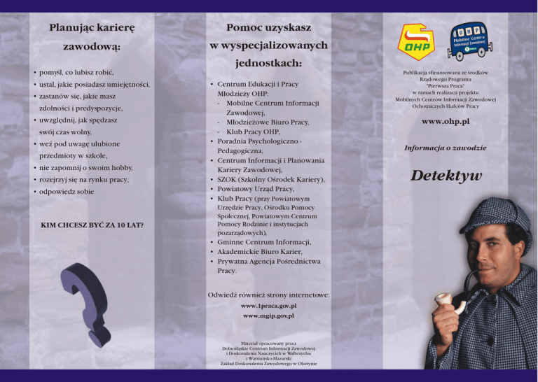 Planuj¹c karierê Pomoc uzyskasz zawodow¹: w wyspecjalizowanych jednostkach: • pomyœl, co lubisz robiæ, • ustal, jakie posiadasz umiejêtnoœci, • zastanów siê, jakie masz zdolnoœci i predyspozycje, • uwzglêdnij, jak spêdzasz swój czas wolny, • weŸ pod uwagê ulubione przedmioty w szkole, • nie zapomnij o swoim hobby, • rozejrzyj siê na rynku pracy, • odpowiedz sobie KIM CHCESZ BYÆ ZA 10 LAT? • Centrum Edukacji i Pracy M³odzie¿y OHP: - Mobilne Centrum Informacji Zawodowej, - M³odzie¿owe Biuro Pracy, - Klub Pracy OHP, • Poradnia Psychologiczno Pedagogiczna, • Centrum Informacji i Planowania Kariery Zawodowej, • SZOK (Szkolny Oœrodek Kariery), • Powiatowy Urz¹d Pracy, • Klub Pracy (przy Powiatowym Urzêdzie Pracy, Oœrodku Pomocy Spo³ecznej, Powiatowym Centrum Pomocy Rodzinie i instytucjach pozarz¹dowych), • Gminne Centrum Informacji, • Akademickie Biuro Karier, • Prywatna Agencja Poœrednictwa Pracy. OdwiedŸ równie¿ strony internetowe: www.1praca.gov.pl www.mgip.gov.pl Materia³ opracowany przez Dolnoœl¹skie Centrum Informacji Zawodowej i Doskonalenia Nauczycieli w Wa³brzychu i Warmiñsko-Mazurski Zak³ad Doskonalenia Zawodowego w Olsztynie Publikacja sfinansowana ze œrodków Rz¹dowego Programu "Pierwsza Praca" w ramach realizacji projektu Mobilnych Centrów Informacji Zawodowej Ochotniczych Hufców Pracy www.ohp.pl Informacja o zawodzie Detektyw Funkcje i zadania: Predyspozycje do zawodu Praca detektywa polega na zdobywaniu, gromadzeniu, i analizowaniu informacji w celu ustalenia zdarzeñ i okolicznoœci zwi¹zanych ze zleconymi mu sprawami. Informacje te dotyczyæ mog¹ zarówno firm i przedsiêbiorstw, jak te¿ byæ zlecane przez prywatnych klientów. Zadania, jakich podejmuje siê detektyw, czêsto s¹ niebezpieczne i skomplikowane, dlatego wa¿ne jest, aby posiada³ on umiejêtnoœæ analizowania faktów, wyci¹gania wniosków, budowania hipotez i wersji dochodzeniowych. Zasiêg dzia³ania prywatnego detektywa jest bardzo szeroki i najczêœciej obejmuje: • wykrywanie oszustw (pozorowane kradzie¿e, w³amania, wypadki drogowe), • sprawy rodzinne (zdrady ma³¿eñskie, sprawy spadkowe i alimentacyjne), • zbieranie informacji gospodarczych poprzez wywiady i gromadzenie dokumentów (sprawdzanie wiarygodnoœci firm i osób), Detektyw powinien równie¿ charakteryzowaæ siê: • cierpliwoœci¹ i odpornoœci¹ psychiczn¹ (kilkugodzinne obserwacje), • spostrzegawczoœci¹, czujnoœci¹ i zdolnoœci¹ do interpretacji postrzeganych zdarzeñ i faktów, • bardzo dobr¹ sprawnoœci¹ ruchow¹ i wydolnoœci¹ fizyczn¹, • rewindykacjê nale¿noœci (doprowadzenie do zwrotu d³ugu wierzycielowi przez d³u¿nika), • umiejêtnoœciami interpersonalnymi (taktowne zachowanie, pogodne nastawienie, umiejêtnoœæ s³uchania drugiej osoby, prowadzenie negocjacji), • sprawy kryminalne (np. poszukiwania skradzionych samochodów). • dyskrecj¹ (zachowanie tajemnicy, wygl¹d przeciêtnego cz³owieka). Wiêcej szczegó³ów znajdziesz w teczce informacji o zawodzie Mo¿liwoœci zdobycia zawodu: Prywatny detektyw powinien legitymowaæ siê co najmniej œrednim wykszta³ceniem, jednak absolwenci szkó³ wy¿szych, w szczególnoœci takich specjalizacji, jak: ekonomia, informatyka, prawo czy bankowoœæ, maj¹ zdecydowanie lepszy start i wiêksze szanse na osi¹gniêcie sukcesu. W Polsce nie ma szkó³, które przygotowuj¹ do wykonywania tego zawodu. Kwalifikacje detektywa mo¿na zdobyæ, koñcz¹c kurs dla agentów ochrony osób i mienia. Szkolenia trwaj¹ od 4 miesiêcy do 2 lat, po z³o¿eniu egzaminu, s³uchacz otrzymuje œwiadectwo, które upowa¿nia go do ubiegania siê o koncesjê na prowadzenie w³asnej firmy ochroniarsko-detektywistycznej.