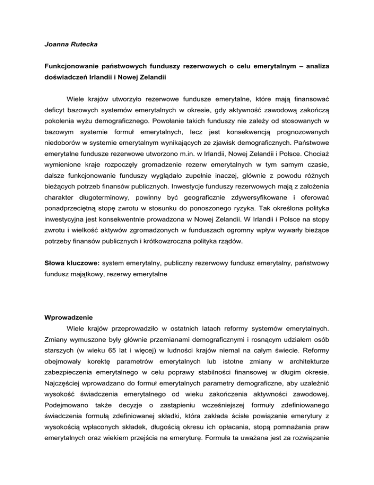 Joanna Rutecka Funkcjonowanie państwowych funduszy rezerwowych o celu emerytalnym – analiza doświadczeń Irlandii i Nowej Zelandii Wiele krajów utworzyło rezerwowe fundusze emerytalne, które mają finansować deficyt bazowych systemów emerytalnych w okresie, gdy aktywność zawodową zakończą pokolenia wyżu demograficznego. Powołanie takich funduszy nie zależy od stosowanych w bazowym systemie formuł emerytalnych, lecz jest konsekwencją prognozowanych niedoborów w systemie emerytalnym wynikających ze zjawisk demograficznych. Państwowe emerytalne fundusze rezerwowe utworzono m.in. w Irlandii, Nowej Zelandii i Polsce. Chociaż wymienione kraje rozpoczęły gromadzenie rezerw emerytalnych w tym samym czasie, dalsze funkcjonowanie funduszy wyglądało zupełnie inaczej, głównie z powodu różnych bieżących potrzeb finansów publicznych. Inwestycje funduszy rezerwowych mają z założenia charakter długoterminowy, powinny być geograficznie zdywersyfikowane i oferować ponadprzeciętną stopę zwrotu w stosunku do ponoszonego ryzyka. Tak określona polityka inwestycyjna jest konsekwentnie prowadzona w Nowej Zelandii. W Irlandii i Polsce na stopy zwrotu i wielkość aktywów zgromadzonych w funduszach ogromny wpływ wywarły bieżące potrzeby finansów publicznych i krótkowzroczna polityka rządów. Słowa kluczowe: system emerytalny, publiczny rezerwowy fundusz emerytalny, państwowy fundusz majątkowy, rezerwy emerytalne Wprowadzenie Wiele krajów przeprowadziło w ostatnich latach reformy systemów emerytalnych. Zmiany wymuszone były głównie przemianami demograficznymi i rosnącym udziałem osób starszych (w wieku 65 lat i więcej) w ludności krajów niemal na całym świecie. Reformy obejmowały korektę parametrów emerytalnych lub istotne zmiany w architekturze zabezpieczenia emerytalnego w celu poprawy stabilności finansowej w długim okresie. Najczęściej wprowadzano do formuł emerytalnych parametry demograficzne, aby uzależnić wysokość świadczenia emerytalnego od wieku zakończenia aktywności zawodowej. Podejmowano także decyzje o zastąpieniu wcześniejszej formuły zdefiniowanego świadczenia formułą zdefiniowanej składki, która zakłada ścisłe powiązanie emerytury z wysokością wpłaconych składek, długością okresu ich opłacania, stopą pomnażania praw emerytalnych oraz wiekiem przejścia na emeryturę. Formuła ta uważana jest za rozwiązanie zapewniające stabilność finansową systemu emerytalnego w długim okresie, gdyż system nie obiecuje więcej, niż faktycznie wypracuje1. Systemy o zdefiniowanej składce pomagają dostosować wielkość wpływów i wydatków emerytalnych w perspektywie długoterminowej, nie są jednak w stanie rozwiązać wszystkich problemów związanych ze zjawiskami demograficznymi. Aby złagodzić skutki okresowych zmian w relacji pomiędzy liczbą osób aktywnych zawodowo a liczbą osób pobierających świadczenia emerytalne, wynikających z tzw. falowania demograficznego, w ramach publicznych systemów emerytalnych powoływane są specjalne fundusze rezerwowe. Fundusze te mają gromadzić środki w okresie relatywnie dobrej sytuacji demograficznej (relatywnie większej liczby pracujących w stosunku do liczby świadczeniobiorców) i wspomagać system emerytalny w latach, gdy relacja ta ulegnie znacznemu pogorszeniu. Fundusze takie zostały utworzone m.in. w Norwegii, Japonii, Australii, Polsce, Francji, Irlandii i Nowej Zelandii2. Celem artykułu jest dokonanie analizy funkcjonowania emerytalnych funduszy rezerwowych w dwóch wybranych krajach: Irlandii i Nowej Zelandii. Kraje te, choć powołały fundusze rezerwowe w tym samym czasie, zastosowały odmienne podejście do możliwości wykorzystania zgromadzonych środków. W końcowej części artykułu doświadczenia Irlandii i Nowej Zelandii odniesione zostaną do praktyki przedterminowego wykorzystania środków zgromadzonych w polskim funduszu rezerwowym o celu emerytalnym – Funduszu Rezerwy Demograficznej. 1. Państwowy Rezerwowy Fundusz Emerytalny w Irlandii 1.1. Geneza powstania i zasady funkcjonowania funduszu Państwowy Rezerwowy Fundusz Emerytalny (National Pension Reserve Fund, NPRF) jest publicznym funduszem emerytalnym utworzonym przez Republikę Irlandii w 2001 r. Głównym powodem utworzenia funduszu były prognozy wskazujące na gwałtowny wzrost wydatków na świadczenia emerytalne w ciągu kolejnych dekad. Prognozy te wskazywały, że wydatki emerytalne z powszechnego zabezpieczenia emerytalnego oraz z systemu emerytalnego pracowników sektora publicznego wzrosną z ok. 5% PKB w 2007 r. do 7,6% w 2025 r. i 13% PKB w 2050 r.3 Celem funduszu jest wsparcie systemu ubezpieczeń społecznych oraz systemu emerytalnego w okresie od 2025 r. do co najmniej 2055 r.4 1 M. Góra, Inwestowanie składek w nowym polskim systemie emerytalnym, CASE, Warszawa 2001, s. 5, (za:) J. Rutecka, Zakres redystrybucji dochodowej w ubezpieczeniowym systemie emerytalnym, Oficyna Wydawnicza SGH, Warszawa 2012, s. 63. 2 Szerzej: J. Rutecka, Państwowe fundusze majątkowe o celu emerytalnym – charakterystyka i zasady funkcjonowania, “Rozprawy Ubezpieczeniowe” nr 13 (2/2012), s. 7–32. 3 Sovereign Wealth Funds. Generally Accepted Principles and Practices “Santiago Principles”, International Working Group of Sovereign Wealth Funds, 2008, s. 36. 4 http://www.investopedia.com/terms/n/national-pensions-reserve-fund.asp (21.02.2012). Fundusz jest tworzony z wpłat z budżetu państwa równych 1% produktu narodowego brutto (PNB). Środki te są wpłacane co kwartał, począwszy od kwietnia 2001 r., i powinny być przekazywane do funduszu do 2055 r., przy czym w szczególnych okolicznościach rząd może podjąć decyzję o wpłacie do funduszu kwot wyższych niż 1% PNB lub o przedłużeniu okresu zasilania funduszu wpłatami z budżetu centralnego5. Kontrolę nad działalnością lokacyjną funduszu powierzono Komisji Państwowego Rezerwowego Funduszu 
