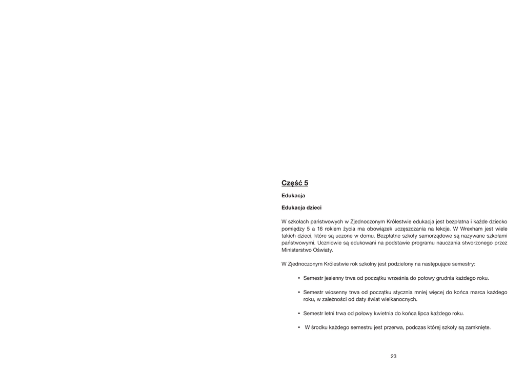 Zapobieganie wypadkom dzieci w domu Rozpoczęcie własnej działalności Jeśli Twoje dziecko ma do 2 lat, istnieje możliwość uzyskania różnych urządzeń bezpieczeństwa służących do zmniejszenia ryzyka wypadków domowych wśród dzieci. Urządzenia zawierają wbudowane barierki bezpieczeństwa oraz inne istotne elementy. W hrabstwie Wrexham działają doradcy biznesowi z dużym doświadczeniem i wiedzą, chętni pomóc w zakładaniu własnej działalności. Aby otrzymać takie urządzenia, należy skontaktować się własnym pielęgniarzem lub pielęgniarką środowiskową, którzy dokonają wszystkich niezbędnych czynności. W przypadku braku pewności odnośnie tego, kto jest Państwa pielęgniarzem lub pielęgniarką środowiskową, należy skontaktować się z własną przychodnią. Mogą oni pomóc stworzyć plan biznesowy, znaleźć odpowiedni teren pod działalność oraz pomoc finansową. Każdego roku pomagają oni setkom ludzi w zrealizowaniu swoich ambicji pracy na własny rachunek. Telefon: Samorząd Gminy Hrabstwa Wrexham Wydział Rozwoju Ekonomicznego Bersham Enterprise Park Plas Grono Road Rhostyllen Wrexham LL14 4EG 01978 366366 E-mail: [email protected] Adres: Nadużywanie alkoholu Nadużywanie alkoholu prowadzi do poważnych konsekwencji. Znaczna liczba przypadków przemocy, w tym przemoc domowa, związana jest z nadużywaniem alkoholu. Zaleca się, aby spożywanie alkoholu nie przekraczało określonego poziomu mierzonego w Wielkiej Brytanii „jednostkami alkoholu”. Czym jest „jednostka” alkoholu? Jednostka alkoholu w przybliżeniu równa jest: połowie dużego piwa, piwa jasnego pełnego i słabego wina o przeciętnej zawartości alkoholu, np. 3-4 % obj. 25 ml alkoholu wysokoprocentowego 50 ml sherry lub porto. Jaka jest zalecana ilość spożycia alkoholu? W przypadku mężczyzn jest to nie więcej niż 21 jednostek na tydzień i nie więcej niż 4 jednostki na dzień W przypadku kobiet jest to nie więcej niż 14 jednostek na tydzień i nie więcej niż 3 jednostki na dzień Kobiety w ciąży – dozwolona bezpieczna ilość alkoholu nie jest znana. Z tego względu powinno się ograniczyć spożycie alkoholu do minimum lub nie spożywać go wcale. Im więcej alkoholu spożywa się powyżej wspomnianych limitów, tym większe ryzyko poważnych problemów zdrowotnych takich jak choroby wątroby. Jeśli spożycie alkoholu przekracza zalecaną wielkość, zaś zrezygnowanie z alkoholu jest trudne, należy spotkać się z lekarzem. Zdrowe odżywianie Niewłaściwa dieta to jeden z głównych powodów złego stanu zdrowia i przedwczesnej śmierci. Oszacowano, że w Wielkiej Brytanii około jednej trzeciej zgonów z powodu chorób serca oraz jednej czwartej zgonów spowodowanych rakiem ma swoje źródło w nieodpowiedniej diecie. Istnieją dowody przemawiające za tym, że zdrowe odżywianie może znacznie zmniejszyć ryzyko wystąpienia poważnych chorób przewlekłych. 30 Część 5 Edukacja Edukacja dzieci W szkołach państwowych w Zjednoczonym Królestwie edukacja jest bezpłatna i każde dziecko pomiędzy 5 a 16 rokiem życia ma obowiązek uczęszczania na lekcje. W Wrexham jest wiele takich dzieci, które są uczone w domu. Bezpłatne szkoły samorządowe są nazywane szkołami państwowymi. Uczniowie są edukowani na podstawie programu nauczania stworzonego przez Ministerstwo Oświaty. W Zjednoczonym Królestwie rok szkolny jest podzielony na następujące semestry: Semestr jesienny trwa od początku września do połowy grudnia każdego roku. Semestr wiosenny trwa od początku stycznia mniej więcej do końca marca każdego roku, w zależności od daty świat wielkanocnych. Semestr letni trwa od połowy kwietnia do końca lipca każdego roku. W środku każdego semestru jest przerwa, podczas której szkoły są zamknięte. 23 W większości szkół uczniowie noszą mundurki. Są one obowiązkowe w szkołach średnich. Dla osób o niskich dochodach lub pobierających zasiłek oferowane są talony na mundurki szkolne. Możliwe jest również uzyskanie dofinansowania posiłków w szkole. Transport do/ze szkoły może być bezpłatny w zależności od miejsca zamieszkania. Aby skorzystać z takiej pomocy finansowej, skontaktuj się z biurem rekrutacji, którego adres znajdziesz poniżej. Szkoły oferują dodatkowy język angielski dla dzieci nie znających tego języka. Edukacja przedszkolna dla dzieci w wieku 0 – 5 lat Dzieci poniżej piątego roku życia nie mają obowiązku chodzenia do szkoły. Istnieje jednak prawo do skorzystania z wczesnej edukacji – bezpłatna edukacja przedszkolna o nie pełnym wymiarze godzin dla wszystkich 3-latków. Dodatkowo istnieje wiele grup przedszkolnych, do których można zapisać swoje dziecko. Więcej informacji uzyskasz pod numerem telefonu: Grupy przedszkolne Tel.: (01978) 358903 lub Oczekiwanie na wizytę lub leczenie W Wielkiej Brytanii Państwowa Służba Zdrowia [NHS] oferuje pacjentom wysoki poziom usług medycznych. Jednakże zdarza się niekiedy, że pacjenci zmuszeni są czekać na wizytę lub leczenie. Często zdarza się, że na oddziałach wypadkowych i pogotowia w szpitalach czas oczekiwania jest długi. Jeśli dotyczy to Państwa, należy zapytać personel o przyczynę i czas oczekiwania. Jeśli nie zadowala Państwa poziom usług otrzymywanych w systemie NHS, należy skontaktować się z Clwyd Community Health Council (Społeczna Rada Zdrowia Clywd). Kontakt z Community Health Council jest możliwy pod adresem: Cartrefle, Cefn Road, Wrexham, LL139NH Nr telefonu: 08452267292 Nr faksu: 01978346870 lub: e-mail: [email protected] Profilaktyka seksualna Centrum Informacji o Dzieciach Tel.: (01978) 292094 Szkoła podstawowa – do 11 roku życia Dzieci mają prawo rozpocząć edukację w pełnym wymiarze godzin we wrześniu po ukończeniu czwartego roku życia. Szkoła średnia: dzieci w wieku 11 – 16 lat Dzieci w wieku 11 lat z różnymi umiejętnościami uczęszczają zazwyczaj do państwowych 