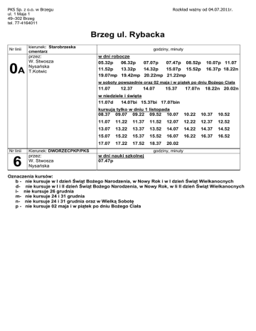 PKS Sp. z o.o. w Brzegu ul. 1 Maja 1 49–302 Brzeg tel. 77-4164011 Rozkład ważny od 04.07.2011r. Brzeg ul. Rybacka Nr linii 0A kierunek: Starobrzeska cmentarz przez: W. Stwosza Nysańska T.Kotwic godziny, minuty w dni robocze 05.32p 06.32p 07.07p 07.47p 08.52p 11.52p 13.32p 14.32p 15.07p 15.52p 19.07mp 19.42mp 20.22mp 21.22mp 10.07p 11.07 16.37p 18.22n w soboty powszednie oraz 02 maja i w piątek po dniu Bożego Ciała 11.07 12.37 14.07 15.37 17.07n 18.22n 20.02n w niedziele i święta 11.07d 14.07bi 15.37bi 17.07bin Nr linii 6 kursują tylko w dniu 1 listopada 08.37 09.07 09.22 09.52 10.07 10.22 10.37 10.52 11.07 11.22 11.37 11.52 12.07 12.22 12.37 12.52 13.07 13.22 13.37 13.52 14.07 14.22 14.37 14.52 15.07 15.22 15.37 15.52 16.07 16.22 16.37 16.52 17.07 17.22 17.52 18.37 20.02 Kierunek: DWORZECPKP/PKS przez: W. Stwosza Nysańska godziny, minuty w dni nauki szkolnej 07.47p Oznaczenia kursów: b - nie kursuje w I dzień Świąt Bożego Narodzenia, w Nowy Rok i w I dzień Świąt Wielkanocnych d- nie kursuje w I i II dzień Świąt Bożego Narodzenia, w Nowy Rok, w Ii II dzień Świąt Wielkanocnych i- nie kursuje 26 grudnia m- nie kursuje 24 i 31 grudnia n- nie kursuje 24 i 31 grudnia oraz w Wielką Sobotę p - nie kursuje 02 maja i w piątek po dniu Bożego Ciała