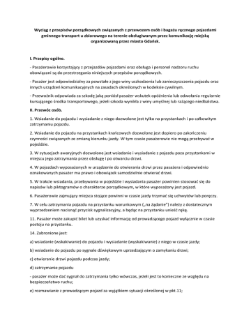 Wyciąg z przepisów porządkowych związanych z przewozem osób i bagażu ręcznego pojazdami gminnego transport u zbiorowego na terenie obsługiwanym przez komunikację miejską organizowaną przez miasto Gdańsk. I. Przepisy ogólne. - Pasażerowie korzystający z przejazdów pojazdami oraz obsługa i personel nadzoru ruchu obowiązani są do przestrzegania niniejszych przepisów porządkowych. - Pasażer jest odpowiedzialny za powstałe z jego winy uszkodzenia lub zanieczyszczenia pojazdu oraz innych urządzeń komunikacyjnych na zasadach określonych w kodeksie cywilnym. - Przewoźnik odpowiada za szkodę jaką poniósł pasażer wskutek opóźnienia lub odwołania regularnie kursującego środka transportowego, jeżeli szkoda wynikła z winy umyślnej lub rażącego niedbalstwa. II. Przewóz osób. 1. Wsiadanie do pojazdu i wysiadanie z niego dozwolone jest tylko na przystankach i po całkowitym zatrzymaniu pojazdu. 2. Wsiadanie do pojazdu na przystankach krańcowych dozwolone jest dopiero po zakończeniu czynności związanych ze zmianą kierunku jazdy. W tym czasie pasażerowie nie mogą przebywać w pojeździe. 3. W sytuacjach awaryjnych dozwolone jest wsiadanie i wysiadanie z pojazdu poza przystankami w miejscu jego zatrzymania przez obsługę i po otwarciu drzwi. 4. W pojazdach wyposażonych w urządzenie do otwierania drzwi przez pasażera i odpowiednio oznakowanych pasażer ma prawo i obowiązek samodzielnie otwierać drzwi. 5. W trakcie wsiadania, przebywania w pojeździe i wysiadania pasażer powinien stosować się do napisów lub piktogramów o charakterze porządkowym, w które wyposażony jest pojazd. 6. Pasażerowie zajmujący miejsca stojące powinni w czasie jazdy trzymać się uchwytów lub poręczy. 7. W celu zatrzymania pojazdu na przystanku warunkowym („na żądanie") należy z dostatecznym wyprzedzeniem nacisnąć przycisk sygnalizacyjny, a będąc na przystanku unieść rękę. 11. Pasażer może zakupić bilet lub uzyskać informację od prowadzącego pojazd wyłącznie w czasie postoju na przystanku. 14. Zabronione jest: a) wsiadanie (wskakiwanie) do pojazdu i wysiadanie (wyskakiwanie) z niego w czasie jazdy; b) wsiadanie do pojazdu po sygnale dźwiękowym uprzedzającym o zamykaniu drzwi; c) otwieranie drzwi pojazdu podczas jazdy; d) zatrzymanie pojazdu - pasażer może dać sygnał do zatrzymania tylko wówczas, jeżeli jest to konieczne ze względu na bezpieczeństwo ruchu; e) rozmawianie z prowadzącym pojazd za wyjątkiem sytuacji określonej w pkt.11; f) zanieczyszczanie i zaśmiecanie pojazdu lub niszczenie jego urządzeń i wyposażenia; g) wychylanie się z pojazdu i opieranie się o drzwi podczas jazdy; h) spożywanie alkoholu, napojów lub artykułów żywnościowych; i) granie na instrumentach muzycznych oraz korzystanie z urządzeń mogących zakłócić spokój w pojeździe; j) palenie tytoniu, wyrobów tytoniowych i używania papierosów elektronicznych (e-papierosów); k) przebywanie w pojeździe na łyżworolkach lub z nałożonym plecakiem; l) wyrzucanie jakichkolwiek przedmiotów z pojazdu; ł) wykonywanie czynności mogących narazić współpasażerów na szkody lub obrażenia; m) wykonywanie innych czynności niedozwolonych w miejscach publicznych. III. Przewóz bagażu ręcznego i zwierząt. 1. Pasażerowie mogą przewozić w pojazdach bagaż ręczny, jeżeli istnieje możliwość takiego umieszczenia go w pojeździe, aby nie zagrażał bezpieczeństwu i porządkowi w transporcie, nie utrudniał przejścia, nie zasłaniał widoczności kierującemu pojazdem, nie stwarzał możliwości wyrządzenia szkody podróżnym lub narażał ich na niewygodę. 5. Przewóz psów w liczbie nie większej niż jeden pies pod opieką dorosłego podróżnego, jest dozwolony (z wyłączeniem miejsc do siedzenia) pod warunkiem, że podróżny posiada aktualne świadectwo szczepienia psa, a pies jest trzymany na smyczy i ma założony kaganiec. 8. W pojazdach nie wolno przewozić: a) przedmiotów, które mogą wyrządzić szkodę innym pasażerom przez zanieczyszczenie lub uszkodzenie ich ciała lub odzieży albo, które mogą uszkodzić lub zanieczyścić pojazd; b) przedmiotów cuchnących, zapalnych, łatwo palnych, wybuchowych, żrących, radioaktywnych, trujących oraz innych materiałów niebezpiecznych; c) przedmiotów wywołujących uczucie odrazy. 11. Przewóz rowerów jest dozwolony w pojazdach niskopodłogowych, odpowiednio oznakowanych „piktogramem” i wskazanych w rozkładach jazdy literką „n” pod warunkiem, że nie zagraża on bezpieczeństwu ruchu oraz pasażerów. IV. Opłaty. 2. Pasażer ma obowiązek skasować bilet niezwłocznie po wejściu do pojazdu, a na przystankach początkowych niezwłocznie po ruszeniu pojazdu zgodnie z zasadami odpłatności określonymi w taryfie. 3. Pasażer ma obowiązek posiadać przez cały czas podróży i okazywać na żądanie kontroli biletowej: - ważny bilet; - dokument uprawniający do korzystania z biletu ulgowego lub do przejazdu bezpłatnego. 4. Pasażer ma obowiązek uiścić opłatę wynikającą z taryfy oraz opłatę dodatkową w przypadku stwierdzenia przez kontrolerów biletowych: - braku biletu lub jego nieważności; - zabrania do pojazdu bagażu lub przedmiotów określonych, których przewóz jest zabroniony w taryfie; - zatrzymania pojazdu lub zmiany trasy bez uzasadnionej przyczyny. 5. Nie podlega anulowaniu opłata dodatkowa, jeżeli w czasie kontroli pasażer nie okazał ważnego biletu jednorazowego oraz, jeżeli bilet okresowy został zakupiony po nałożeniu opłaty dodatkowej. 6. W razie odmowy zapłacenia należności i niemożności ustalenia tożsamości podróżnego kontroler biletów może zwrócić się do funkcjonariusza Policji i innych organów porządkowych, które mają, zgodnie z przepisami prawa, uprawnienia do ustalania tożsamości osób, o podjęcie czynności zmierzających do ustalenia tożsamości podróżnego. 7. Bilety lub dokumenty potwierdzające u