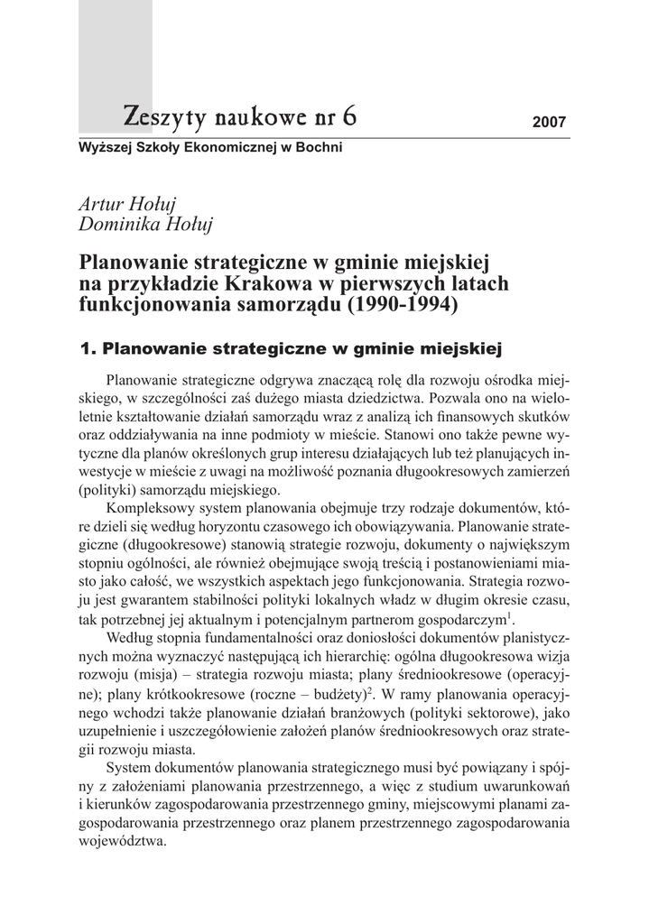Zeszyty naukowe nr 6 2007 Wyższej Szkoły Ekonomicznej w Bochni Artur Hołuj Dominika Hołuj Planowanie strategiczne w gminie miejskiej na przykładzie Krakowa w pierwszych latach funkcjonowania samorządu (1990-1994) 1. Planowanie strategiczne w gminie miejskiej Planowanie strategiczne odgrywa znaczącą rolę dla rozwoju ośrodka miejskiego, w szczególności zaś dużego miasta dziedzictwa. Pozwala ono na wieloletnie kształtowanie działań samorządu wraz z analizą ich finansowych skutków oraz oddziaływania na inne podmioty w mieście. Stanowi ono także pewne wytyczne dla planów określonych grup interesu działających lub też planujących inwestycje w mieście z uwagi na możliwość poznania długookresowych zamierzeń (polityki) samorządu miejskiego. Kompleksowy system planowania obejmuje trzy rodzaje dokumentów, które dzieli się według horyzontu czasowego ich obowiązywania. Planowanie strategiczne (długookresowe) stanowią strategie rozwoju, dokumenty o największym stopniu ogólności, ale również obejmujące swoją treścią i postanowieniami miasto jako całość, we wszystkich aspektach jego funkcjonowania. Strategia rozwoju jest gwarantem stabilności polityki lokalnych władz w długim okresie czasu, tak potrzebnej jej aktualnym i potencjalnym partnerom gospodarczym1. Według stopnia fundamentalności oraz doniosłości dokumentów planistycznych można wyznaczyć następującą ich hierarchię: ogólna długookresowa wizja rozwoju (misja) – strategia rozwoju miasta; plany średniookresowe (operacyjne); plany krótkookresowe (roczne – budżety)2. W ramy planowania operacyjnego wchodzi także planowanie działań branżowych (polityki sektorowe), jako uzupełnienie i uszczegółowienie założeń planów średniookresowych oraz strategii rozwoju miasta. System dokumentów planowania strategicznego musi być powiązany i spójny z założeniami planowania przestrzennego, a więc z studium uwarunkowań i kierunków zagospodarowania przestrzennego gminy, miejscowymi planami zagospodarowania przestrzennego oraz planem przestrzennego zagospodarowania województwa. 62 2. Planowanie strategiczne Gminy Miasta Krakowa w latach 1990-1994 Kraków, podobnie jak inne duże miasta polskie, przez kilkadziesiąt lat był pozbawiony możliwości samodzielnego kształtowania bytu gospodarczego, kulturalnego, naukowego, itd. Z uwagi na funkcje dużych miast nie tylko w gospodarce danego regionu i państwa, ale także w sferze międzynarodowej, to one szczególnie dotkliwie odczuły to „ubezwłasnowolnienie”. Stąd też pierwsze lata funkcjonowania samorządów przypadały na okres niełatwy, wynikły przede wszystkim z problemów braku posiadania doświadczenia w kierowaniu skomplikowanymi organizmami miejskimi, jeszcze bardziej potęgowanych poprzez występowanie licznych problemów społeczno-gospodarczych o skali ogólnokrajowej, będących kosztem przechodzenia okresu transformacji. Był to okres konstytuowania się samych zasad odbudowy systemu samorządności, jego hierarchii, kompetencji, organizacji, źródeł finansowania, itp. Kształtowanie się układu aktów planowania strategicznego jak i operacyjnego (średniookresowego) w Krakowie to do dnia dzisiejszego ciągły proces odnajdywania właściwego jego modelu. Początkowo, tj. do roku 1998, Miasto posiadało właściwie obowiązujące dokumenty tylko z zakresu planowania operacyjnego, przy czym należy dodać, że pierwsze opracowania weszły w życie dopiero w roku 1993. Wprawdzie zostały wtedy uchwalone „Kierunki polityki społeczno-gospodarczej i programu gospodarczego Miasta Krakowa”, to jednak nie stanowiły one opracowania kompleksowego, jakiego wymaga tak duże miasto jak Kraków. Były niejako wstępem do planowania strategicznego, choć w dzisiejszych uwarunkowaniach uznalibyśmy je jedynie za zarys planowania strategicznego, z przewagą celów i założeń planowania operacyjnego. Podobne cechy posiadały kolejne opracowania z roku 1993, dotyczące polityki zagranicznej oraz polityki transportowej Miasta. Dokumenty te cechowała fragmentaryczność i znaczący charakter syntetyczny. Zostały one dodatkowo wsparte w roku 1996, a następnie 1997 i 2000 o plany społeczno-gospodarcze, plany finansowe-inwestycyjne oraz plany gospodarcze Gminy Miasta Krakowa, które w swych założeniach obejmowały pięcioletni horyzont czasowy. Wraz ze wspomnianymi opracowaniami z roku 1993, stanowiły one bazę wyznaczającą ramy działania samorządu miejskiego do roku 1998, a więc okresu obejmującego dwie kadencje władz samorządowych. Pierwsza ogólna, długookresowa wizja rozwoju Miasta powstała w roku 1999, kolejna strategia weszła w życie sześć lat później. Stanowiła ona kontynuację i rozszerzenie pierwszej, zweryfikowane i uaktualnione w związku ze zmianą uwarunkowań zewnętrznych oraz społeczno-gospodarczych realiów funkcjonowania miasta. W historii planowania strategicznego samorządu miejskiego po roku 1989 63 można wyznaczyć kilka faz. W początkowym okresie z przyczyn naturalnych brak było dokumentów planistycznych tworzonych na szczeblu lokalnymi. Taki stan rzeczy trwał przez kilka lat. Pierwsze opracowania pojawiły się w latach 1993-1994, i stanowiły one pierwsze uchwalone dokumenty planistyczne. Kolejnym etapem było wprowadzenie planowania pięcioletniego (kroczące plany rozwoju). Uchwalono trzy takie dokumenty (1996, 1997 oraz 2000 r.). W roku 1999 Miasto otrzymuje pierwszą Strategię rozwoju. Częścią tego opracowania jest Średniookresowy Program Działań, przejmujący zadania planów rozwoju. Uchwalony w roku 2000 ostatni taki plan w stosunku do Średniookresowego Programu Działań stanowi jego rozwinięcie w zakresie źródeł i struktury finansowania inwestycji miejskich. W roku 2005 wchodzi w życie kolejna Strategia Rozwoju. Ponadto zaczynają się pojawiać szczegółowe opracowania branżowe (polityki, programy), takie jak np. Strategia Rozwoju Turyst