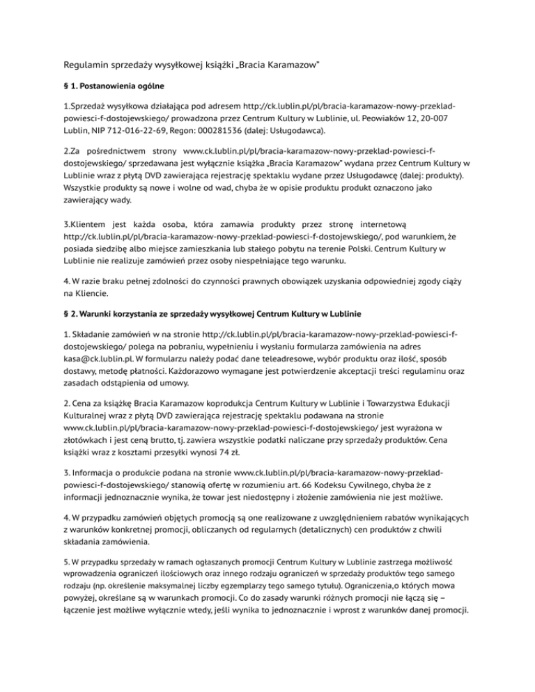 Regulamin sprzedaży wysyłkowej książki „Bracia Karamazow” § 1. Postanowienia ogólne 1.Sprzedaż wysyłkowa działająca pod adresem http://ck.lublin.pl/pl/bracia-karamazow-nowy-przekladpowiesci-f-dostojewskiego/ prowadzona przez Centrum Kultury w Lublinie, ul. Peowiaków 12, 20-007 Lublin, NIP 712-016-22-69, Regon: 000281536 (dalej: Usługodawca). 2.Za pośrednictwem strony www.ck.lublin.pl/pl/bracia-karamazow-nowy-przeklad-powiesci-fdostojewskiego/ sprzedawana jest wyłącznie książka „Bracia Karamazow” wydana przez Centrum Kultury w Lublinie wraz z płytą DVD zawierająca rejestrację spektaklu wydane przez Usługodawcę (dalej: produkty). Wszystkie produkty są nowe i wolne od wad, chyba że w opisie produktu produkt oznaczono jako zawierający wady. 3.Klientem jest każda osoba, która zamawia produkty przez stronę internetową http://ck.lublin.pl/pl/bracia-karamazow-nowy-przeklad-powiesci-f-dostojewskiego/, pod warunkiem, że posiada siedzibę albo miejsce zamieszkania lub stałego pobytu na terenie Polski. Centrum Kultury w Lublinie nie realizuje zamówień przez osoby niespełniające tego warunku. 4. W razie braku pełnej zdolności do czynności prawnych obowiązek uzyskania odpowiedniej zgody ciąży na Kliencie. § 2. Warunki korzystania ze sprzedaży wysyłkowej Centrum Kultury w Lublinie 1. Składanie zamówień w na stronie http://ck.lublin.pl/pl/bracia-karamazow-nowy-przeklad-powiesci-fdostojewskiego/ polega na pobraniu, wypełnieniu i wysłaniu formularza zamówienia na adres [email protected]. W formularzu należy podać dane teleadresowe, wybór produktu oraz ilość, sposób dostawy, metodę płatności. Każdorazowo wymagane jest potwierdzenie akceptacji treści regulaminu oraz zasadach odstąpienia od umowy. 2. Cena za książkę Bracia Karamazow koprodukcja Centrum Kultury w Lublinie i Towarzystwa Edukacji Kulturalnej wraz z płytą DVD zawierająca rejestrację spektaklu podawana na stronie www.ck.lublin.pl/pl/bracia-karamazow-nowy-przeklad-powiesci-f-dostojewskiego/ jest wyrażona w złotówkach i jest ceną brutto, tj. zawiera wszystkie podatki naliczane przy sprzedaży produktów. Cena książki wraz z kosztami przesyłki wynosi 74 zł. 3. Informacja o produkcie podana na stronie www.ck.lublin.pl/pl/bracia-karamazow-nowy-przekladpowiesci-f-dostojewskiego/ stanowią ofertę w rozumieniu art. 66 Kodeksu Cywilnego, chyba że z informacji jednoznacznie wynika, że towar jest niedostępny i złożenie zamówienia nie jest możliwe. 4. W przypadku zamówień objętych promocją są one realizowane z uwzględnieniem rabatów wynikających z warunków konkretnej promocji, obliczanych od regularnych (detalicznych) cen produktów z chwili składania zamówienia. 5. W przypadku sprzedaży w ramach ogłaszanych promocji Centrum Kultury w Lublinie zastrzega możliwość wprowadzenia ograniczeń ilościowych oraz innego rodzaju ograniczeń w sprzedaży produktów tego samego rodzaju (np. określenie maksymalnej liczby egzemplarzy tego samego tytułu). Ograniczenia,o których mowa powyżej, określane są w warunkach promocji. Co do zasady warunki różnych promocji nie łączą się – łączenie jest możliwe wyłącznie wtedy, jeśli wynika to jednoznacznie i wprost z warunków danej promocji. 6. Wypełnienie i wysłanie formularza zamówienia na adres e-mail [email protected] oznacza zawarcie umowy, na mocy której Usługodawca zobowiązuje się do wydania produktów w sposób umówiony oraz przeniesienia ich własności, a Klient – do odebrania produktów i zapłaty całej ceny (produktów i dostawy). 7.Po zawarciu umowy Klient otrzymuje wiadomość e-mail zatytułowaną "Potwierdzenie zamówienia złożonego w Centrum Kultury w Lublinie", zawierającą potwierdzenie wszystkich istotnych elementów zamówienia. 8.W przypadku jeżeli zamówienie obejmuje produkty objęte tzw. przedsprzedażą (tzn. przed wprowadzeniem produktu do obrotu), zostanie ono zrealizowane w całości dopiero z chwilą wprowadzenia do obrotu ostatniego produktu objętego zamówieniem. 9. Jeżeli wskutek błędnych lub nieprawidłowych danych teleadresowych realizacja zamówienia jest niemożliwa, Centrum Kultury w Lublinie ma prawo odstąpienia od zamówienia z obowiązkiem zwrotu pieniędzy. 10. W przypadku nieodebrania produktu w ciągu dwóch tygodni od wysłania maila z powiadomieniem o gotowości produktu do odbioru Centrum Kultury w Lublinie ma prawo odstąpienia od zamówienia. § 3. Formy płatności, warunki dostawy 1. Zapłaty za zamówione produkty można dokonać przelewem na rachunek Centrum Kultury w Lublinie, ul. Peowiaków 12, 20-007 Lublin, nr konta bankowego: Pekao SA 61 1240 1503 1111 0010 0136 6780 – w przypadku braku wpłaty w terminie 14 dni Zamówienie zostaje anulowane. W tytule przelewu prosimy o wpisanie “Bracia Karamazow”. 2. Dostawa realizowana jest za pośrednictwem operatora pocztowego Poczta Polska. § 4. Odstąpienie od umowy 1. Klient będący konsumentem, tj. dokonujący zakupów produktów niezwiązanych bezpośrednio z prowadzoną przez niego działalnością gospodarczą lub zarobkową, może odstąpić od umowy zawartej na odległość bez podania przyczyny w terminie 14 (słownie: czternastu) dni. 2.Termin liczony jest od dnia doręczenia przez operatora pocztowego Poczta Polska. Dla zachowania terminu wystarczające jest wysłanie oświadczenia przed upływem terminu. 3.Oświadczenie jest skuteczne, jeżeli wynika z niego wprost, że Klient rezygnuje z zamówienia. 4.Oświadczenie może być złożone na formularzu stanowiącym załącznik do regulaminu. Korzystanie z formularza nie jest obowiązkowe, ale gwarantuje, że Usługodawca jednoznacznie zinterpretuje wolę Klienta. 5. W razie skorzystania z prawa odstąpienia Klient zobowiązany jest do zwrotu zakupionego produktu. Zwrot powinien nastąpić nie później niż w terminie na odstąpienie (14 dni). Do czasu zwrotu produktu Klient odpowiada za jego zniszczenie lub uszkodzenie