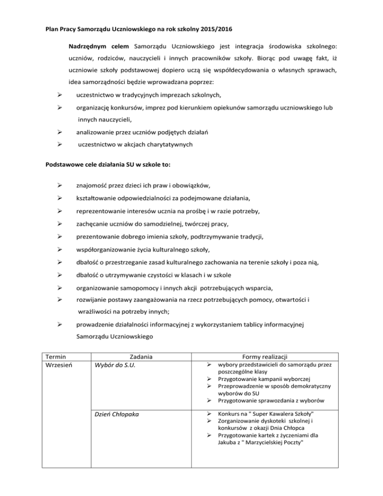 Plan Pracy Samorządu Uczniowskiego na rok szkolny 2015/2016