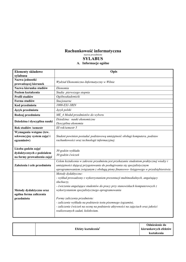 Rachunkowość informatyczna nazwa przedmiotu SYLABUS A. Informacje ogólne Elementy składowe sylabusu Nazwa jednostki prowadzącej kierunek Nazwa kierunku studiów Poziom kształcenia Profil studiów Forma studiów Kod przedmiotu Opis Wydział Ekonomiczno-Informatyczny w Wilnie Ekonomia Studia pierwszego stopnia Ogólnoakademicki Stacjonarne 1000-ES1-3RIN Język przedmiotu Język polski Rodzaj przedmiotu ME_4 Moduł przedmiotów do wyboru Dziedzina: nauki ekonomiczne Dyscyplina ekonomia III rok/semestr 5 Dziedzina i dyscyplina nauki Rok studiów /semestr Wymagania wstępne (tzw. sekwencyjny system zajęć i egzaminów) Liczba godzin zajęć dydaktycznych z podziałem na formy prowadzenia zajęć Założenia i cele przedmiotu Metody dydaktyczne oraz ogólna forma zaliczenia przedmiotu Student powinien posiadać podstawową umiejętność obsługi komputera, podstaw rachunkowości oraz technologii informacyjnej. 30 godzin wykładu 30 godzin ćwiczeń Celem kształcenia w zakresie przedmiotu jest przekazanie studentom praktycznej wiedzy i umiejętności dającej przygotowanie do posługiwania się specjalistycznym oprogramowaniem związanym z obsługą piony finansowo- księgowego w przedsiębiorstwie. Metody dydaktyczne: - wykład prowadzony z wykorzystaniem prezentacji multimedialnych, angażujący słuchaczy, - ćwiczenia angażujące studentów do pracy przy stanowiskach komputerowych z wykorzystaniem specjalistycznego oprogramowania Formy zaliczenia przedmiotu: - zaliczenie wykładu na podstawie testu pisemnego (egzamin), - zaliczenie ćwiczeń na ocenę na podstawie aktywności na zajęciach oraz jakości realizowanych zadań, kolokwium. Efekty kształceniai Odniesienie do kierunkowych efektów kształcenia WIEDZA 3RIN_W01 3RIN _U01 3RIN _K01 Student ma podstawową wiedzę dotyczącą metod i narzędzi wykorzystywanych w specjalistycznych programach komputerowych służących do zorganizowania firmy pod względem finansowo rachunkowym. UMIEJĘTNOŚCI Potrafi przy pomocy odpowiedniego systemu finansowo-księgowego analizować konkretne procesy i zjawiska ekonomiczne. KOMPETENCJE SPOŁECZNE Ma świadomość poziomu swojej wiedzy i umiejętności oraz rozumie potrzebę stałego uczenia się, ze względu na dynamikę procesów rynkowych i społecznych zachodzących w gospodarce. Punkty ECTS Wskaźniki ilościowe Data opracowania: E1 _U01 E1_K01 6 Rodzaj aktywności studenta Bilans nakładu pracy studentaii E1 _W01 Liczba godzin Udział w wykładach 30 Udział w ćwiczeniach 30 Przygotowanie do ćwiczeń 45 Przygotowanie do zaliczenia ćwiczeń 25 Przygotowanie do egzaminu końcowego 20 RAZEM 150 godz. odpowiada 6 pkt ECTS Nakład pracy studenta związany z zajęciami iii: Liczba godzin Punkty ECTS 45 2 wymagającymi bezpośredniego udziału nauczyciela 105 4 o charakterze praktycznym 06.10.2015 Koordynator przedmiotu: Dr Agnieszka Zalewska-Bochenko SYLABUS B. Informacje szczegółowe Elementy składowe sylabusu Nazwa przedmiotu Kod przedmiotu Nazwa kierunku Nazwa jednostki prowadzącej kierunek Opis Rachunkowość informatyczna 1000-ES1-3RIN Ekonomia Wydział Ekonomiczno-Informatyczny w Wilnie Język przedmiotu Rok studiów/ semestr Liczba godzin zajęć dydaktycznych oraz forma prowadzenia zajęć Liczba punktów ECTS Prowadzący Treści merytoryczne przedmiotu Efekty kształcenia wraz ze sposobem ich weryfikacji Forma i warunki zaliczenia przedmiotu Wykaz literatury podstawowej i uzupełniającej Język polski III rok/semestr 5 30 godzin wykładów 6 Dr Agnieszka Zalewska-Bochenko Omówienie trybu pracy bez firmy Zakładanie nowej firmy Parametryzacja pracy programu – ustawienia Plan kont Układ bilansu i rachunku wyników Kartoteki Bilans otwarcia obroty rozpoczęcia Wprowadzanie dokumentów 1. 2. 3. 4. 5. 6. 7. 8. Efekt kształcenia Egzamin końcowy x 3RIN_W01 Do egzaminu dopuszczeni zostają studenci posiadający zaliczenie z ćwiczeń, egzamin w formie testu. Ogólne warunki uczestnictwa i zaliczenia przedmiotu określa Regulamin Studiów. Literatura obowiązkowa: 1. Podręcznik użytkownika Symfonia. Literatura uzupełniająca: 1. Andrzejewski M., Jonas K, Młodkowski P., Zastosowanie technik komputerowych w rachunkowości, Wydawnictwo Wolters Kluwer Polska-Oficyna, Kraków 2004. Dr Agnieszka Zalewska-Bochenko podpis osoby składającej sylabus SYLABUS C. Informacje szczegółowe Elementy składowe sylabusu Opis Nazwa przedmiotu Rachunkowość informatyczna Kod przedmiotu Nazwa kierunku Nazwa jednostki prowadzącej kierunek Język przedmiotu 1000-ES1-3RIN Ekonomia Wydział Ekonomiczno-Informatyczny w Wilnie Rok studiów/ semestr Liczba godzin zajęć dydaktycznych oraz forma prowadzenia zajęć Liczba punktów ECTS Prowadzący Treści merytoryczne przedmiotu Język polski III rok/semestr 5 Ćwiczenia – 30 godz. 6 Dr Agnieszka Zalewska-Bochenko 1. Omówienie trybu pracy bez firmy 2. 3. 4. 5. 6. 7. 8. 9. 10. 11. 12. 13. 14. 15. 16. 17. Efekty kształcenia wraz ze sposobem ich weryfikacji Forma i warunki zaliczenia przedmiotu Wykaz literatury podstawowej i uzupełniającej Zakładanie nowej firmy Omówienie trybu pracy z założoną firmą Archiwizacja danych Parametryzacja pracy programu – ustawienia Plan kont Dane o firmie Parametry stałe Układ bilansu i rachunku wyników Kartoteki Definicje dokumentów Definicje rejestrów Bilans otwarcia obroty rozpoczęcia Wprowadzanie dokumentów Wzorce dokumentów Prezentacja wskaźników Księgowanie operacji gospodarczych Efekt kształcenia Aktywność na zajęciach/praca indywidualna na zajęciach x x x Zaliczenie kolokwium x 3RIN_W01 x 3RIN _U01 3RIN _K01 Warunkiem uzyskania zaliczenia ćwiczeń jest obecność na zajęciach (dopuszczalna jest 1 nieobecność w semestrze), uzyskanie pozytywnego zaliczenia kolokwium oraz na podstawie pracy własnej studenta podczas zajęć. Nieobecności przekraczające dopuszczalny limit powinny być zaliczane na konsultacjach. Ogólne warunki uczestnictwa i zaliczenia przedmiotu określa Regulami