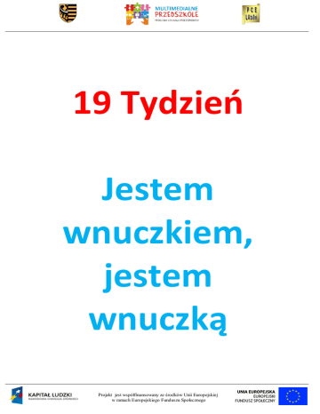 19 Tydzień Jestem wnuczkiem, jestem wnuczką Projekt jest współfinansowany ze środków Unii Europejskiej w ramach Europejskiego Funduszu Społecznego XIX. TEMAT TYGODNIA: JESTEM WNUCZKIEM, JESTEM WNUCZKĄ Dzień tygodnia: 1 Temat: Kto jest kim – członkowie mojej rodziny Wiersz Jadą goście M. Olechowska, D. Raczyńska Wreszcie nadeszło to upragnione, To wyczekane i wyśnione, Moje marzenie o 6 świeczkach. Dzisiaj zostanie spełnione. W domu wielka wrzawa od rana; Mama nie wyspana, ale roześmiana. Duży stół nakrywa tata, Bo zawita tu pół świata. Już wybiła ta godzina, Właśnie schodzi się rodzina – Dzwonią do drzwi: dziadek, babcia, Wujek Krzysio, ciocia Sabcia. Dziadka Tadka też witamy, To jest tata mojej mamy. Coraz więcej jest radości, Coraz więcej wchodzi gości. Wszyscy już przy stole siedzą, Tort urodzinowy jedzą. Wiersz Kim jestem? T. Fiutowskiej Dla mamy jestem synem, dla taty też. Dla Ciebie jestem bratem - to dobrze wiesz. Dla prababci jestem prawnukiem. Dla babci i dziadka wnukiem bez „pra”. Kim jestem dla innych? Ha! Dla Tomka jesteś kolega. On dla Ciebie też. Dlaczego? Nie mówi przecież do mnie kolego. No wiesz? Dla pani w przedszkolu jesteś starszym zuchem... dobrze, że już dla nikogo nie jesteś... maluchem. Projekt jest współfinansowany ze środków Unii Europejskiej w ramach Europejskiego Funduszu Społecznego Dzień tygodnia: 2 Temat: Drzewo genealogiczne mojej rodziny Piosenka Dziadku, dziadku (muzyka i słowa: K. Komińska) Taki pan, który brodę ma. Czy ty wiesz już kto to jest? Na spacerze lody da, poczęstuje ciastkiem też. Opowieści mnóstwo zna i rozśmiesza nimi mnie. Wciąż na twarzy uśmiech ma, bardzo dużo rzeczy wie. Dziadku, dziadku, dziadku, mała wnuczka Twa, życzeń moc najlepszych, dziś dla Ciebie ma. Dziadku, dziadku, dziadku, mały wnuczek Twój serduszko Ci daje dziadku mój. Dziadek to jest taki pan, który zawsze humor ma. Gdy na spacer chce iść sam, szybko proszę: „Weź mnie też”. Bo gdy dziadek idzie w dal, wszystko kolorowe jest. Ptaszek śpiewa, wietrzyk gra, świat zaczarowany jest. Dziadku, dziadku, dziadku… Piosenka Pozdrowienia dla babci i dziadka (muzyka i słowa Bożena Forma) Pozdrawiamy Was kochani, pozdrawiamy całym sercem. Wysłuchajcie co śpiewają wasze wnuki w tej piosence. Ref: Dnia każdego bądźcie z nami, żyjcie w zdrowiu nam sto lat. Wiwat, wiwat niech codziennie głośno śpiewa cały świat. Dzisiaj piękny bukiet kwiatów i laurkę z wielkim sercem, każdy wręczy swojej Babci i Dziadkowi da w podzięce. Projekt jest współfinansowany ze środków Unii Europejskiej w ramach Europejskiego Funduszu Społecznego Ref: Dnia każdego... Dziadek wnuki swe przytuli, Babcia zaraz da buziaka. święto Babci, święto Dziadka sprawa to nie byle jaka. Ref: Dnia każdego... Dzień tygodnia: 4 Temat: Upominek dla babci i dziadka Opowiadanie I. Salach Najlepszy prezent Kasia i Piotruś bawili się w swoim pokoju. Kasia budowała wysoką wieżę z klocków, natomiast Piotruś bawił się swoją ulubioną kolejką. Nagle do pokoju weszła babcia. - Ale bałagan, kto to posprząta? - Później posprzątamy – odpowiedziały dzieci. - No dobrze, bawcie się, a ja na chwilę wyjdę do sklepu. To może trochę potrwać – zaniepokoiła się – zostaniecie sami? - Tak, nie martw się, mamy doskonałą zabawę – uśmiechnął się Piotruś. Po chwili dzieci usłyszały zamykane drzwi. Babcia wyszła. - Piotruś… - zaczęła nieśmiało Kasia – A może posprzątamy? - Coś ty! – obruszył się Piotruś – Przecież zabawa dopiero się zaczyna. - Tak, ale… - ciągnęła Kasia. – Dzisiaj jest Dzień Babci, a ona ma tyle pracy. Może pomożemy jej zamiast się bawić. Piotruś spojrzał na Kasie, był zły. – „Z dziewczynami to tak zawsze! Myślał rozgoryczony. – Nie można się z nimi bawić”. Po chwili jednak zmienił zdanie. – Rzeczywiście… babcia ma tyle na głowie trzeba jej pomóc! - Dobra! Powycieraj kurze z półek a ja poukładam książki. Zabrali się razem do pracy i po chwili zabawki stały równo na półkach. - Zobacz! Na podłodze jest tyle papierków i okruchów z ciastek. - Zamiotę podłogę- zawołał Piotruś i już pobiegł po miotełkę do kuchni. – No teraz może być – odetchnął zadowolony. - Ale zobacz, wczoraj dziadek trzepał chodnik a już jest brudny. Nie wytarłeś dobrze butów przed wejściem do domu. - Wytrzepię go, jest taki mały, że dam sobie radę – powiedział Piotruś. - To ja wypiorę bluzkę którą namoczyła babcia. – dodała Kasia. I znowu zabrali się raźno do pracy. Gdy Piotruś wrócił z chodnikiem, Kasia zdążyła wyprać bluzkę i chowała w kuchni naczynia do szafy. - To ja zamiotę jeszcze podłogę w kuchni – dodał Piotruś. - A co to? Babcia już wróciła? Tak szybko? - Jak tam zabawa? Nie dłużyło wam się? – zawołała od progu. Dzieci stały w przedpokoju zadowolone. Piotruś wziął od babci zakupy, a Kasia przyniosła kapcie. - Co to, nie bawicie się? – zdziwiła się babcia. – Dlaczego macie takie tajemnicze miny? - Sama zobacz – powiedziała Kasia. Babcia rozejrzała się po mieszkaniu i aż klasnęła w ręce: zabawki poukładane, podłogi zamiecione, chodniczek wytrzepany, bluzka uprana. A kuchnia-jaka czysta! Projekt jest współfinansowany ze środków Unii Europejskiej w ramach Europejskiego Funduszu Społecznego Moje kochane zuchy! Zawołała babcia, przytulając dzieci. - Babciu… - zaczął nieśmiało Piotruś. – Mama wyjechała, no a my nie mamy dla Was żadnego prezentu… - Ależ dzieci – przerwała babcia – to jest najlepszy prezent na świecie! Dzień tygodnia: 5 Temat: Bawimy się z babcią i dziadkiem Opowieść ruchowa Robimy ciasto dla babci Dzieci stają w luźnej grupie, słuchają opowieści N. i naśladują wykonywane przez nią czynności. Zrobimy teraz pyszne ciasto specjalnie dla naszej babci. Na początek przygotujemy potrzebne skła