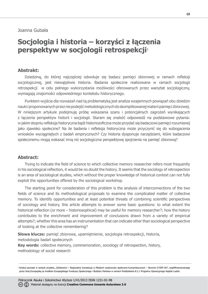 Joanna Gubała Socjologia i historia – korzyści z łączenia perspektyw w socjologii retrospekcji 69 Joanna Gubała Socjologia i historia – korzyści z łączenia perspektyw w socjologii retrospekcji1 Abstrakt: Dziedziną, do której najczęściej odwołuje się badacz pamięci zbiorowej w ramach refleksji socjologicznej, jest niewątpliwie historia. Badania społeczne realizowane w ramach socjologii retrospekcji w celu pełnego wykorzystania możliwości oferowanych przez warsztat socjologiczny, wymagają znajomości odpowiedniego kontekstu historycznego. Punktem wyjścia dla rozważań nad tą problematyką jest analiza wzajemnych powiązań obu dziedzin nauki i proponowanych przez nie podejść metodologicznych do skomplikowanej materii pamięci zbiorowej. W niniejszym artykule podejmuję próbę wskazania szans i potencjalnych zagrożeń wynikających z łączenia perspektyw historii i socjologii. Staram się znaleźć odpowiedź na podstawowe pytania: w jakim stopniu refleksja historyczna bądź historiozoficzna może przydać się badaczowi pamięci rozumianej jako zjawisko społeczne? Na ile badania i refleksja historyczna może przyczynić się do wzbogacenia wniosków wyciągniętych z badań empirycznych? Czy historia dysponuje narzędziami, które badaczowi społecznemu mogą wskazać inną niż socjologiczna perspektywę spojrzenia na pamięć zbiorową? Abstract: Trying to indicate the field of science to which collective memory researcher refers most frequently in his sociological reflection, it would be no doubt the history. It seems that the sociology of retrospection is an area of sociological studies, which without the proper knowledge of historical context can not fully exploit the opportunities offered by the sociological workshop. The starting point for consideration of this problem is the analysis of interconnections of the two fields of science and its methodological proposals to examine the complicated matter of collective memory. To identify opportunities and at least potential threats of combining scientific perspectives of sociology and history, this article attempts to answer some basic questions: to what extent the historical reflection (or more – historiosophical) may be useful for memory researcher?; how the history contributes to the enrichment and improvement of conclusions drawn from a variety of empirical attempts?; whether this area has an instrumentation that can indicate other than sociological perspective of looking at the collective remembering? Słowa klucze: pamięć zbiorowa, upamiętnienie, socjologia retrospekcji, historia, metodologia badań społecznych Key words: collective memory, commemoration, sociology of retrospection, history, methodology of social research 1 A rtykuł powstał w ramach projektu „Doktoranci – Regionalna Inwestycja w Młodych naukowców społeczno-humanistycznych – Akronim D-RIM SH”, współfinansowanego przez Unię Europejską ze środków Europejskiego Funduszu Społecznego i Budżetu Państwa w ramach Poddziałania 8.2.1 Programu Operacyjnego Kapitał Ludzki. Półrocznik Nauka i Szkolnictwo Wyższe 1/41/2013 ISSN 1231-01-98 Materiał dostępny na licencji Creative Commons Uznanie Autorstwa 3.0 Joanna Gubała Socjologia i historia – korzyści z łączenia perspektyw w socjologii retrospekcji 70 Wprowadzenie Pierre Nora, wybitny francuski historyk i przedstawiciel Szkoły Annales, powiedział: „Na całym świecie przeżywamy nadejście czasu pamięci”. Te słowa autora monumentalnego dzieła ”LesLieux de mémoire” oraz rozważań na temat przemian form zbiorowej pamięci na przestrzeni wieków (przejście od millieux de mémoire do lieux de mémoire) zwracają uwagę na wszechobecny zwrot ku pamięci obserwowany pod koniec XX w. (Nora 2001: 37). Renesans pamięci rozumianej jako problem badawczy widać praktycznie we wszystkich dziedzinach nauk humanistycznych i społecznych. Za jedną z subdyscyplin tych ostatnich, nierozerwalnie związaną z historią, można uznać socjologię retrospekcji (częściej nazywaną socjologią pamięci zbiorowej). Dziedzina ta odwołuje się do analiz stale zmieniających się, zróżnicowanych praktyk upamiętniających, w których przejawia się pamięć danej zbiorowości (Olick, Robbins 1998). Ta współzależność skłania do refleksji nad stopniem, w jakim analiza pola problemowego wymaga od badacza łączenia perspektyw właściwych dwóm dziedzinom nauki – socjologii i historii, a także nad tym, na ile dziedziny te wzajemnie się wspierają, a na ile – są wobec siebie konkurencyjne2. Koncepcje pamięci zbiorowej, pamięć a historia Przedmiotem badań socjologii retrospekcji jest pamięć zbiorowa. Chociaż socjologia wskazuje wiele ścieżek budowania strategii badawczych, w tym konkretnym przypadku warto zacząć od nazwania i dokładnej definicji przedmiotu zainteresowania badaczy pamięci – czyli pamięci zbiorowej jako takiej. Dzięki temu możliwe jest dokładne określenie pola problemowego, a także wskazanie podstawowych wymiarów, w ramach których historia i właściwy jej warsztat badawczy mogą stać się przydatne dla badacza społecznego. Przechodząc zatem do socjologicznych ujęć pamięci, warto wskazać na najczęściej spotykane definicje pamięci zbiorowej. Posłużę się tu definicją sformułowaną przez Barbarę Szacką, pamięć zbiorową opisującą jako „zbiór wyobrażeń członków zbiorowości o jej przeszłości, o zaludniających ją postaciach i minionych wydarzeniach, jakie w niej zaszły, a także sposobów ich upamiętniania i przekazywania o nich wiedzy uważanej za obowiązkowe wyposażenie członka tej zbiorowości” (Szacka 2006: 19). Z kolei Marek Ziółkowski opisuje ją jako „pewien zbiór (układ) odnoszących się do przeszłości przekonań należących do świadomości społecznej, w której mieszają się własne wspomnienia z przekazami otrzymywanymi od innych osób” (Ziółkowski 2001: 