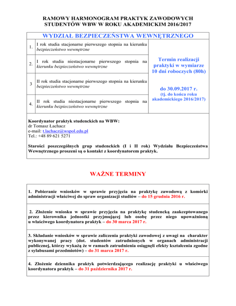 RAMOWY HARMONOGRAM PRAKTYK ZAWODOWYCH STUDENTÓW WBW W ROKU AKADEMICKIM 2016/2017 WYDZIAŁ BEZPIECZEŃSTWA WEWNĘTRZNEGO 1. I rok studia stacjonarne pierwszego stopnia na kierunku bezpieczeństwo wewnętrzne 2. I rok studia niestacjonarne pierwszego stopnia na kierunku bezpieczeństwo wewnętrzne 3 II rok studia stacjonarne pierwszego stopnia na kierunku bezpieczeństwo wewnętrzne 4. II rok studia niestacjonarne pierwszego stopnia na kierunku bezpieczeństwo wewnętrzne Termin realizacji praktyki w wymiarze 10 dni roboczych (80h) do 30.09.2017 r. (tj. do końca roku akademickiego 2016/2017) Koordynator praktyk studenckich na WBW: dr Tomasz Łachacz e-mail: [email protected] Tel.: +48 89 621 5271 Starości poszczególnych grup studenckich (I i II rok) Wydziału Bezpieczeństwa Wewnętrznego proszeni są o kontakt z koordynatorem praktyk. WAŻNE TERMINY 1. Pobieranie wniosków w sprawie przyjęcia na praktykę zawodową z komórki administracji właściwej do spraw organizacji studiów – do 15 grudnia 2016 r. 2. Złożenie wniosku w sprawie przyjęcia na praktykę studencką zaakceptowanego przez kierownika jednostki przyjmującej lub osobę przez niego upoważnioną u właściwego koordynatora praktyk – do 30 marca 2017 r. 3. Składanie wniosków w sprawie zaliczenia praktyki zawodowej z uwagi na charakter wykonywanej pracy (dot. studentów zatrudnionych w organach administracji publicznej, którzy wykażą że w ramach zatrudnienia osiągnęli efekty kształcenia zgodne z sylabusami przedmiotów) – do 31 marca 2017 r. 4. Złożenie dziennika praktyk potwierdzającego realizację praktyki u właściwego koordynatora praktyk – do 31 października 2017 r.