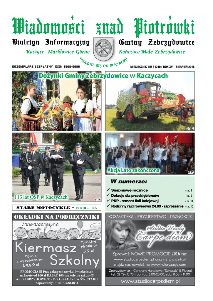 egzemplarz bezp£atny ISSN 1508-0986 MIESIĘCZNIK NR 8 (210) ROK XVII sierpień 2016 Dożynki Gminy Zebrzydowice w Kaczycach str. 13 Akcja Lato zakończona str. 9 W numerze: 115 lat OSP w Kaczycach STare motocykle - Piórnik iem z wyposażen 19.90 zł str. 7 st r . 15 Tornistry i plecaki od 55 zł PROMOCJA !!! Przy zakupach artykułów szkolnych na kwotę od 100 zł RABAT 10% na kolejne zakupy!!! API Zebrzydowice koło szkoły i w Świstaku Zapraszamy !!! Tel. 506814834 ü Sierpniowe rocznice - str. 3 ü Dotacje dla przedsiębiorców - str. 5 ü PKP - remont linii kolejowej - str. 11 ü Rodzinny rajd rowerowy 24.09 - zaproszenie - str. 15 2016 Wiadomoœci znad Piotrówki 1 Skład Skład jest jest czynny: czynny: od pn.-pt. 8.00 16.00, od pn.-pt. 7.00 - 16.00, w w soboty soboty od od 8.00 7.00 do do 13.00 13.00 tel. 32 469 35 82 tel. 32 469 35 82 www.fhustanczyk.pl www.fhustanczyk.pl transport przy zakupie już 1 tony opału Oferujemy: Na terenie gminy PIASEK SZCZAKOWA - do tynku wewnętrznego Od 24.12.2014 r. PIASEK PŁUKANY KOTLARNIA - do tynku zewn. do 28.12.2014 r. PIASEK PŁUKANY BUKÓW - do wylewek maGazyn nIeczynny - gratis! - węgiel orzech Węgiel: Orzech - Marcel - eko-groszek Orzech - Ziemowit Eko - groszek flot- Julian - Marcel Eko groszek - Chwałowice - groszek flot- Bobrek krupiński Eko Eko groszek - Retopal - muł węglowy Miał - Piast Groszek zwykły - węgiel workowany „NOWOŚĆ” Muł - Rydułtowy Orzech Jankowice Flot - Marcel Flot Jankowice Transport przy zakupie Oferujemy węgiel workowany już 1 tony opału Na terenie gminy eko-groszek, węgiel orzech, węgiel groszek ! - gratis! DoDatkowa Dodatkowa promocja promocja !!! !!! Transport Transport przy przy zakupie zakupie opału opału powyżej powyżej 2 2 ton ton na na terenie: terenie: Brzezówka, Brzezówka, Pogwizdów, Pogwizdów, Hażlach, Hażlach, Pruchna, Pruchna, Kończyce Kończyce Wielkie, Wielkie, Ruptawa, Ruptawa, Cisówka, Cisówka, Pielgrzymowice Pielgrzymowice ii Bzie Bzie GratIS GRATIS ! MIESZANKA BUKÓW - POSPÓŁKA PIASEK SZCZAKOWA - do tynku wewnętrznego KAMIEŃ KLINIEC WISŁA 6,3-20 PIASEK PŁUKANY KOTLARNIA - do tynku zewn. KAMIEŃPŁUKANY KLINIEC WISŁA 20-31,5 PIASEK BUKÓW - do wylewek KAMIEŃ TŁUCZEŃ WISŁA 31,5-63 MIESZANKA BUKÓW - POSPÓŁKA KAMIEŃ CZERWONY 10-16 ŻWIR ŻWIR BUKÓW BUKÓW (do (do drenażu) drenażu) -- granulacja granulacja -- 8-16 8-16 ŻWIR ŻWIR DEKORACYJNY DEKORACYJNY KOLOROWY KOLOROWY KOSTKA GRANITOWA - czarna, czerwona KOSTKA GRANITOWA - czarna OBRZEŻA GRANITOWE SANTANDER -ObrzeŻa 40 x 20 oraz granitowe 100 x 20 - 40 x 20 oraz 100 x 20 opał NA RATY Butle „NOWOŚĆ” Butle propan-butan propan-butan Transport Transport materiałów materiałów sypkich sypkich powyżej powyżej 5 5 tt na na terenie terenie całej całej gminy gminy Zebrzydowice Zebrzydowice -- gratis! gratis! CZYNNE: od pn. do sob. 10.00-22.00, CZYNNE: od pn. do sob. 10.00-22.00, niedziela 13.00-22.00, tel. 32 10 39 niedziela 13.00-22.00, tel. 469 32 469 10 39 2 Wiadomoœci znad Piotrówki Zatrudnimy pracownicę do baru na stałe - 3/4 etatu 2 Wiadomoœci znad Piotrówki W naszej gminie przed laty... Sierpniowe rocznice Sierpień, to w naszej gminie miesiąc, w którym od 2001 roku do 2014 na kończyckim dziedzińcu zamkowym odbywały się koncerty orkiestry symfonicznej i artystów operetki śląskiej w ramach Festiwalu Muzyki wokalnej „Viva il Canto”. Pierwszy koncert zatytułowany był: Czar wiedeńskiej operetki. Koncerty te cieszyły się przez te wszystkie lata ogromnym powodzeniem. Również w sierpniu od 2004 roku w Zebrzydowicach odbywały się warsztaty ceramiki i rzeźby. 25 sierpnia 1776 r. biskup wrocławski Filip Gothard Schafgotsch przybył do Zebrzydowic aby konsekrować kościół p/w Wniebowzięcia NMP. 3 sierpnia 1886 r. na cmentarzu w Zebrzydowicach spoczął proboszcz parafii zebrzydowickiej w latach 1861 – 1886 ks. Franciszek Strziżik, który przez 12 lat wcześniej był wikariuszem tej parafii. Nazywano go opiekunem sierot i ubogich, którzy na farze znajdowali dach nad głową i wyżywienie zapisał Alojzy Gabzdyl w kronice szkoły w Zebrzydowicach. 25 sierpnia 1907 r. urodził się Leopold Kania nauczyciel szkoły w Kończycach Małych od r. 1928. Po zakończeniu II wojny światowej rozpoczął pracę w szkole w Zebrzydowicach, a od r. 1951 przez 18 lat pracował w szkole w Marklowicach Górnych. Jego pasją było czytanie i notowanie swoich przemyśleń w 4 zeszytach „Moje czytanie”, wnioski zapisał w ”Analizach literackich” oraz w „Mojej przyjaźni z książką”. Zmarł 2 października 1993 r. 12 sierpnia 1916 r. urodził się Emil Martinek. Był żołnierzem września 1939 r. internowany na Węgrzech, przedostał się następnie do Samodzielnej Brygady Strzelców Karpackich w Syrii. Jesienią 1941 r. walczył w Egipcie i w oblężonym Tobruku. Korpus przerzucono w 1943 r. do Italii, a w r. 1944 zdobywał Monte Cassino. Emil Martinek został ranny w czasie tych walk i 13 maja 1944 r. zmarł. Spoczął na cmentarzu wojskowym pod Monte Cassino. W sierpniu 1916 r. nastąpiła konfiskata dzwonów z kościoła parafialnego w Zebrzydowicach i kościele filialnym w Marklowicach Dolnych. W nocy z 16/17 sierpnia 1919 r. wybuchło I Powstanie Śląskie. Już od stycznia tego roku na Śląsk Cieszyński przybywali uchodźcy z Górnego Śląska i grupowali się w sąsiednich Piotrowicach i Strumieniu. W Piotrowicach ulokowany był sztab Polskiej Organizacji Wojskowej Górnego Śląska i stamtąd wyszedł rozkaz rozpoczęcia działań wojskowych. Powstanie trwało do 25 sierpnia. Z 19/20 sierpnia 1920 r. wybuchło kolejne, II Powstanie Śląskie, które miało na celu usunięcie z obszaru plebiscytowego niemieckich oddziałów bezpieczeństwa. Powstanie zakończyło się sukcesem 25 sierpnia 1920 r. 7 sierpnia 1952 r. w więzieniu mokotowskim w Warszawie zamordowany został płk pilot Bernard Adamecki ur. 12 lipca 1897 r. w Marklowicach Dolnych (syn wó
