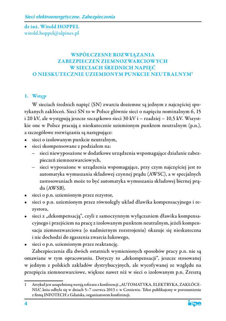 Sieci elektroenergetyczne. Zabezpieczenia dr inż. Witold Hoppel [email protected] WSPÓŁCZESNE ROZWIĄZANIA ZABEZPIECZEŃ ZIEMNOZWARCIOWYCH W SIECIACH ŚREDNICH NAPIĘĆ O NIESKUTECZNIE UZIEMIONYM PUNKCIE NEUTRALNYM1 1. Wstęp W sieciach średnich napięć (SN) zwarcia doziemne są jednym z najczęściej spotykanych zakłóceń. Sieci SN to w Polsce głównie sieci o napięciu nominalnym 6, 15 i 20 kV, ale występują jeszcze szczątkowo sieci 30 kV i – rzadziej – 10,5 kV. Wszystkie one w Polsce pracują z nieskutecznie uziemionym punktem neutralnym (p.n.), a szczegółowe rozwiązania są następujące: • sieci o izolowanym punkcie neutralnym, • sieci skompensowane z podziałem na: –– sieci niewyposażone w dodatkowe urządzenia wspomagające działanie zabezpieczeń ziemnozwarciowych, –– sieci wyposażone w urządzenia wspomagające, przy czym najczęściej jest to automatyka wymuszania składowej czynnej prądu (AWSC), a w specjalnych zastosowaniach może to być automatyka wymuszania składowej biernej prądu (AWSB), • sieci o p.n. uziemionym przez rezystor, • sieci o p.n. uziemionym przez równoległy układ dławika kompensacyjnego i rezystora, • sieci z „dekompensacją”, czyli z samoczynnym wyłączaniem dławika kompensacyjnego i przejściem na pracę z izolowanym punktem neutralnym, jeżeli kompensacja ziemnozwarciowa (o nadmiernym rozstrojeniu) okazuje się nieskuteczna i nie dochodzi do zgaszenia zwarcia łukowego, • sieci o p.n. uziemionym przez reaktancję. Zabezpieczenia dla dwóch ostatnich wymienionych sposobów pracy p.n. nie są omawiane w tym opracowaniu. Dotyczy to „dekompensacji”, jeszcze stosowanej w jednym z polskich zakładów dystrybucyjnych, ale wycofywanej ze względu na przepięcia ziemnozwarciowe, większe nawet niż w sieci o izolowanym p.n. Zresztą 1Artykuł jest uzupełnioną wersją referatu z konferencji „AUTOMATYKA, ELEKTRYKA, ZAKŁÓCENIA”, któa odbyła się w dniach 5–7 czerwca 2013 r. w Cetniewie. Tekst publikujemy w porozumieniu z firmą INFOTECH z Gdańska, organizatorem konferencji. 4 Sieci elektroenergetyczne. Zabezpieczenia dla sieci z „dekompensacją” w zasadzie stosuje się zabezpieczenia ziemnozwarciowe takie same, jak dla sieci o izolowanym punkcie neutralnym. Nie będą też omawiane zabezpieczenia w sieciach o p.n. uziemionym przez reaktancję, bo to rozwiązanie występuje w Polsce chyba tylko w jednej sieci. Polega ono na włączeniu trójfazowej reaktancji uziemiającej tak dobranej, że wartość prądu podczas bezrezystancyjnego zwarcia z ziemią osiąga kilkaset amperów. Nie będą tu omawiane – spotykane w ofercie niektórych producentów zagranicznych – zabezpieczenia oparte na analizie przebiegów przejściowych czy wyższych harmonicznych, ponieważ zdaniem autora są dostępne inne kryteria, prostsze i pewniejsze. Do lat osiemdziesiątych ubiegłego wieku w Polsce stosowano w zabezpieczeniach ziemnozwarciowych SN głównie kryteria jednowielkościowe, czyli zerowoprądowe i zerowonapięciowe, oraz dwuwielkościowe kierunkowe. Tablica 1. Najważniejsze kryteria z grupy admitancyjnych [7] Kryterium, charakterystyka i rekomendacje Warunki rozruchu Kryterium admitancyjne Y0> Obszar zadziałania leży na zewnątrz okręgu o promieniu odpowiadającym wartości admitancji nastawczej. Kryterium to ma najlepsze warunki do działania w sieciach o p.n. uziemionym przez rezystor. Są możliwości wykorzystania go w sieciach o izolowanym p.n. oraz w liniach o małym prądzie doziemnym w sieciach skompensowanych. Obwody wejściowe składowych zerowych nie wymagają fazowania. |Y0p| > Y0nast i U0p > U0nast Kryterium konduktancyjne G0> Rozruch następuje, gdy mierzona konduktancja znajdzie się w obszarze zakreskowanym. Reaguje na składową czynną prądu ziemnozwarciowego. Szczególnie przydatne w sieciach skompensowanych z AWSC i w sieciach o p.n. uziemionym przez rezystor. Nieprzydatne w sieciach o p.n. izolowanym. Obwody wejściowe składowych zerowych nie wymagają fazowania. |G0p| > G0nast i U0p > U0nast Kryterium konduktancyjne kierunkowe G0k Charakterystyka rozruchowa obejmuje I i IV ćwiartkę płaszczyzny admitancji. Kryterium to pełni taką rolę, jak zabezpieczenie kierunkowe czynnomocowe. Nie ma rozruchu prądowego, a czułość działania członu G0 nie zależy od wartości rezystancji przejścia RF. Obwody wejściowe składowych zerowych wymagają fazowania. G0p > G0nast i U0p > U0n Kryterium susceptancyjne kierunkowe B0> Obszar działania obejmuje I i II ćwiartkę płaszczyzny admitancji. Jest to więc charakterystyka kierunkowa o działaniu podobnym do zabezpieczenia biernomocowego. Obwody wejściowe składowych zerowych wymagają fazowania. Zastosowanie ograniczone do sieci o izolowanym p.n. Nr 172-173 B0p>B0n i U0p>U0n 5 Sieci elektroenergetyczne. Zabezpieczenia Kryterium, charakterystyka i rekomendacje Warunki rozruchu Kryterium YG0> Zabezpieczenie typu YG0 uzyskuje się przez połączenie kryterium admitancyjnego i konduktancyjnego. Ma charakterystykę rozruchową jak na rysunku obok. Pozwala na prawidłową identyfikację linii doziemionych w sieciach o różnym sposobie pracy p.n.. W sieciach skompensowanych z AWSC i sieciach o p.n. uziemionym przez rezystor co najmniej jedno z dwóch kryteriów uzyska warunki do pobudzenia. Natomiast po przejściu sieci na izolowany p.n. linie mogą być skutecznie zabezpieczone przez kryterium Y0>. Y0p > Y0nast i G0p > G0nast zawsze U0p > U0nast Kryterium admitancyjno-porównawcze RYY0 Polega na pomiarze przyrostu admitancji zerowej mierzonej w linii doziemionej po załączeniu urządzeń wymuszających dodatkowy prąd ziemnozwarciowy (AWSC lub AWSB). Po wystąpieniu doziemienia oblicza różnicę admitancji doziemnej przed załączeniem i po załączeniu urządzeń wymuszających. Kryterium to wykazuje wysoką czułość w wykrywaniu zwarć o dużej rezystancji przejścia RF. |Y0p1 – Y0p2| > ΔYnast i U0p > U0nast Opracowanie prze