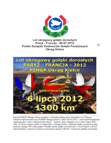Lot okręgowy gołębi dorosłych ParyŜ - Francja - 06.07.2012 Polski Związek Hodowców Gołębi Pocztowych Okręg Kielce Zarząd PZHGP Okręgu Kielce zgodnie z uchwałą podjętą przez Delegatów na Walnym Zebraniu Sprawozdawczym PZHGP Okręgu Kielce w dniu 24.03.2012 r. zatwierdził Regulamin organizacyjny z lotu z miejscowości ParyŜ – Francja, który odbędzie się w dniu 6 lipca 2012 roku. W locie weźmie udział 21 Oddziałów z Okręgu Kielce. Oddziały będą rywalizować jako druŜyny typując 100 sztuk gołębi. Ponadto kaŜdy gołąb uczestniczący w locie będzie walczył indywidualnie o pierwsze miejsca na dystansie ponad 1300 km. 3 pierwsze gołębie otrzymają puchary a kolejne 20 statuetki. KaŜdy gołąb, który zdobędzie konkurs otrzyma pamiątkowy dyplom. Zarząd Okręgu PZHGP w Kielcach w dniu 29.05.2012 na posiedzeniu z Prezesami Oddziałów podjął decyzje aby lot gołębi dorosłych z ParyŜa w 2012 roku był misją pomocową dla chorych dzieci zmagających się z chorobami nowotworowymi pod hasłem „Pomagamy dzieciom z chorobami nowotworowymi”. TakŜe kaŜdy gołąb uczestniczący w locie z ParyŜa pomoŜe dzieciom. Objęliśmy patronatem dzieci przebywające na Oddziale Onkologii Dziecięcej Wojewódzkiego Specjalistycznego Szpitala Dziecięcego im. Wł. Buszkowskiego w Kielcach. Zarząd Okręgu Kielce przekaŜe kwotę 5000 zł w formie rzeczowej uzgodnionej z Dyrekcja Szpitala. Wszystkie pieniądze zebrane za gołębie uczestniczące w locie z ParyŜa z Oddziałów innych Okręgów PZHGP zostaną w całości przekazane na powyŜszy cel. Informacje podstawowe: Data lotu: 06.07.2012 Miejsce wypuszczenia: ParyŜ / Andrezel - Francja Współrzędne geograficzne GPS: 02°50'00.00" - 48°36'26.00" Godzina wypuszczenia: poranna (zostanie opublikowana na stronie po wypuszczeniu gołębi) Zaplanowana ilość gołębi uczestniczących w locie: 2500 szt. Koszowanie gołębi: 04.07.2012 wg harmonogramu Osoba potwierdzająca wypuszczenie gołębi w ParyŜu: Agent de lacher M.Coutard Rene Uroczyste koszowanie gołębi na lot okręgowy ParyŜ – Francja, którego misją jest niesienie pomocy dzieciom z chorobami nowotworowymi, odbędzie się 04.07.2012 roku o godz: 11:00 w Pińczowie ul. Pałęki (plac obok ośrodka MOSIR). Skrócony program: 9:00-11:00 - koszowanie gołębi przez hodowców, 11:00 - uroczyste powitanie zaproszonych gości, - karmienie i pojenie gołębi, - zaplombowanie kabiny transportowej, - poświęcenie gołębi i kabiny przez kapelana Okręgu Kielce 12:00 - odjazd kabiny. Za Zarząd Okręgu Kielce: Tadeusz Ptak - Prezes Okręgu Kielce Tadeusz Bomba - Vice Prezesa ds. Organizacji Lotów Okręgu Kielce Z przyjemnością informujemy o ufundowaniu przez: • firmę Pana Wojciecha Spławińskiego "S.HUL" ul. Słowiańska 3/10, 49-300 Brzeg - specjalnych kontrolek gumowych wyprodukowanych na te okazję. • firmę Pana Przemysława Kozaka "Kozak Druk" z Siedlec - właściciela portalu www.dyplomy24.pl dyplomów dla wszystkich gołębi, które zdobędą konkurs z lotu ParyŜ 2012, • firmę Pana Dawida Piwowarczyka "DAKAR REKLAMY" z Końskich - www.litery24h.pl przygotowanie banera reklamowego na kabinę transportową. • firmę Pana Adama Szałasa "PUCHARY GOŁĘBIE" z Kielc pamiątkowej statuetki dla przedstawicieli FCF. • firmę Pani J. Franczyk P.H.U. "PUCER" z Łącka - upominków dla przedstawicieli FCF. Zestawienie ilościowe zgłoszonych gołębi z poszczególnych oddziałów PZHGP Okręgu Kielce (lista otwarta) Lp. Nr Oddziału Nazwa Oddziału Ilość gołębi 1 0169 Jędrzejów 100 2 0171 Kielce 100 3 0172 Końskie 100 4 0176 Pińczów 100 5 0177 Radom 80 6 0179 SkarŜysko Kamienna 40 7 0180 Starachowice 137 8 0181 Stąporków 100 9 0182 Suchedniów 100 10 0183 Szydłowiec 30 11 0184 Włoszczowa 100 12 0185 Zwoleń 100 13 0379 Pionki 100 14 0380 Radoszyce 100 15 0399 Przysucha 150 16 0444 Kielce-Herby 80 17 0455 Daleszyce-Morawica 100 18 0461 Białobrzegi 100 19 0275 Radomsko / Okręg Piotrków Trybunalski 38 20 0199 Nowa Huta / Okręg Kraków 35 21 0403 Nowe Brzesko / Okręg Kraków 37 Grójec / Okręg Warszawa 80 22 RAZEM Patronat honorowy: Adam Jarubas 1907 Patronat medialny: Opieka medialna: Patronat specjalny: PHT Zbigniew i Łukasz Chrabąszcz ul.Spokojna Modliszewice, 26-200 Końskie 3Rue Francois Lepine, 28600 Luisant Sponsorzy: Wojciech Spławiński "S.HUL" ul. Słowiańska 3/10, 49-300 Brzeg, tel.: +48 609-191-190 Producent kontrolek gumowych dla gołebi pocztowych. P.H.U. "PUCER" J. Franczyk Łącko 627, 33-390 Łącko tel.: +48 609-812-360 Trasa lotu: Harmonogram koszowania gołębi na lot ParyŜ Komunikat PZHGP Okręgu Kielce odnośnie wkładania gołębi na lot okręgowy z miejscowości ParyŜ – Francja zaplanowanego na dzień 06 lipiec 2012 (piątek) oraz nastawiania i otwierania zegarów a takŜe wykonania okręgowej listy konkursowej. 1. Wkładanie (koszowanie) gołębi odbędzie się w dniu 04 lipiec 2012 (środa) na wszystkich wyznaczonych punktach wkładań według poniŜszego harmonogramu: a. Punkt wkładań nr 1 – PRZYSUCHA ul. Staszica (obok hurtowni „Zagłoba”) - wkładają oddziały: Przysucha, Radom, Białobrzegi, Zwoleń, Pionki. - wkładanie gołębi od godz.:5:00 do 7:40 - odpowiedzialny za punkt wkładań Kolega Tadeusz Bomba. b. Punkt wkładań nr 2 – KOŃSKIE ul. Wjazdowa 17 - wkładają oddziały: Końskie, Radoszyce, Stąporków, Włoszczowa i Radomsko. - wkładanie gołębi od godz.: 5:20 do 8:00 - odpowiedzialny za punkt wkładań Kolega Adam Chybiński. c. Punkt wkładań nr 3 – SKARśYSKO-KAMIENNA ul. Legionów 115 - wkładają oddziały: SkarŜysko-Kamienna, Szydłowiec, Suchedniów, Starachowice - wkładanie gołębi od godz.:6:20 do 8:45 - odpowiedzialny za punkt wkładań Kolega Wiesław Łasek. d. Punkt wkładań nr 4 – KIELCE-HERBY ul. Przejazd - wkładają oddziały: Kielce, Kielce-Herby, Daleszyce-Morawica - wkładanie gołębi od godz.:7:30 do 9:45 - odpowiedzialny za punkt w