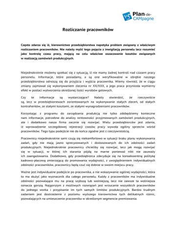 Rozliczanie pracowników Często zdarza się iż, kierownictwo przedsiębiorstwa napotyka problem związany z właściwym rozliczaniem pracowników. Nie należy mylić tego pojęcia z inwigilacją personelu lecz rozumieć jako kontrolę czasu pracy, mającą na celu właściwe oszacowanie kosztów związanych w realizacją zamówień produkcyjnych. Niejednokrotnie możemy spotkać się z sytuacją, iż nie mamy żadnej kontroli nad czasem pracy personelu. Informacje, które posiadamy, a są one weryfikowalne w obrębie naszego przedsiębiorstwa odnoszą się do przyjścia i wyjścia pracownika. Wiemy również, że w ciągu zmiany zajmował się wykonywaniem zlecenia nr XX/XXX, a jego praca przyniosła wymierny efekt w postaci wytworzenia określonej ilości wyrobów gotowych. Czy te informacje są wystarczające? Należy stwierdzić, że rzeczywiście są, lecz w przedsiębiorstwach zorientowanych na wykonywanie stałych zleceń, od stałych kontrahentów, ze stałymi kosztami, ze stałymi wynagrodzeniami pracowników. Korzystając z programu do zarządzania produkcją nie tylko zdobędziemy konieczne nam informacje, potrzebne do analizy rentowności przyjmowanych zamówień produkcyjnych, ale i dodatkowo nasza firma zacznie się rozwijać. Wielu przedsiębiorców jest zdania, iż wprowadzenie szczegółowej rejestracji czasów pracy wywoła ogólny sprzeciw wśród pracowników. Tego typu podejście nie do końca zgodne jest z rzeczywistością. Pracownicy niejednokrotnie sami czują się niekomfortowo w sytuacji braku planu wykonywania zadań, gdy nie mają jasno sprecyzowanych i dostosowanych do ich zdolności zadań produkcyjnych. Niejednokrotnie pracownicy chcieliby się rozwijać, lecz jak mogą rozwijać się w sytuacji, w której ich starania pójdą na marne ponieważ nikt nie zauważy ich zaangażowania. Dodatkowo, gdy przedsiębiorca zdecyduje się na konsekwentną politykę kadrowo-płacową zmierzającą do promowania wydajności, z uwzględnieniem indywidualnych zdolności pracowników, pracownicy będą czuć się dobrze w swoim miejscu pracy. Ważne jest indywidualne podejście po pracownika, a nie wskazywanie ogólnej wydajności, która to ma służyć jako wyznacznik dla całego personelu. Każdy z pracowników ma indywidualne zdolności pozwalające mu na pracę szybszą lub wolniejszą, lecz nie zawsze ta wolniejsza oznacza gorszą. Najgorszym z możliwych rozwiązań jest wrzucanie wszystkich pracowników do jednego worka i przypisanie im tych samych limitów produkcyjnych. Bardzo trudnym zadaniem jest dostrzeżenie z poziomu wyższego kierownictwa tych delikatnych różnic, pozwalających na umieszczenie pracownika w określonym segmencie premiowania. Wymaga to czasu i narzędzia, które w systematyczny i dokładny sposób pozwoli wychwytywać różnice, aby później wyznaczyć limity produkcji w odniesieniu do indywidualnych grup pracowników. Autor: Ł. Piwowoński