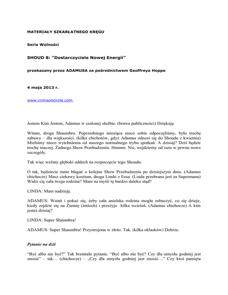 MATERIAŁY SZKARŁATNEGO KRĘGU Seria Wolności SHOUD 8: “Dostarczyciele Nowej Energii” przekazany przez ADAMUSA za pośrednictwem Geoffreya Hoppe 4 maja 2013 r. www.crimsoncircle.com Jestem Kim Jestem, Adamus w szalonej służbie. (brawa publiczności) Dziękuję. Witam, droga Shaumbro. Poprzedniego miesiąca nieco sobie odpoczęliśmy, było trochę zabawy – dla większości. (kilka chichotów, gdyż Adamus odnosi się do Shoudu z kwietnia) Mieliśmy nieco wytchnienia od naszego normalnego trybu spotkań. A dzisiaj? Dziś będzie trochę inaczej. Żadnego Show Przebudzenia. Hmmm. Nie, wejdziemy od razu w pewne nowe szczegóły. Tak więc weźmy głęboki oddech na rozpoczęcie tego Shoudu. O tak, będziecie mnie błagać o kolejne Show Przebudzenia po dzisiejszym dniu. (Adamus chichocze) Masz ciekawy kostium, droga Lindo z Eesa. (Linda przebrana jest za Supermana) Widzi cię cała twoja rodzina? Mam na myśli tę bardzo daleko stąd? LINDA: Mam nadzieję. ADAMUS: Wstań i pokaż się, żeby cała anielska rodzina mogła zobaczyć, co się dzieje, kiedy zejdzie się na Ziemię (śmiech) i przeżyje kilka wcieleń. (Adamus chichocze) A kim jesteś dzisiaj? LINDA: Super Shaumbra! ADAMUS: Super Shaumbra! Przystrojona w złoto. Tak. (kilka oklasków) Dobrze. Pytanie na dziś “Być albo nie być?” Tak brzmiało pytanie. “Być albo nie być? Czy dla umysłu godniej jest znosić” – tak… (chichocze) – „Czy dla umysłu godniej jest znosić…” Czy ktoś pamięta 2 dalszy ciąg? Nieco Szekspi-… (kilka osób podpowiada: „strzały i razy…”) Ach, „strzały i razy nieprzytomne losu…” I dalej? Znacie dalszy ciąg? To wszystko? (Adamus chichocze) Weźmy głęboki oddech. “Być albo nie być”, tak brzmiało pytanie. Pytanie zadane zostało przez Hamleta. „Czy powinienem żyć czy powinienem umrzeć? Jaki pożytek z życia? Utknąłem w cierpieniu mojego umysłu, w tych szaleństwach losu, jakich doświadczam.” “Czy chcę być tutaj czy chcę odejść? Co mam zrobić? Czy mogę się wydostać jakoś z tej niedoli?” – pytał Hamlet w sztuce napisanej przez Wiliama Adamusa Szekspira. (śmiech) Śmiejecie się. Śmiejecie się. A zatem, droga Shaumbro, teraz pytanie brzmi: “Być świadomym czy nie być świadomym?” Oto jest pytanie. To jest prawdziwe pytanie. “Być świadomym czy nie być świadomym?”, a ja każdego z was zapytuję, rozpoczynając tę część naszego spotkania, jaka jest odpowiedź? “Być świadomym czy nie być świadomym?” Być świadomym czy nie, ponieważ w rzeczywistości znajdujecie się w śródlądziu. Znajdujecie się w śródlądziu z jednym okiem otwartym, drugim zamkniętym, wędrując w świecie ludzi, mających zamknięte oboje oczu; w śródlądziu, nie będąc pewnymi, co się wydarzy, w napawającym strachem zdradliwym śródlądziu przebudzenia, gdzie wciąż chce się mieć nadzieję, lecz gdzie czasami jest tak ponuro, tak szaro i gdzie życie tak bardzo pozbawione jest marzeń. Tyle jest powodów, dla których w tym śródlądziu chce wam się zrobić wiele kroków wstecz do tej starej rzeczywistości, gdzie wszyscy chodzą z zamkniętymi oczami i gdy teraz poruszacie się w tym śródlądziu pośród waszych ludzkich towarzyszy mając jedno oko otwarte, jak wyjaśnicie im, co znaczy być świadomym? Ślepy człowiek, ślepi ludzie, ślepa grupa ludzkich istot, a wy akurat macie jedno oko otwarte. Jak im wyjaśnicie, gdy będą was błagać i wzywać, byście wrócili do tej starej rzeczywistości, do tego starego miejsca nieświadomości? Wy, z jednym okiem otwartym, a drugim wciąż zamkniętym, jak objaśnicie im czym jest świadomość, tym, którzy mają zamknięte oboje oczu? Jak w ogóle moglibyście objaśnić, czym jest wzrok komuś, kto jest ślepy? Jak moglibyście wyjaśnić, jak to jest, kiedy odczuwa się wzburzenie duszy i serca, kiedy chce się szybko wyzwolić ze starych sposobów i ludzkich wzorców, jeśli sami jeszcze nie wiecie, dokąd zmierzacie? Jak cokolwiek wyjaśnicie tym, którzy pozbawieni są wzroku? Jak objaśnicie świat, który opuszczacie nie znając świata, w który wchodzicie? Między jednym światem a drugim, w tej „ziemi niczyjej” między życiem świadomym a nieświadomym – oto, gdzie dokładnie się teraz znajdujecie. Nie macie pojęcia, czy słowa, które tu do was wypowiadam pochodzą z prawdziwego źródła czy też z jakiegoś innego majaczącego umysłu. (kilka chichotów) Nie macie pojęcia czy w ogóle jest coś takiego jak Wzniesiony Mistrz. Jesteście w śródlądziu, ale wiecie – wiecie w swoim sercu – że nie możecie powrócić do świata ślepych, do świata nieświadomych. I chociaż czasami próbujecie to robić – och, tak rozpaczliwie próbujecie powrócić do miejsca, z którego przyszliście – to nie możecie powrócić z otwartym jednym okiem. Już nie uda wam się zamknąć obojga. A więc tutaj jesteście, dryfując po bezkresnym morzu. Dryfując po tym morzu zmartwień, nie wiedząc czy jesteście świadomi czy nie jesteście, nie wiedząc co za chwilę się wydarzy i do czego macie się odwoływać. Nie do słów, wypowiadanych przez innych, nie tak zwyczajnie 3 do nadziei w waszym sercu. To, na czym musicie polegać to wy, tylko wy. To, na czym musicie polegać wybiega daleko poza umysł, ponieważ umysł jest najdziwniejszym ze wszystkich aspektów. (ktoś reaguje, Adamus chichocze) Ulżyj sobie, moja droga! Ulżyj sobie! Umysł jest najdziwniejszym ze wszystkich aspektów. Nie możecie już dłużej polegać na umyśle. On was zdradził. Stworzył iluzje i sprawił, że uwierzyliście, iż są rzeczywiste, podczas gdy w sercu wiecie, że nie są. Wy To, na czym musicie polegać, jesteście wy, ale wciąż nie będąc pewnymi, kim jesteście, wciąż próbując odnaleźć siebie w tym bezkresnym morzu zmartwień, wciąż próbując siebie zidentyfikować – czego zwyczajnie nie da się zrobić – zanurzacie się głębiej. Zan