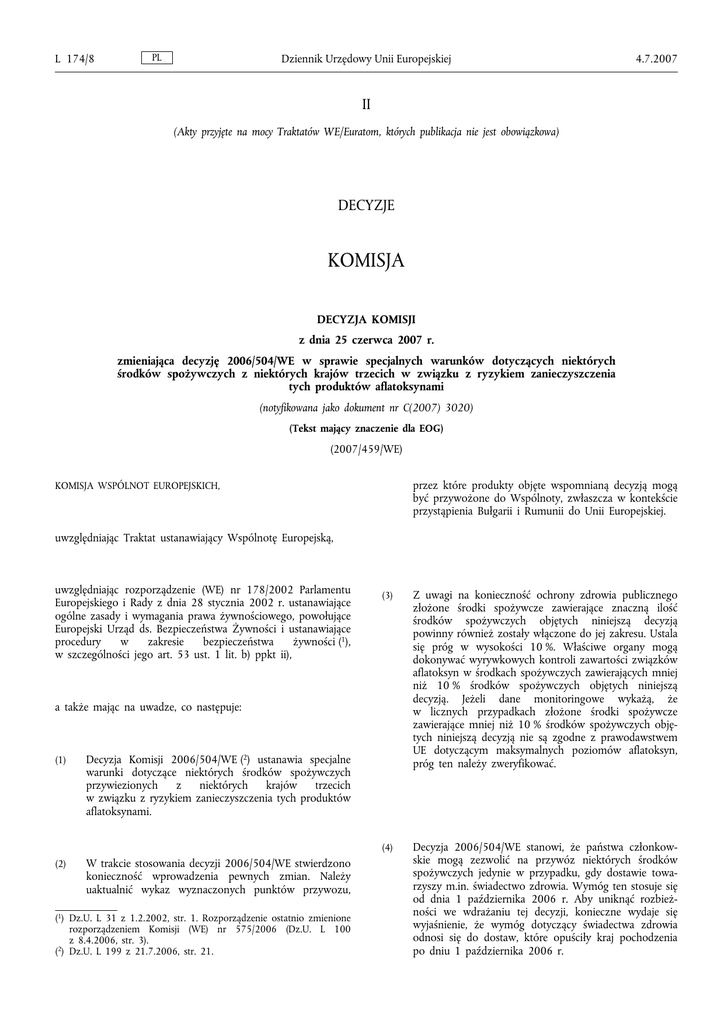 L 174/8 PL Dziennik Urzędowy Unii Europejskiej 4.7.2007 II (Akty przyjęte na mocy Traktatów WE/Euratom, których publikacja nie jest obowiązkowa) DECYZJE KOMISJA DECYZJA KOMISJI z dnia 25 czerwca 2007 r. zmieniająca decyzję 2006/504/WE w sprawie specjalnych warunków dotyczących niektórych środków spożywczych z niektórych krajów trzecich w związku z ryzykiem zanieczyszczenia tych produktów aflatoksynami (notyfikowana jako dokument nr C(2007) 3020) (Tekst mający znaczenie dla EOG) (2007/459/WE) przez które produkty objęte wspomnianą decyzją mogą być przywożone do Wspólnoty, zwłaszcza w kontekście przystąpienia Bułgarii i Rumunii do Unii Europejskiej. KOMISJA WSPÓLNOT EUROPEJSKICH, uwzględniając Traktat ustanawiający Wspólnotę Europejską, uwzględniając rozporządzenie (WE) nr 178/2002 Parlamentu Europejskiego i Rady z dnia 28 stycznia 2002 r. ustanawiające ogólne zasady i wymagania prawa żywnościowego, powołujące Europejski Urząd ds. Bezpieczeństwa Żywności i ustanawiające procedury w zakresie bezpieczeństwa żywności (1), w szczególności jego art. 53 ust. 1 lit. b) ppkt ii), (3) Z uwagi na konieczność ochrony zdrowia publicznego złożone środki spożywcze zawierające znaczną ilość środków spożywczych objętych niniejszą decyzją powinny również zostały włączone do jej zakresu. Ustala się próg w wysokości 10 %. Właściwe organy mogą dokonywać wyrywkowych kontroli zawartości związków aflatoksyn w środkach spożywczych zawierających mniej niż 10 % środków spożywczych objętych niniejszą decyzją. Jeżeli dane monitoringowe wykażą, że w licznych przypadkach złożone środki spożywcze zawierające mniej niż 10 % środków spożywczych objętych niniejszą decyzją nie są zgodne z prawodawstwem UE dotyczącym maksymalnych poziomów aflatoksyn, próg ten należy zweryfikować. (4) Decyzja 2006/504/WE stanowi, że państwa członkowskie mogą zezwolić na przywóz niektórych środków spożywczych jedynie w przypadku, gdy dostawie towarzyszy m.in. świadectwo zdrowia. Wymóg ten stosuje się od dnia 1 października 2006 r. Aby uniknąć rozbieżności we wdrażaniu tej decyzji, konieczne wydaje się wyjaśnienie, że wymóg dotyczący świadectwa zdrowia odnosi się do dostaw, które opuściły kraj pochodzenia po dniu 1 października 2006 r. a także mając na uwadze, co następuje: (1) Decyzja Komisji 2006/504/WE (2) ustanawia specjalne warunki dotyczące niektórych środków spożywczych przywiezionych z niektórych krajów trzecich w związku z ryzykiem zanieczyszczenia tych produktów aflatoksynami. (2) W trakcie stosowania decyzji 2006/504/WE stwierdzono konieczność wprowadzenia pewnych zmian. Należy uaktualnić wykaz wyznaczonych punktów przywozu, (1) Dz.U. L 31 z 1.2.2002, str. 1. Rozporządzenie ostatnio zmienione rozporządzeniem Komisji (WE) nr 575/2006 (Dz.U. L 100 z 8.4.2006, str. 3). (2) Dz.U. L 199 z 21.7.2006, str. 21. 4.7.2007 (5) PL Dziennik Urzędowy Unii Europejskiej Oprócz tego wzór świadectwa zdrowia określony we wspomnianej decyzji należy zmienić poprzez oddzielenie świadectwa zdrowia, które powinno być wypełniane przez właściwe organy kraju pochodzenia środków spożywczych objętych decyzją 2006/504/WE od informacji, których powinny udzielać właściwe organy państw członkowskich. Ponadto należy zmienić wspólny dokument zawierający informacje dotyczące przeprowadzonych kontroli w celu uwzględnienia sytuacji, w której organ właściwy w miejscu wprowadzenia do Wspólnoty jest inny niż organ właściwy w wyznaczonym punkcie przywozu lub gdy kontrola fizyczna nie jest obowiązkowa. (6) Należy zatem 2006/504/WE. odpowiednio zmienić decyzję (7) Środki przewidziane w niniejszej decyzji są zgodne z opinią Stałego Komitetu ds. Łańcucha Żywnościowego i Zdrowia Zwierząt, PRZYJMUJE NINIEJSZĄ DECYZJĘ: Artykuł 1 L 174/9 b) Następujące środki spożywcze pochodzące lub przywożone z Chin: i) orzeszki ziemne objęte kodem CN 1202 10 90 lub 1202 20 00; ii) orzeszki ziemne objęte kodem CN 2008 11 94 (w bezpośrednich opakowaniach o zawartości netto powyżej 1 kg) lub 2008 11 98 (w bezpośrednich opakowaniach o zawartości netto nieprzekraczającej 1 kg); iii) prażone orzeszki ziemne objęte kodem CN 2008 11 92 (w bezpośrednich opakowaniach o zawartości netto powyżej 1 kg) lub 2008 11 96 (w bezpośrednich opakowaniach o zawartości netto nieprzekraczającej 1 kg). c) Następujące środki spożywcze pochodzące lub przywożone z Egiptu: i) orzeszki ziemne objęte kodem CN 1202 10 90 lub 1202 20 00; W decyzji 2006/504/WE wprowadza się następujące zmiany: 1) artykuł 1 otrzymuje brzmienie: „Artykuł 1 ii) orzeszki ziemne objęte kodem CN 2008 11 94 (w bezpośrednich opakowaniach o zawartości netto powyżej 1 kg) lub 2008 11 98 (w bezpośrednich opakowaniach o zawartości netto nieprzekraczającej 1 kg); Zakres Niniejsza decyzja ma zastosowanie do środków spożywczych, o których mowa w lit. a)–e) oraz do przetworzonych i złożonych środków spożywczych pochodzących od lub zawierających znaczną ilość środków spożywczych, o których mowa w lit. b)–e). Jednakże nie ma ona zastosowania w odniesieniu do dostaw środków spożywczych o masie brutto nieprzekraczającej 5 kg. Uznaje się, że środki spożywcze zawierają znaczną ilość środków spożywczych, o których mowa w lit. b)–e), w przypadku gdy stanowią one co najmniej 10 % ich zawartości. a) Następujące środki spożywcze pochodzące lub przywożone z Brazylii: i) orzechy brazylijskie w łupinach objęte kodem CN 0802 21 00; ii) mieszanki orzechów lub suszonych owoców objęte kodem CN 0813 50 i zawierające orzechy brazylijskie w łupinach. iii) prażone orzeszki ziemne objęte kodem CN 2008 11 92 (w bezpośrednich opakowaniach o zawartości netto powyżej 1 kg) lub 2008 11 96 (w bezpośrednich opakowaniach o zawartości netto nieprzekraczającej 1 kg). d) Na