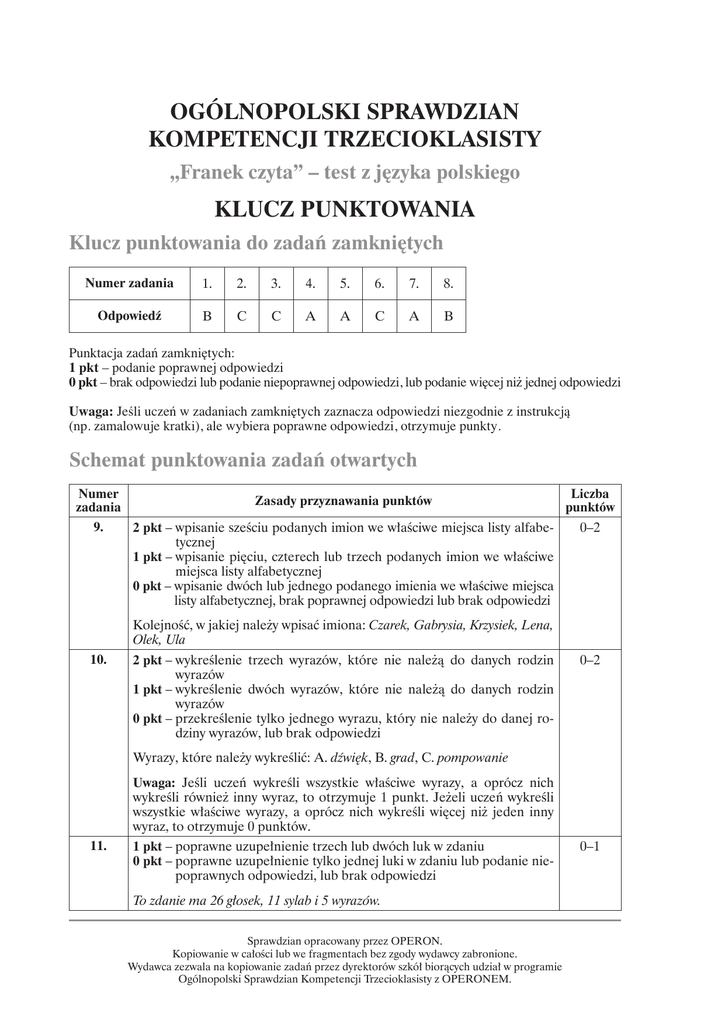 OGÓLNOPOLSKI SPRAWDZIAN KOMPETENCJI TRZECIOKLASISTY „Franek czyta” – test z języka polskiego KLUCZ PUNKTOWANIA Klucz punktowania do zadań zamkniętych Numer zadania 1. 2. 3. 4. 5. 6. 7. 8. Odpowiedź B C C A A C A B Punktacja zadaƒ zamkni´tych: 1 pkt – podanie poprawnej odpowiedzi 0 pkt – brak odpowiedzi lub podanie niepoprawnej odpowiedzi, lub podanie wi´cej niż jednej odpowiedzi Uwaga: JeÊli uczeƒ w zadaniach zamkni´tych zaznacza odpowiedzi niezgodnie z instrukcjà (np. zamalowuje kratki), ale wybiera poprawne odpowiedzi, otrzymuje punkty. Schemat punktowania zadań otwartych Numer Liczba Zasady przyznawania punktów zadania punktów 9. 2 pkt – wpisanie sześciu podanych imion we właściwe miejsca listy alfabe0–2 tycznej 1 pkt – wpisanie pięciu, czterech lub trzech podanych imion we właściwe miejsca listy alfabetycznej 0 pkt – wpisanie dwóch lub jednego podanego imienia we właściwe miejsca listy alfabetycznej, brak poprawnej odpowiedzi lub brak odpowiedzi 10. Kolejność, w jakiej należy wpisać imiona: Czarek, Gabrysia, Krzysiek, Lena, Olek, Ula 2 pkt – wykreślenie trzech wyrazów, które nie należą do danych rodzin wyrazów 1 pkt – wykreślenie dwóch wyrazów, które nie należą do danych rodzin wyrazów 0 pkt – przekreślenie tylko jednego wyrazu, który nie należy do danej rodziny wyrazów, lub brak odpowiedzi 0–2 Wyrazy, które należy wykreślić: A. dźwięk, B. grad, C. pompowanie 11. Uwaga: Jeśli uczeń wykreśli wszystkie właściwe wyrazy, a oprócz nich wykreśli również inny wyraz, to otrzymuje 1 punkt. Jeżeli uczeń wykreśli wszystkie właściwe wyrazy, a oprócz nich wykreśli więcej niż jeden inny wyraz, to otrzymuje 0 punktów. 1 pkt – poprawne uzupełnienie trzech lub dwóch luk w zdaniu 0 pkt – poprawne uzupełnienie tylko jednej luki w zdaniu lub podanie niepoprawnych odpowiedzi, lub brak odpowiedzi To zdanie ma 26 głosek, 11 sylab i 5 wyrazów. Sprawdzian opracowany przez OPERON. Kopiowanie w całości lub we fragmentach bez zgody wydawcy zabronione. Wydawca zezwala na kopiowanie zadań przez dyrektorów szkół biorących udział w programie Ogólnopolski Sprawdzian Kompetencji Trzecioklasisty z OPERONEM. 0–1 Klucz punktowania Ogólnopolskiego Sprawdzianu Kompetencji Trzecioklasisty z OPERONEM i Grupą Wydawniczą Polskapresse Numer Liczba Zasady przyznawania punktów zadania punktów 12. I. Stosowanie formy opowiadania 0–1 1 pkt – nadanie wypowiedzi formy opowiadania lub formy zbliżonej do opowiadania (wypowiedź nie musi mieć wyraźnie wyodrębnionego wstępu, rozwinięcia i zakończenia) 0 pkt – nadanie wypowiedzi innej formy niż opowiadanie II. Realizacja tematu (treść) 0–1 1 pkt – pełna lub przynajmniej częściowa realizacja tematu 0 pkt – brak realizacji tematu III. Spójność tekstu 0–1 1 pkt – zbudowanie spójnej i logicznie uporządkowanej wypowiedzi (kolejne zdania są ze sobą powiązane) 0 pkt – brak spójności tekstu IV. Przestrzeganie norm językowych 0–1 1 pkt – przestrzeganie norm językowych w wypowiedzi; dopuszcza się: – 2 błędy językowe w pracach liczących 5 zdań – 4 błędy językowe w pracach liczących więcej niż 5 zdań 0 pkt – nieprzestrzeganie norm językowych w wypowiedzi: – popełnienie więcej niż 2 błędów językowych w pracach liczących 5 zdań – popełnienie więcej niż 4 błędów językowych w pracach liczących więcej niż 5 zdań V. Przestrzeganie podstawowych norm ortograficznych 0–1 1 pkt – przestrzeganie norm ortograficznych w wypowiedzi; dopuszcza się: – 2 błędy ortograficzne w pracach liczących 5 zdań – 4 błędy ortograficzne w pracach liczących więcej niż 5 zdań 0 pkt – nieprzestrzeganie norm ortograficznych: – popełnienie więcej niż 2 błędów ortograficznych w pracach liczących 5 zdań – popełnienie więcej niż 4 błędów ortograficznych w pracach liczących więcej niż 5 zdań W pracach uczniów, u których rozpoznano ryzyko specyficznych trudności w uczeniu się czytania i pisania, należy stosować następujące kryterium: 1 pkt – zamykanie myśli w obrębie zdania (dopuszczalny 1 błąd) 0 pkt – błędy w zakresie wyznaczania granicy zdań (2 błędy i więcej) VI. Przestrzeganie podstawowych norm interpunkcyjnych 1 pkt – przestrzeganie norm interpunkcyjnych w wypowiedzi; dopuszcza się: – 1 błąd interpunkcyjny w zapisie znaków interpunkcyjnych kończących zdania i 3 błędy interpunkcyjne w zapisie przecinków przy wyliczaniu, myślników lub cudzysłowów w pracach liczących 5 zdań – 2 błędy interpunkcyjne w zapisie znaków interpunkcyjnych kończących zdania i 4 błędy interpunkcyjne w zapisie przecinków przy wyliczaniu, myślników lub cudzysłowów w pracach liczących więcej niż 5 zdań 0 pkt – nieprzestrzeganie norm interpunkcyjnych: – popełnienie więcej niż 4 błędów interpunkcyjnych w pracach liczących 5 zdań – popełnienie więcej niż 6 błędów interpunkcyjnych w pracach liczących więcej niż 5 zdań 2 0–1 Klucz punktowania Ogólnopolskiego Sprawdzianu Kompetencji Trzecioklasisty z OPERONEM i Grupą Wydawniczą Polskapresse Numer zadania Liczba punktów Zasady przyznawania punktów W pracach uczniów, u których rozpoznano ryzyko specyficznych trudności w uczeniu się czytania i pisania, należy stosować następujące kryterium: 1 pkt – rozpoczynanie zdań wielką literą i kończenie kropką (dopuszczalne 4 błędy) 0 pkt – rozpoczynanie zdań wielką literą i kończenie kropką (5 błędów i więcej) Uwaga: Błędy polegające na nierozpoczynaniu zdań wielką literą i niekończeniu kropką należy traktować jako dwa osobne błędy. VII. Dbałość o czytelność zapisu 0–1 1 pkt – zapisanie pracy w sposób czytelny – tak, aby skreślenia i naniesione poprawki nie zmniejszały jej czytelności 0 pkt – zapisanie pracy w sposób utrudniający lub uniemożliwiający jej odczytanie Uwagi ogólne: 1. 