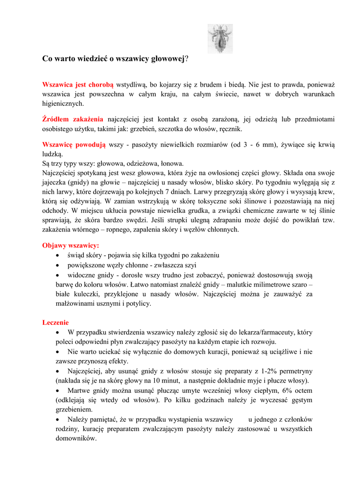 Co warto wiedzieć o wszawicy głowowej? Wszawica jest chorobą wstydliwą, bo kojarzy się z brudem i biedą. Nie jest to prawda, ponieważ wszawica jest powszechna w całym kraju, na całym świecie, nawet w dobrych warunkach higienicznych. Źródłem zakażenia najczęściej jest kontakt z osobą zarażoną, jej odzieżą lub przedmiotami osobistego użytku, takimi jak: grzebień, szczotka do włosów, ręcznik. Wszawicę powodują wszy - pasożyty niewielkich rozmiarów (od 3 - 6 mm), żywiące się krwią ludzką. Są trzy typy wszy: głowowa, odzieżowa, łonowa. Najczęściej spotykaną jest wesz głowowa, która żyje na owłosionej części głowy. Składa ona swoje jajeczka (gnidy) na głowie – najczęściej u nasady włosów, blisko skóry. Po tygodniu wylęgają się z nich larwy, które dojrzewają po kolejnych 7 dniach. Larwy przegryzają skórę głowy i wysysają krew, którą się odżywiają. W zamian wstrzykują w skórę toksyczne soki ślinowe i pozostawiają na niej odchody. W miejscu ukłucia powstaje niewielka grudka, a związki chemiczne zawarte w tej ślinie sprawiają, że skóra bardzo swędzi. Jeśli strupki ulegną zdrapaniu może dojść do powikłań tzw. zakażenia wtórnego – ropnego, zapalenia skóry i węzłów chłonnych. Objawy wszawicy: świąd skóry - pojawia się kilka tygodni po zakażeniu powiększone węzły chłonne - zwłaszcza szyi widoczne gnidy - dorosłe wszy trudno jest zobaczyć, ponieważ dostosowują swoją barwę do koloru włosów. Łatwo natomiast znaleźć gnidy – malutkie milimetrowe szaro – białe kuleczki, przyklejone u nasady włosów. Najczęściej można je zauważyć za małżowinami usznymi i potylicy. Leczenie W przypadku stwierdzenia wszawicy należy zgłosić się do lekarza/farmaceuty, który poleci odpowiedni płyn zwalczający pasożyty na każdym etapie ich rozwoju. Nie warto uciekać się wyłącznie do domowych kuracji, ponieważ są uciążliwe i nie zawsze przynoszą efekty. Najczęściej, aby usunąć gnidy z włosów stosuje się preparaty z 1-2% permetryny (nakłada się je na skórę głowy na 10 minut, a następnie dokładnie myje i płucze włosy). Martwe gnidy można usunąć płucząc umyte wcześniej włosy ciepłym, 6% octem (odklejają się wtedy od włosów). Po kilku godzinach należy je wyczesać gęstym grzebieniem. Należy pamiętać, że w przypadku wystąpienia wszawicy u jednego z członków rodziny, kurację preparatem zwalczającym pasożyty należy zastosować u wszystkich domowników. Zapobieganie – wskazania profilaktyczne dla rodziców i dzieci Związywanie długich włosów lub krótkie fryzury ułatwiające pielęgnację skóry głowy i włosów. Używanie wyłącznie osobistych przyborów higienicznych do pielęgnacji włosów, Codzienne czesanie i szczotkowanie włosów, Mycie włosów w miarę potrzeb (nie rzadziej niż raz w tygodniu), Wyposażenie dzieci w środki higieniczne, takie jak szampony z odżywką ułatwiające rozczesywanie i wyczesywanie włosów, Systematyczne sprawdzanie czystości głowy i włosów oraz systematyczne kontrole w okresie uczęszczania dziecka do przedszkola, szkoły lub pobytu w internacie, sanatorium itp. Informacja opracowana na potrzeby działań Oddziału OZ i PZ PSSE w Krakowie na podstawie podręcznika J. Kostrzewski „Epidemiologia chorób zakaźnych” oraz dokument „Stanowisko Głównego Inspektora Sanitarnego dotyczące profilaktyki i zwalczania wszawicy”