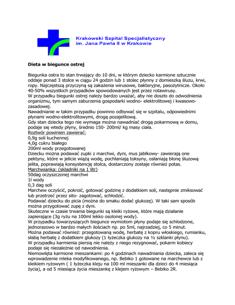 Dieta w biegunce ostrej Biegunka ostra to stan trwający do 10 dni, w którym dziecko karmione sztucznie oddaje ponad 3 stolce w ciągu 24 godzin lub 1 stolec płynny z domieszką śluzu, krwi, ropy. Najczęstszą przyczyną są zakażenia wirusowe, bakteryjne, pasożytnicze. Około 40-50% wszystkich przypadków spowodowanych jest przez rotawirusy. W przypadku biegunki ostrej należy bardzo uważać, aby nie doszło do odwodnienia organizmu, tym samym zaburzenia gospodarki wodno- elektrolitowej i kwasowozasadowej. Nawadnianie w takim przypadku powinno odbywać się w szpitalu, odpowiednimi płynami wodno-elektrolitowymi, drogą pozajelitową. Gdy stan dziecka tego nie wymaga można nawadniać drogą pokarmową w domu, podaje się wtedy płyny, średnio 150- 200ml/ kg masy ciała. Roztwór powinien zawierać: 0,9g soli kuchennej 4,0g cukru białego 200ml wody przegotowanej Dziecku można podawać zupki z marchwi, dyni, mus jabłkowy- zawierają one pektyny, które w jelicie wiążą wodę, pochłaniają toksyny, osłaniają błonę śluzową jelita, poprawiają konsystencję stolca, dostarczony zostaje również potas. Marchwianka: (składniki na 1 litr) 50dag oczyszczonej marchwi 1l wody 0,3 dag soli Marchew oczyścić, pokroić, gotować godzinę z dodatkiem soli, następnie zmiksować lub przetrzeć przez sito- zagotować, schłodzić. Podawać dziecku do picia (można do smaku dodać glukozę). W taki sam sposób można przygotować zupę z dyni. Skuteczne w czasie trwania biegunki są kleiki ryżowe, które mają działanie zapierające (3g ryżu na 100ml lekko osolonej wody). W przypadku towarzyszących biegunce wymiotom płyny podaje się schłodzone, jednorazowo w bardzo małych ilościach np. po 5ml, najrzadziej, co 5 minut. Można podawać również: przegotowaną wodę, herbatę z kopru włoskiego, rumianku, słabą herbatę z dodatkiem glukozy (1 łyżeczka glukozy na ½ szklanki płynu). W przypadku karmienia piersią nie należy z niego rezygnować, pokarm kobiecy podaje się niezależnie od nawodnienia. Niemowlęta karmione mieszankami: po 4 godzinach nawadniania dziecka, zaleca się wprowadzenie mleka modyfikowanego, np. Bebiko 1 gotowane na marchewce lub z kleikiem ryżowym ( 1 łyżeczka kleju na 100 ml mieszanki dla dzieci do 4 miesiąca życia), a od 5 miesiąca życia mieszankę z klejem ryżowym – Bebiko 2R. W przypadku, gdy biegunka nie ustępuje lub występuje nietolerancja na mleko należy wprowadzić preparaty mlekozastępcze-nisko- lub bezlaktozowe, jak: Nutramigen (1,2), Bebilon- pepti (1,2), Bebilon- pepti MCT (hydrolizaty białek serwatkowych). W wieku poniemowlęcym po 4-godzinnym nawadnianiu płynami omówionymi powyżej podajemy dziecku dietę łatwo strawną uwzględniającą produkty o działaniu zapierającym: tarte jabłko, ryż gotowany na wodzie, chudy rosół z białym rozdrobnionym mięsem, z kaszą kukurydzianą, płatkami ryżowymi, kisiel z czarnych jagód, marchewkę z mięsem, dynię. Wskazane są chude produkty białkowe: mięso, drób, jaja, sery twarogowe, jogurt. Źródłem węglowodanów powinny być produkty skrobiowe - ryż, drobne kasze, natomiast jasne pieczywo należy ograniczyć. Z diety należy wykluczyć: mleko słodkie, miody, dżemy, cukier, słodycze, soki słodzone, sok jabłkowy, coca- cole, gdyż zwiększają procesy fermentacyjne w jelicie nasilające biegunkę. Nie podaje się warzyw wzdymających, kapustnych, cebulowych, suchych nasion roślin strączkowych, Warzywa podaje się w postaci gotowanej i rozdrobnionej. Duże zastosowanie mają te z dużą zawartością pektyn (marchew, dynia). Z owoców najwięcej pektyn zawierają banany i jabłka. Do potraw stosuje się tłuszcze roślinne. Jadłospis diety biegunkowej, stosowany w Krakowskim Szpitalu Specjalistycznym im. Jana Pawła II: - śniadanie i kolacja: bułka z masłem roślinnym, herbata b/c - II śniadanie: chrupki kukurydziane - obiad: bulion z ryżem, ryż z jabłkiem, herbata b/c - podwieczorek: biszkopty Jadłospis diety pobiegunkowej, stosowany w Krakowskim Szpitalu Specjalistycznym im. Jana Pawła II: - śniadanie i kolacja: bułka z masłem roślinnym, szynka drobiowa, herbata b/c - II śniadanie, podwieczorek: j. w. - obiad: bulion z ryżem, pierś drobiowa (gotowana), ziemniaki lub ryż, marchewka, herbata b/c Następnie przechodzimy do diety łatwo strawnej dla dzieci. Literatura: H. Ciborowska, A. Rudnicka „Dietetyka Żywienie Zdrowego i Chorego Człowieka”.PZWL 2014