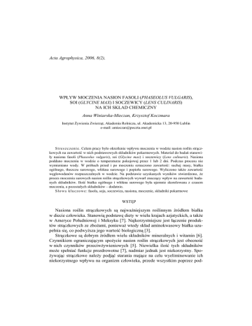 Acta Agrophysica, 2006, 8(2), WPŁYW MOCZENIA NASION FASOLI (PHASEOLUS VULGARIS), SOI (GLYCINE MAX) I SOCZEWICY (LENS CULINARIS) NA ICH SKŁAD CHEMICZNY Anna Winiarska-Mieczan, Krzysztof Koczmara Instytut śywienia Zwierząt, Akademia Rolnicza, ul. Akademicka 13, 20-950 Lublin e-mail: [email protected] S t r e s z c z e n i e . Celem pracy było określenie wpływu moczenia w wodzie nasion roślin strączkowych na zawartość w nich podstawowych składników pokarmowych. Materiał do badań stanowiły nasiona fasoli (Phaseolus vulgaris), soi (Glycine max) i soczewicy (Lens culinaris). Nasiona poddano moczeniu w wodzie o temperaturze pokojowej przez 1 lub 2 dni. Podczas procesu nie wymieniano wody. W próbach przed i po moczeniu oznaczono zawartość: suchej masy, białka ogólnego, tłuszczu surowego, włókna surowego i popiołu surowego. Wyliczono takŜe zawartość węglowodanów rozpuszczalnych w wodzie. Na podstawie uzyskanych wyników stwierdzono, Ŝe proces moczenia surowych nasion roślin strączkowych wywarł znaczący wpływ na zawartość badanych składników. Ilość białka ogólnego i włókna surowego była ujemnie skorelowana z czasem moczenia, a pozostałych składników – dodatnio. S ł o wa k l u c z o w e : fasola, soja, soczewica, nasiona, moczenie, składniki pokarmowe WSTĘP Nasiona roślin strączkowych są najwaŜniejszym roślinnym źródłem białka w diecie człowieka. Stanowią podstawę diety w wielu krajach azjatyckich, a takŜe w Ameryce Południowej i Meksyku [7]. Najkorzystniejsze jest łączenie produktów strączkowych ze zboŜami, poniewaŜ wtedy skład aminokwasowy białka uzupełnia się, co podwyŜsza jego wartość biologiczną [3]. Strączkowe są dobrym źródłem wielu składników mineralnych i witamin [6]. Czynnikiem ograniczającym spoŜycie nasion roślin strączkowych jest obecność w nich czynników przeciwŜywieniowych [5]. Niewielka ilość tych składników moŜe spełniać funkcje prozdrowotne [7], nadmiar jednak jest niekorzystny. SpoŜywając strączkowe naleŜy podjąć starania mające na celu wyeliminowanie ich niekorzystnego wpływu na organizm człowieka, przede wszystkim poprzez pod- 538 A. WINIARSKA-MIECZAN, K. KOCZMARA danie nasion róŜnym procesom fizycznym, które mają równieŜ na celu podwyŜszenie ich wartości Ŝywieniowej. NaleŜy jednak pamiętać, Ŝe zbyt drastyczna obróbka, a szczególnie procesy termiczne, mogą wywoływać niekorzystne zmiany w białku. Celem pracy było określenie wpływu czasu moczenia nasion fasoli (Phaseolus vulgaris), soi (Glycine max) i soczewicy (Lens culinaris) na zawartość w nich podstawowych składników pokarmowych. MATERIAŁ I METODY Materiał do badań stanowiły nasiona fasoli (Phaseolus vulgaris), soi (Glycine max) i soczewicy (Lens culinaris), pochodzące z komercyjnego źródła. Surowe nierozdrobnione nasiona poddano procesowi moczenia w nieprzegotowanej wodzie o temperaturze pokojowej przez 1 dzień (24 godziny) lub 2 dni (48 godzin). Podczas procesu nie wymieniano wody. Następnie nasiona poddano działaniu temperatury 60oC przez 48 godzin, aby oznaczyć w nich wielkość współczynnika podsuszania. Podsuszone nasiona rozdrobniono w młynku laboratoryjnym. W przygotowanym materiale oznaczono zawartość: suchej masy, białka ogólnego, popiołu surowego oraz włókna surowego standardowymi metodami AOAC [2], tłuszczu surowego natomiast za pomocą aparatu SER 148 firmy Panalytica, przepłukując materiał heksanem. Wyliczono takŜe zawartość węglowodanów rozpuszczalnych w wodzie (BAW). Wszystkie analizy wykonano w trzech powtórzeniach. Uzyskane wyniki poddano analizie wariancji stosując program komputerowy STATISTICA. Obliczono średni błąd standardowy (SEM) oraz korelację między czasem moczenia nasion a zawartością w nich wybranych składników chemicznych. Istotność róŜnic między średnimi dla grup wyliczono za pomocą testu Dunkana. WYNIKI I DYSKUSJA Moczenie w wodzie nasion roślin strączkowych ma na celu skrócenie czasu obróbki termicznej produktu. Podczas tego procesu, na skutek pęcznienia białek i węglowodanów, masa i objętość nasion ulegają zwiększeniu. Szybkość i stopień pęcznienia jest cechą odmianową, ale zaleŜy teŜ od czasu moczenia i temperatury wody [7, 13]. Podczas procesu moczenia zachodzą procesy absorpcji i adsorpcji [13], co wpływa na skład chemiczny nasion. W tabeli 1 przedstawiono wpływ czasu moczenia nasion fasoli, soi i soczewicy na zawartość w nich suchej masy, białka ogólnego, tłuszczu surowego, włókna surowego i popiołu surowego. Proces moczenia wpłynął istotnie na zmianę proporcji pomiędzy badanymi składnikami pokarmowymi (rys. 1). Tabela 1. Zawartość podstawowych składników chemicznych w moczonych nasionach fasoli, soi i soczewicy, g·kg-1 s.m. Table 1. Proximate chemical composition of the soaking kidney bean, soybean and lentil seeds, g kg-1 D.M. Składniki pokarmowe Nutrients content Nasiona fasoli – Kidney bean seeds Surowe Raw Moczone (dni) Soaking (days) 1 2 Sucha masa Dry matter 861,6a 938,2b 932,7b NS 24,7 Białko ogólne Crude protein 231,3a 245,6b 227,2a -0,26 Tłuszcz surowy Crude fat 22,7c 9,5a 14,0b Włókno surowe Crude fibre 34,5a 39,4b Popiół surowy Crude ash 44,4b 34,1a r SEM Nasiona soi – Soybean seeds Surowe Raw Moczone (dni) Soaking (days) r Nasiona soczewicy – Lentil seeds SEM Surowe Raw Moczone (dni) Soaking (days) 1 2 r SEM 941,2b NS 16,1 262,0b 260,8b NS 3,1 3,7a 3,7a 9,3b +0,50 1,9 13,9 34,7 34,1 31,1 NS 1,1 3,3 24,7b 18,9a 23,7b +0,50 1,8 1 2 933,3 951,0 938,0 NS 5,3 889,6a 934,0b 5,6 369,0ab 385,0b 333,0a -0,50 15,4 252,2a +0,50 3,9 186,1a 216,1ab 222,7b +0,62 11,3 39,8b NS 1,7 135,3c 89,3a 99,5b +0,50 33,1a NS 3,6 53,6b 43,6a 44,2a NS a, b, c – P≤ 0,05, SEM – średni błąd standardowy – standard error of the means, r –współczynnik korelacji – correlation, NS – nieistotne - nonsignificant. 540 A. WINIARSKA-MIECZAN, K. KOCZMARA %
