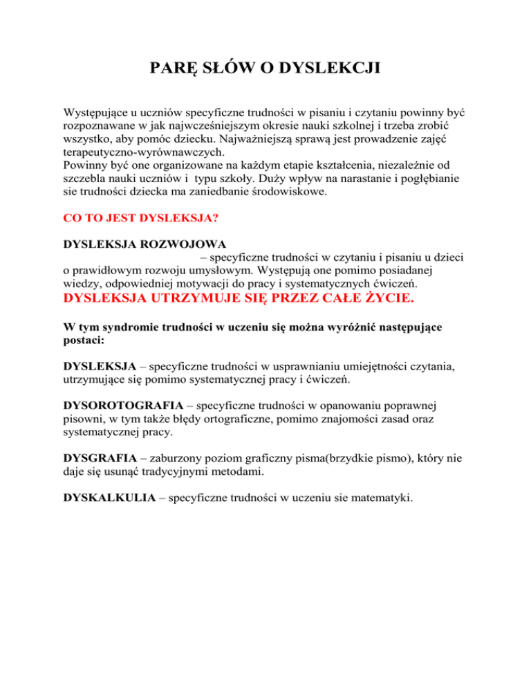 PARĘ SŁÓW O DYSLEKCJI Występujące u uczniów specyficzne trudności w pisaniu i czytaniu powinny być rozpoznawane w jak najwcześniejszym okresie nauki szkolnej i trzeba zrobić wszystko, aby pomóc dziecku. Najważniejszą sprawą jest prowadzenie zajęć terapeutyczno-wyrównawczych. Powinny być one organizowane na każdym etapie kształcenia, niezależnie od szczebla nauki uczniów i typu szkoły. Duży wpływ na narastanie i pogłębianie sie trudności dziecka ma zaniedbanie środowiskowe. CO TO JEST DYSLEKSJA? DYSLEKSJA ROZWOJOWA – specyficzne trudności w czytaniu i pisaniu u dzieci o prawidłowym rozwoju umysłowym. Występują one pomimo posiadanej wiedzy, odpowiedniej motywacji do pracy i systematycznych ćwiczeń. DYSLEKSJA UTRZYMUJE SIĘ PRZEZ CAŁE ŻYCIE. W tym syndromie trudności w uczeniu się można wyróżnić następujące postaci: DYSLEKSJA – specyficzne trudności w usprawnianiu umiejętności czytania, utrzymujące się pomimo systematycznej pracy i ćwiczeń. DYSOROTOGRAFIA – specyficzne trudności w opanowaniu poprawnej pisowni, w tym także błędy ortograficzne, pomimo znajomości zasad oraz systematycznej pracy. DYSGRAFIA – zaburzony poziom graficzny pisma(brzydkie pismo), który nie daje się usunąć tradycyjnymi metodami. DYSKALKULIA – specyficzne trudności w uczeniu sie matematyki. Rodzaje dyskalkulii Ladislav Košč (słowacki neuropsycholog) dokonał klasyfikacji dyskalkulii na kilka typów Dyskalkulia werbalna (słowna) ujawnia się w postaci zaburzeń zdolności nazywania pojęć i relacji matematycznych, trudności z określaniem liczby obiektów, problemów z nazywaniem cyfr i numerów. Dyskalkulia leksykalna (związana z czytaniem) to zaburzenie odczytywania symboli matematycznych, cyfr, liczb i znaków operacyjnych, trudności w kojarzeniu symboli operacyjnych (+, -, x, ≤, ≥) z ich nazwami. Dyskalkulia graficzna objawia się trudnościami w zapisywaniu liczb i symboli operacyjnych, problemami z zapisem liczb przy pisemnym dodawaniu i odejmowaniu, mnożeniu i dzieleniu. Dyskalkulia wykonawcza polega na zaburzeniu manipulowania realnymi lub obrazkowymi obiektami w celach matematycznych - obliczania liczebności zbioru, porównywanie ilości i wielkości, trudnościach z uszeregowaniem obiektów wg kolejności rosnącej lub malejącej, problemach z wskazywaniem, który z porównywanych obiektów jest mniejszy, większy, które obiekty są tej samej wielkości. Dyskalkulia pojęciowo-poznawcza to zaburzenie rozumienia idei matematycznych, relacji niezbędnych do dokonywania obliczeń pamięciowych, dziecko wykazuje trudności w dostrzeganiu zależności liczbowych (np. 6 to połowa 12). Dyskalkulia operacyjna jest zaburzeniem dotyczącym dokonywania działań matematycznych mimo możliwości wzrokowo-przestrzennych oraz umiejętności czytania i pisania liczb. Objawy dyskalkulii nieumiejętność wykonywania elementarnych działań na materiale liczbowym (dodawania, odejmowania, dzielenia, mnożenia) wtórny zanik zdolności myślenia logicznego na materiale liczbowym ogólne problemy w dedukcji, rozumowaniu, analizowaniu i wyciąganiu wniosków z działań matematycznych ataki nerwicowe lub stresowe przed wykonywaniem działań matematycznych Objawy, które można zaobserwować w życiu powszednim: problemy z odczytywaniem poprawnej godziny z zegarka zapominanie następnego etapu jakiejś operacji błędy "nieuwagi" trudności w rozumieniu języka matematycznego liczenie na palcach trudności w odczytywaniu map częste naciskanie złych przycisków w kalkulatorze uczeń wydaje się rozumieć temat na lekcji, ale nie umie samodzielnie pojąć go w domu trudności w kontynuowaniu rozpoczętych procesów matematycznych ROZWOJOWA GŁEBOKA DYSLEKSJA - bardzo poważne zaburzenia w uczeniu się technik szkolnych. Rokowania dotyczące postępów są bardzo nikłe ze względu na głębokość zaburzeń percepcyjno-motorycznych. Dysleksja rozwojowa spowodowana jest zaburzeniami rozwoju niektórych funkcji poznawczych, motorycznych i ich współdziałania, uwarunkowanymi nieprawidłową strukturą i funkcjonowaniem centralnego układu nerwowego. Są to zaburzenia głównie funkcji językowych, jak i innych funkcji percepcyjnomotoryczny, a więc spostrzegania (wzrokowego, słuchowego, dotykowokinestetycznego), motoryki, uwagi, pamięci (wzrokowej, słuchowej, ruchowej), lateralizacji (orientacji w schemacie własnego ciała i przestrzeni). Dzieci „ryzyka dysleksji” to dzieci z rodzin, gdzie występowała dysleksja, z nieprawidłowej ciąży i porodu, nieharmonijnie rozwijające sie, z nasilonymi trudnościami w czytaniu i pisaniu. Im wcześniej zostaną rozpoznane i objęte opieką (ćwiczeniami logopedycznymi, korekcyjnokompensacyjnymi) tym większe szanse, aby zapobiec ich trudnościom szkolnym lub je zmniejszyć. PROBLEMY DYSLEKTYKÓW: Trudności w czytaniu i pisaniu Trudności w nauce języków obcych Matematyka (np. tabliczka mnożenia) Geometria (np. widzenie przestrzenne) Geografia (np. orientacja na mapie) Chemia (np. symbolika) Historia (np. chronologia wydarzeń, daty) Biologia (np. złożone nazewnictwo) Wych. Fizyczne (np. wolne tempo wykonywania czynności manualnych, nieudolność w grach zręcznościowych) Rysunek (prymitywny, niedokończony, linie grube, mocne i niepewne) SYMPTOMY RYZYKA DYSLEKSJI Uczeń: 1.CZYTANIE ędnia znaków przestankowych łoski i sylaby o podobnym brzmieniu ż głośno ść ści z zapamiętaniem czytanych tekstów w tekście 2.PISANIE ędy ortograficzne przy pisaniu ze słuchu wynikające z kłopotów w dokonywaniu analizy dźwięków dyktowanych wyrazów ści ści w wyodrębnianiu wyrazów w zdaniu ę w dwuznakach, zmiękczeniach i grupach spółgłosek ści w różnicowaniu głosek nosowych: „ą”, „ę” źwięczne i bezdźwięczne ńczenia wyrazów ści w przenoszeniu wyrazów z linijki do linijki ści w pisaniu tekstów samodzielnych (liczne błędy gramatyczne i skróty) żony poziom gr