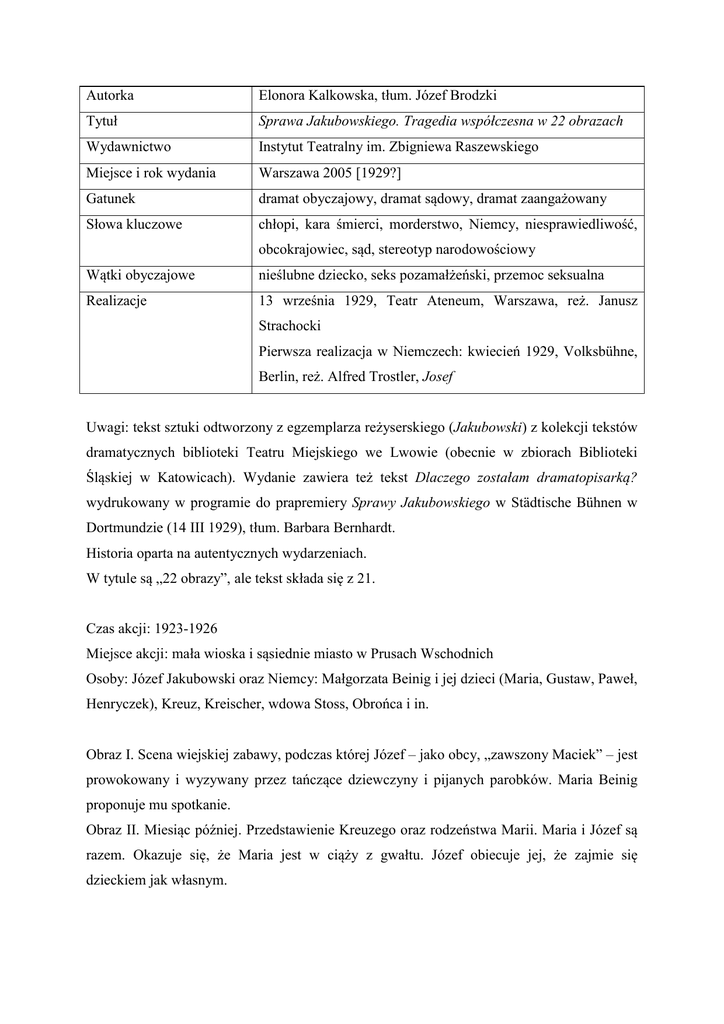 Autorka Elonora Kalkowska, tłum. Józef Brodzki Tytuł Sprawa Jakubowskiego. Tragedia współczesna w 22 obrazach Wydawnictwo Instytut Teatralny im. Zbigniewa Raszewskiego Miejsce i rok wydania Warszawa 2005 [1929?] Gatunek dramat obyczajowy, dramat sądowy, dramat zaangażowany Słowa kluczowe chłopi, kara śmierci, morderstwo, Niemcy, niesprawiedliwość, obcokrajowiec, sąd, stereotyp narodowościowy Wątki obyczajowe nieślubne dziecko, seks pozamałżeński, przemoc seksualna Realizacje 13 września 1929, Teatr Ateneum, Warszawa, reż. Janusz Strachocki Pierwsza realizacja w Niemczech: kwiecień 1929, Volksbühne, Berlin, reż. Alfred Trostler, Josef Uwagi: tekst sztuki odtworzony z egzemplarza reżyserskiego (Jakubowski) z kolekcji tekstów dramatycznych biblioteki Teatru Miejskiego we Lwowie (obecnie w zbiorach Biblioteki Śląskiej w Katowicach). Wydanie zawiera też tekst Dlaczego zostałam dramatopisarką? wydrukowany w programie do prapremiery Sprawy Jakubowskiego w Städtische Bühnen w Dortmundzie (14 III 1929), tłum. Barbara Bernhardt. Historia oparta na autentycznych wydarzeniach. W tytule są „22 obrazy”, ale tekst składa się z 21. Czas akcji: 1923-1926 Miejsce akcji: mała wioska i sąsiednie miasto w Prusach Wschodnich Osoby: Józef Jakubowski oraz Niemcy: Małgorzata Beinig i jej dzieci (Maria, Gustaw, Paweł, Henryczek), Kreuz, Kreischer, wdowa Stoss, Obrońca i in. Obraz I. Scena wiejskiej zabawy, podczas której Józef – jako obcy, „zawszony Maciek” – jest prowokowany i wyzywany przez tańczące dziewczyny i pijanych parobków. Maria Beinig proponuje mu spotkanie. Obraz II. Miesiąc później. Przedstawienie Kreuzego oraz rodzeństwa Marii. Maria i Józef są razem. Okazuje się, że Maria jest w ciąży z gwałtu. Józef obiecuje jej, że zajmie się dzieckiem jak własnym. Obraz III. Dwa lata później. Józef gra z Kreuzem i Gustawem w kości – szczęście mu sprzyja. Wyjaśnia, dlaczego nie wrócił do Polski po wojnie (nie starczyłoby ziemi dla wszystkich braci). Maria choruje. Kreuz namawia Józefa do kradzieży desek. Stara się go też przekonać do swojej siostry. Obraz IV. Maria umiera. Jej matka Małgorzata próbuje uwieść Józefa, a gdy Polak odmawia, przysięga mu zemstę. Obraz V. Kreuz skradł deski, ale tylko Józef – który stał na czatach – poszedł do więzienia. Kreuz, Gustaw i Kreischer obmyślają morderstwo Oswaldka (synka Marii). Sugestia, że to Gustaw, brat Marii, jest jego ojcem. Obraz VI. Józef obiecuje wdowie Stossowej, swojej nowej kochance, że odda Oswaldka do innej wsi. Józef i Stossowa planują ślub. Obraz VII. Kreuz, Gustaw i Kreischer wybierają na bagnach miejsce, gdzie utopić Oswaldka. Decydują, że najpierw trzeba będzie dziecko udusić. Obraz VIII. Józef z przerażeniem opowiada Stossowej, że od kilku godzin nikt nie widział Oswalda. Obraz IX. Strażnik zabiera Józefa do miasta na przesłuchanie. Józef jest dobrej myśli, wierzy, że niemiecki sąd wyjaśni sprawę. Obraz X. Stossowa okłamuje sąsiadkę, że ledwo znała Józefa. Przytakuje jej, że Józef, „Polake”, pewnie utopił dziecko. Obraz XI. Józef poznaje w celi Grunda, który w zaufaniu przyznaje mu się, że zabił własną matkę. Józef utrzymuje, że jest niewinny. Obraz XII. Józef rozmawia w celi z obrońcą, który próbuje mu wytłumaczyć wagę alibi. Polak jednak nie chce mu powiedzieć, gdzie był (u Stossowej), gdy zamordowano dziecko. Obrońca uprzedza Józefa, że będzie traktowany przez sąd jak „obcy”, Józef nie daje się przekonać. Obraz XIII. Chata Beinigów. Pijana rodzina ustala zeznania. Małgorzata każe wszystkim mówić w sądzie źle o Józefie, m.in. kłamać, że często bił Oswalda (o którego w rzeczywistości bardzo dbał). Obraz XIV. Józef nie chce powiedzieć przewodniczącemu sądu, gdzie był i co robił, gdy doszło do zabójstwa. Prosi również o tłumacza, ponieważ słabo rozumie niemiecki; prośba nie zostaje uwzględniona przez sąd. Na niekorzyść Józefa zeznają Małgorzata, Spiessowa, Kreuz. Obraz XV. Przewodniczący sądu, Prokurator, Sędzia i przysięgli przy stoliku restauracyjnym dyskutują o procesie. Są przekonani, że dziecko zabił człowiek „zdziczały i pierwotny”, a więc Polak, ponieważ żaden Niemiec nie byłby zdolny do takiej zbrodni. Obraz XVI. Kolejni świadkowie zeznają przeciwko Józefowi. Niedorozwinięty brat Marii, Henryczek, „identyfikuje” Józefa jako mężczyznę, który zabrał Oswalda z domu. Na korzyść Józefa zeznaje tylko Redlich, u którego Polak służył; jego zeznania zostają jednak wyłączone z procesu. Prokurator i Obrońca wygłaszają mowy końcowe. Sąd po naradzie uznaje Józefa winnym i skazuje go na śmierć. Obraz XVII. Obrońca obiecuje Józefowi, że będzie dalej walczył o jego uniewinnienie. Józef jest załamany wyrokiem i całym postępowaniem sądowym. Okazuje się również, że Kreuz przyznał się mu do morderstwa. Józef jednak zachował tę informację dla siebie, ponieważ nie chciał być „Judaszem”. Obraz XVIII. Józef prosi Dozorcę, aby wypuścił go na „spacer”. Dozorca odmawia. Obraz XIX. Józefowi śni się Matka. Robi synowi wymówki, że zapomniał o rodzinie. Józef wciąż liczy, że Anna przyjdzie do więzienia i sama powie prawdę. Obraz XX. Obrońca żegna się z Józefem, ponieważ żadne apelacje nie przyniosły skutku. Józefa pociesza Ksiądz. Obraz XXI. Tuż przed egzekucją Józef na pytanie Księdza zapewnia o swojej niewinności. Dozorca, słysząc ostatni krzyk skazańca, pada na kolana i sam krzyczy „Zabiliście niewinnego człowieka!... Mordercy!”. Autorka Eleonora Kalkowska, tłum. Barbara Bernhardt Tytuł Doniesienia drobne. Fragment współczesności Wydawnictwo Instytut Teatralny im. Zbigniewa Raszewskiego Miejsce i rok wydania Warszawa 2005 [1932] Gatunek dramat obyczajowy, dramat zaangażowany Słowa kluczowe bezrobocie, bieda, kryzys gospodarczy, krzywda 