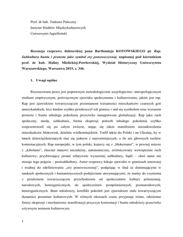 Prof. dr hab. Tadeusz Paleczny Instytut Studiów Międzykulturowych Uniwersytet Jagielloński Recenzja rozprawy doktorskiej pana Bartłomieja KOTOWSKIEGO pt. Rap. Subkultura buntu i protestu jako symbol ery ponowoczesnej, napisanej pod kierunkiem prof. dr hab. Haliny Mielickiej-Pawłowskiej, Wydział Historyczny Uniwersytetu Warszawskiego, Warszawa 2015, s. 346. 1. Uwagi ogólne Recenzowana praca jest poprawnym metodologicznie socjologiczno- antropologicznym studium empirycznym, poświęconym zjawisku społecznemu i kulturowemu, jakim jest rap. Rap jest zjawiskiem towarzyszącym przemianom tożsamości mieszkańców czarnych gett amerykańskich, lecz bardzo szybko przekroczył ich granice i stał się symbolem oraz wyrazem protestu i buntu młodego pokolenia przeciwko następstwom globalizacji. Rap jako ruch społeczny, moda, subkultura, forma ekspresji potrzeb młodego pokolenia szybko rozprzestrzenił się po całym świecie, stając się także manifestem niezadowolenia mieszkańców blokowisk, dzielnic wielkomiejskich. Trafił także do Polski i na Ukrainę, by w latach dziewięćdziesiątych stać się jednym z najważniejszych, o ile nie głównych ruchów kontestacyjnych. Rap europejski, w tym polski, kojarzy się z „blokersami”, w pewnej mierze z „kibolami”, chociaż stanowi niezależny, autonomiczny, zróżnicowany wewnętrznie ruch kulturowy, przybierający postać relatywnie wyrazistej subkultury, bądź – choć autor nie stosuje tego pojęcia – postsubkultury. Autor rozprawy lokuje zjawisko w granicach umownej i trudnej do zdefiniowania „ery ponowoczesnej”, podążając w ślad za dominującymi w naukach społecznych i humanistycznych podejściami utrzymującymi, że mamy do czynienia z przełomem towarzyszącym przechodzeniu od społeczeństw kultury piśmiennej, narodowych, homogenicznych, do społeczeństw postpiśmiennych, postnarodowych, heterogenicznych. Bunt młodzieży, konflikt pokoleń jest zjawiskiem stale towarzyszącym dynamice przemian kulturowych. W różnych okresach czasu przyjmuje różne, odmienne formy ekspresji i mechanizmy manifestacji przyczyn kontestacji i buntu młodzieży przeciwko sztywnym normom kulturowym. 1 Autor formułuje już w tytule tezę, że mamy do czynienia z subkulturą, chociaż w pierwszym zdaniu Wstępu konstatuje, że rap to „ruch kulturowy i gatunek muzyczny”. Niezależnie od przyjętej perspektywy teoretycznej i metodologicznej, pan Bartłomiej Kotowski zdaje sobie jednak dobrze sprawę ze złożoności, niejednorodności zjawiska rapu, przyjmując zarazem – z powodu jak mniemam wymogów metodologicznych – ujęcie subkulturowe. Rap natomiast bywa interpretowany na wiele sposobów: jako ruch społeczny, moda, nurt i gatunek muzyczny, rodzaj sztuki, styl życia, forma aktywności ludycznej, ale także jako subkultura. Szkoda zarazem, że autor wytyczając granice zjawiska w kontekście postnowoczesności, nie podjął próby zinterpretowania natury rapu w kategoriach postsubkultury. Pojęcie „postsubkultura” , stosunkowo jeszcze rzadkie w polskiej humanistyce, pojawia się w języku antropologii poststrukturalistycznej służąc do określania zjawisk, które są następstwem przemian kultury masowej w warunkach globalizacji, skoku technologicznego, szybkich, dynamicznych przemian kultur narodowych w postnarodowe, piśmiennych w postpiśmienne, nowoczesnych w ponowoczesne. Na gruncie rodzimych ujęć w pedagogice, socjologii, psychologii czy etnologii wciąż stosowane są pojęcia subkultury bądź kontrkultury młodzieżowej. Alternatywny, odmienny sposób realizacji potrzeb kulturowych przybiera postać autotelicznych, symbolicznych formacji młodzieżowych, które wyróżnia z kulturowego i społecznego kontekstu nie tylko wiek, ale przede wszystkich styl życia uczestników i rodzaj ich aktywności muzycznej, ludycznej. Niejednokrotnie także stosuje się w odniesieniu do nich określenie „subkultury okołomuzyczne”, gdyż jednym z ich głównych wyróżników jest związek z którymś z najnowszych nurtów muzyki już nie pop czy rock, lecz cyber, techno bądź właśnie hip-hop oraz rap. Gatunek muzyczny związany z konfliktami pomiędzy będącymi w istocie rzeczy zbiorowościami terytorialnymi, środowiskowymi, młodzieżowymi, nosi od tamtego czasu nazwę gangsta-rap. Ten motyw stał się bardzo popularny wśród polskich raperów, którzy utożsamiają swe położenie z sytuacją uciskanych, czarnych i latynoamerykańskich mniejszości. Rap stał się muzyką pokoleniową, kultową, ukazał także swoją społeczną siłę w latach dziewięćdziesiątych, gdy przy różnych okazjach - poczynając od procesu uniewinniającego policjantów, którzy pobili czarnoskórego Rodneya Kinga w 1992 roku mobilizował młodzież do walki z policją i systemem sprawiedliwości. Hasłem przewodnim rapu stało się „No justice, no peace”. To w tym czasie muzyka czarnego getta rozprzestrzeniła się na inne społeczności, w tym białą młodzież w niższych lub średnich warstw społecznych. Rap ewoluował, wyłaniając nowe rodzaje muzyki. Generalnie jednak uczestnicy ruchu 2 społecznego i subkultury rap wyróżniali się ze społecznego kontekstu skłonnością do protestu, buntu, kontestowania i kwestionowania zasad funkcjonowania systemu normatywnego. Ta demonstracja frustracji, agresji, buntu, łączy pokolenie raperów z pierwszej dekady dwudziestego pierwszego wieku z uczestnikami dwudziestowiecznych, kontestacyjnych subkultur młodzieżowych. Przedmiotem rozprawy jest rap w Polsce i na Ukrainie. W bardziej zaś szczegółowym ujęciu język tekstów artykułowanych przez przedstawicieli tej subkultury. Ambicją autora nie jest wszakże dokonanie monograficznego opisu subkultury, lecz oparta o badania uczestników i sympatyków wielowymiarowa analiza podłoża i przejawów buntu. Problem pracy sprowadza się zaś moim zdaniem do odkrycia natury tego buntu, poprzez analizę treści i znaczeń 