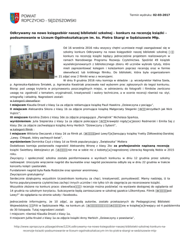 Termin wydruku: 02-03-2017 Odkrywamy na nowo księgozbiór naszej biblioteki szkolnej – konkurs na recenzję książki – podsumowanie w Liceum Ogólnokształcącym im. ks. Piotra Skargi w Sędziszowie Młp. Od 16 września 2016 roku wszyscy chętni uczniowie mogli zaangażować się w szkolny konkurs Odkrywamy na nowo księgozbiór naszej biblioteki szkolnej ጀ konkurs na recenzję książki będący jednocześnie projektem realizowanym w ramach Narodowego Programu Rozwoju Czytelnictwa. Spośród 49 książek wyselekcjonowanych z bibliotecznego zbioru 40 uczniów wybrało tytuły, które mieli zaprezentować kolegom i koleżankom poprzez recenzję oraz w formie sleeveface1 lub krótkiego filmiku. Do biblioteki, która była organizatorem przedsięwzięcia, wpłynęły 23 prace: 21 zdjęć oraz 2 filmiki wraz z recenzjami. W dniu 9 grudnia 2016 roku komisja w składzie : p. wicedyrektor Halina Szela, p. Agnieszka-Kędziora Śmiałek, p. Agnieszka Kwaśniak pracowała nad wyborem prac zgłoszonych do tegoż konkursu. Biorąc pod uwagę kryteria w przyznawaniu poszczególnych miejsc, w odniesieniu do fotografii i filmików zwrócono uwagę na: zgodność z tematem, oryginalność, kreatywność i walory techniczne, a w ocenie recenzji również na: styl, ortografię i składnię. Nagrodzeni zostali: w kategorii sleeveface: I miejscem Klaudia Drozd z klasy 1a za zdjęcie reklamujące książkę Pauli Hawkins „Dziewczyna z pociągu”, II miejscem Aleksandra Sikora z klasy 1b za zdjęcie promujące książkę Małgorzaty Stegenki Ḁ一愀 skrzydłach jak Nick Vujicic”, III miejscem Karolina Ziobro z klasy 3de za zdjęcie propagujące „Pamiętnik” Nicholasa Sparksa, wyróżnieniem: Julia Siepierska z klasy 1a za zdjęcie polecające Ḁ一愀 krawędzi nigdy ᴀ Jessici Redmerski i Emilia Saj z klasy 2bc za zdjęcie zachwalające książkę Anny Herbich ”Dziewczyny z Syberii”, w kategorii filmik : I miejscem Wiktoria Owczarek z klasy 2d za filmik pt. Ḁ䜀搀稀椀攀 jest Lewy? ᴀ lansujący książkę Yvetty Żółtowskiej-Darskiej „Lewy. Chłopak, który zachwycił świat”, wyróżnieniem Dominika Czyż z klasy 1d za filmik popularyzujący „Świętoszka” Moliera Dodatkowo komisja postanowiła nagrodzić Aleksandrę Wronę z klasy 2bc za profesjonalnie napisaną recenzję książki Swietłany Aleksijewicz pt. Ḁ圀漀樀渀愀 nie ma w sobie nic z kobiety ᴀ nagrodzonej Literacką Nagrodą Nobla w 2015 roku. Zwycięzcy i społeczność szkolna została poinformowana o wynikach konkursu w dniu 12 grudnia przez szkolny radiowęzeł. Uroczyste wręczenie nagród dla laureatów oraz nagród pocieszenia odbyło się w dniu 22 grudnia w trakcie koncertu kolęd i pastorałek. Fundatorem nagród była Rada Rodziców oraz sponsor anonimowy. Zwycięzcom gratulujemy! Serdecznie dziękujemy wszystkim Uczestnikom konkursu za chęci, kreatywność, pomysłowość. Mamy nadzieję, iż ta forma popularyzowania czytelnictwa zachęci innych uczniów i nie tylko ich do sięgnięcia po recenzowane książki. Wszystkie złożone na konkurs prace: sleeveface ᤀ礀 i recenzje można podziwiać na wystawie dostępnej do oglądania od 14 grudnia na szkolnym korytarzu. Sukcesywnie będą zamieszczane w szkolnej gazetce LOkomitywa. Filmik Ḁ䜀搀稀椀攀 jest Lewy?” do oglądania na stronie szkoły i facebooku. Jednocześnie informujemy, że 10 zdjęć, za zgodą autorów, zostało przekazanych do Pedagogicznej Biblioteki Wojewódzkiej ጀ Filii w Sędziszowie Młp. na konkurs pt. Ḁ匀氀攀攀瘀攀昀愀挀攀 ጀ Ḁ唀戀椀攀爀稀 się w książkę ᴀ trwający od 4 października do 30 listopada. Tutaj nagrodzeni zostali: I miejscem: również Klaudia Drozd z klasy 1a, II miejscem Julita Krużel z klasy 1a za zdjęcie książki Anny Herbich „Dziewczyny z powstania”, http://www.spropczyce.pl/page/show/1224,odkrywamy-na-nowo-ksiegozbior-naszej-biblioteki-szkolnej-konkurs-narecenzje-ksiazki-podsumowanie-w-liceum-ogolnoksztalcacym-im-ks-piotra-skargi-w-sedziszowie-mlp- III miejscem Martyna Branach z klasy 1c za fotografię pozycji Waris Dirie „Safa. Nie okaleczajcie mnie”, wyróżnieniem Karolina Ziobro z klasy 3de za sleeveface powieści Nicholasa Sparksa „Pamiętnik”. Gratulujemy! Zapraszamy wszystkich do obejrzenia wystawy pokonkursowej i czytania. Organizatorki Agnieszka Kędziora-Śmiałek, Agnieszka Kwaśniak, Elżbieta Skotniczny *1 sleeveface to zdjęcie, którego elementem jest okładka książki, wmontowana w ten sposób, że widoczna jest jako część ciała, bądź sylwetki, stanowiąca spójną całość. To nowoczesny, kreatywny sposób na popularyzację czytelnictwa. publikacja: 22-12-2016 , aktualizacja: 22-12-2016, autor: Elżbieta Jasek Galeria zdjęć http://www.spropczyce.pl/page/show/1224,odkrywamy-na-nowo-ksiegozbior-naszej-biblioteki-szkolnej-konkurs-narecenzje-ksiazki-podsumowanie-w-liceum-ogolnoksztalcacym-im-ks-piotra-skargi-w-sedziszowie-mlp-