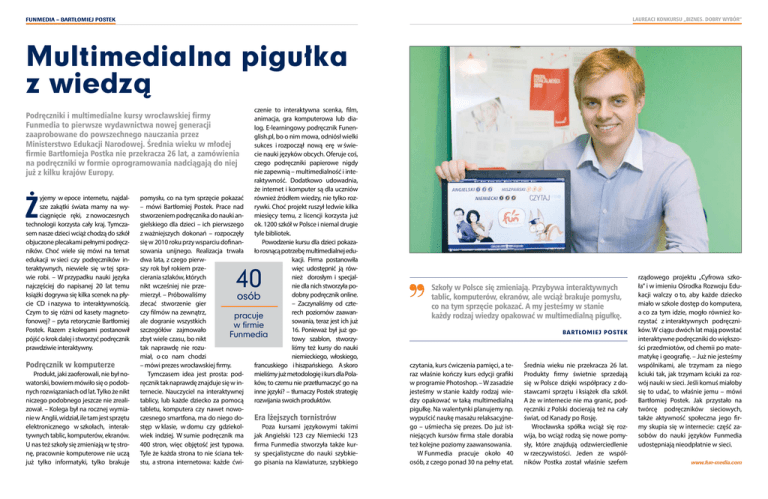 Laureaci konkursu „Biznes. Dobry wybór” funmedia – Bartłomiej Postek Multimedialna pigułka z wiedzą czenie to interaktywna scenka, film, animacja, gra komputerowa lub dialog. E-learningowy podręcznik Funenglish.pl, bo o nim mowa, odniósł wielki sukces i rozpoczął nową erę w świecie nauki języków obcych. Oferuje coś, czego podręczniki papierowe nigdy nie zapewnią – multimedialność i interaktywność. Dodatkowo udowadnia, że internet i komputer są dla uczniów pomysłu, co na tym sprzęcie pokazać również źródłem wiedzy, nie tylko roz– mówi Bartłomiej Postek. Prace nad rywki. Choć projekt ruszył ledwie kilka stworzeniem podręcznika do nauki anmiesięcy temu, z licencji korzysta już gielskiego dla dzieci – ich pierwszego ok. 1200 szkół w Polsce i niemal drugie z ważniejszych dokonań – rozpoczęły tyle bibliotek. się w 2010 roku przy wsparciu dofinanPowodzenie kursu dla dzieci pokazasowania unijnego. Realizacja trwała ło rosnącą potrzebę multimedialnej edudwa lata, z czego pierwkacji. Firma postanowiła szy rok był rokiem przewięc udostępnić ją rówcierania szlaków, których nież dorosłym i specjalnikt wcześniej nie przenie dla nich stworzyła pomierzył. – Próbowaliśmy dobny podręcznik online. osób zlecać stworzenie gier – Zaczynaliśmy od czteczy filmów na zewnątrz, rech poziomów zaawanpracuje ale dogranie wszystkich sowania, teraz jest ich już w firmie szczegółów zajmowało 16. Ponieważ był już goFunmedia zbyt wiele czasu, bo nikt towy szablon, stworzytak naprawdę nie rozuliśmy też kursy do nauki miał, o co nam chodzi niemieckiego, włoskiego, – mówi prezes wrocławskiej firmy. francuskiego i hiszpańskiego. A skoro Tymczasem idea jest prosta: podmieliśmy już metodologię i kurs dla Polaręcznik tak naprawdę znajduje się w inków, to czemu nie przetłumaczyć go na ternecie. Nauczyciel na interaktywnej inne języki? – tłumaczy Postek strategię tablicy, lub każde dziecko za pomocą rozwijania swoich produktów. tabletu, komputera czy nawet nowoEra lżejszych tornistrów czesnego smartfona, ma do niego doPoza kursami językowymi takimi stęp w klasie, w domu czy gdziekoljak Angielski 123 czy Niemiecki 123 wiek indziej. W sumie podręcznik ma firma Funmedia stworzyła także kur400 stron, więc objętość jest typowa. sy specjalistyczne do nauki szybkieTyle że każda strona to nie ściana tekgo pisania na klawiaturze, szybkiego stu, a strona internetowa: każde ćwi- Podręczniki i multimedialne kursy wrocławskiej firmy Funmedia to pierwsze wydawnictwa nowej generacji zaaprobowane do powszechnego nauczania przez Ministerstwo Edukacji Narodowej. Średnia wieku w młodej firmie Bartłomieja Postka nie przekracza 26 lat, a zamówienia na podręczniki w formie oprogramowania nadciągają do niej już z kilku krajów Europy. Ż yjemy w epoce internetu, najdalsze zakątki świata mamy na wyciągnięcie ręki, z nowoczesnych technologii korzysta cały kraj. Tymczasem nasze dzieci wciąż chodzą do szkół objuczone plecakami pełnymi podręczników. Choć wiele się mówi na temat edukacji w sieci czy podręczników interaktywnych, niewiele się w tej sprawie robi. – W przypadku nauki języka najczęściej do napisanej 20 lat temu książki dogrywa się kilka scenek na płycie CD i nazywa to interaktywnością. Czym to się różni od kasety magnetofonowej? – pyta retorycznie Bartłomiej Postek. Razem z kolegami postanowił pójść o krok dalej i stworzyć podręcznik prawdziwie interaktywny. Podręcznik w komputerze Produkt, jaki zaoferowali, nie był nowatorski, bowiem mówiło się o podobnych rozwiązaniach od lat. Tylko że nikt niczego podobnego jeszcze nie zrealizował. – Kolega był na rocznej wymianie w Anglii, widział, ile tam jest sprzętu elektronicznego w szkołach, interaktywnych tablic, komputerów, ekranów. U nas też szkoły się zmieniają w tę stronę, pracownie komputerowe nie uczą już tylko informatyki, tylko brakuje 40 Szkoły w Polsce się zmieniają. Przybywa interaktywnych tablic, komputerów, ekranów, ale wciąż brakuje pomysłu, co na tym sprzęcie pokazać. A my jesteśmy w stanie każdy rodzaj wiedzy opakować w multimedialną pigułkę. Bartłomiej Postek czytania, kurs ćwiczenia pamięci, a teraz właśnie kończy kurs edycji grafiki w programie Photoshop. – W zasadzie jesteśmy w stanie każdy rodzaj wiedzy opakować w taką multimedialną pigułkę. Na walentynki planujemy np. wypuścić naukę masażu relaksacyjnego – uśmiecha się prezes. Do już istniejących kursów firma stale dorabia też kolejne poziomy zaawansowania. W Funmedia pracuje około 40 osób, z czego ponad 30 na pełny etat. Średnia wieku nie przekracza 26 lat. Produkty firmy świetnie sprzedają się w Polsce dzięki współpracy z dostawcami sprzętu i książek dla szkół. A że w internecie nie ma granic, podręczniki z Polski docierają też na cały świat, od Kanady po Rosję. Wrocławska spółka wciąż się rozwija, bo wciąż rodzą się nowe pomysły, które znajdują odzwierciedlenie rzeczywistości. Jeden ze wspólw ników Postka został właśnie szefem rządowego projektu „Cyfrowa szkoła” i w imieniu Ośrodka Rozwoju Edukacji walczy o to, aby każde dziecko miało w szkole dostęp do komputera, a co za tym idzie, mogło również korzystać z interaktywnych podręczników. W ciągu dwóch lat mają powstać interaktywne podręczniki do większości przedmiotów, od chemii po matematykę i geografię. – Już nie jesteśmy wspólnikami, ale trzymam za niego kciuki tak, jak trzymam kciuki za rozwój nauki w sieci. Jeśli komuś miałoby się to udać, to właśnie jemu – mówi Bartłomiej Postek. Jak przystało na twórcę podręczników sieciowych, także aktywność społeczna jego firmy skupia się w internecie: część zasobów do nauki języków Funmedia udostępniają nieodpłatnie w sieci. www.fun-media.com