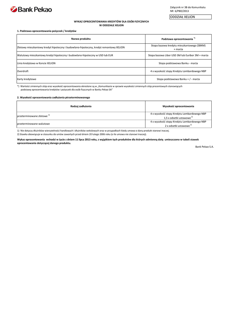 Załącznik nr 3B do Komunikatu NR 6/PBD/2013 ODDZIAŁ XELION WYKAZ OPROCENTOWANIA KREDYTÓW DLA OSÓB FIZYCZNYCH W ODDZIALE XELION 1. Podstawa oprocentowania pożyczek / kredytów Nazwa produktu Złotowy mieszkaniowy kredyt hipoteczny i budowlano-hipoteczny, kredyt remontowy XELION Walutowy mieszkaniowy kredyt hipoteczny i budowlano-hipoteczny w USD lub EUR Linia kredytowa w Koncie XELION Podstawa oprocentowania *) Stopa bazowa kredytu mieszkaniowego (SBKM) + marża Stopa bazowa Libor USD 3M lub Euribor 3M + marża Stopa podstawowa Banku - marża Overdraft 4 x wysokość stopy Kredytu Lombardowego NBP Karty kredytowe Stopa podstawowa Banku + / - marża *) Wartości zmiennych stóp oraz wysokość oprocentowania okreslone są w „Komunikacie w sprawie wysokości zmiennych stóp procentowych stanowiących podstawę oprocentowania kredytów i pożyczek dla osób fizycznych w Banku Pekao SA” 2. Wysokość oprocentowania zadłużenia ptrzeterminowanego Rodzaj zadłużenia przeterminowane złotowe 1) przeterminowane walutowe Wysokość oprocentowania 4 x wysokość stopy Kredytu Lombardowego NBP 1,5 x odsetki ustawowe 2) 4 x wysokość stopy Kredytu Lombardowego NBP 2 x odsetki ustawowe 2) 1) Nie dotyczy dłużników wierzytelności handlowych i dłużników wekslowych oraz w przypadkach kiedy umowa o dany produkt stanowi inaczej. 2) Stawka obowiązuje w stosunku do umów zawartych przed dniem 20 lutego 2006 roku (o ile umowa nie stanowi inaczej). Wykaz oprocentowania wchodzi w życie z dniem 11 lipca 2013 roku, z wyjątkiem tych produktów dla których odmienną datę umieszczono w tabeli stawek oprocentowania dotyczącej danego produktu. Bank Pekao S.A.