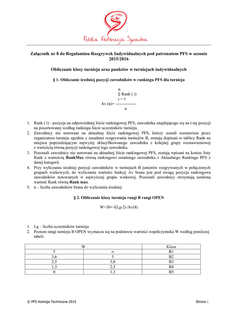 Załącznik nr 8 do Regulaminu Rozgrywek Indywidualnych pod patronatem PFS w sezonie 2015/2016 Obliczanie klasy turnieju oraz punktów w turniejach indywidualnych § 1. Obliczanie średniej pozycji zawodników w rankingu PFS dla turnieju n Σ Rank ( i) i=1 Av (n)= --------------n 1. Rank ( i) - pozycja na odpowiedniej liście rankingowej PFS, zawodnika znajdującego się na i-tej pozycji na posortowanej według rankingu liście uczestników turnieju. 2. Zawodnicy nie notowani na aktualnej liście rankingowej PFS, którzy zostali rozstawieni przez organizatora turnieju zgodnie z zasadami rozgrywania turniejów B, zostają dopisani w tablicy Rank na miejscu poprzedzającym najwyżej sklasyfikowanego zawodnika z kolejnej grupy rozstawieniowej z wartością równą pozycji rankingowej tego zawodnika. 3. Pozostali zawodnicy nie notowani na aktualnej liście rankingowej PFS, zostają wpisani na koniec listy Rank z wartością RankMax równą rankingowi ostatniego zawodnika z Aktualnego Rankingu PFS z danej kategorii. 4. Przy wyliczaniu średniej pozycji zawodników w turniejach B juniorów rozgrywanych w połączonych grupach wiekowych, do wyliczania wartości funkcji Av brana jest pod uwagę pozycja rankingowa zawodników notowanych w najwyższej grupie wiekowej. Pozostali zawodnicy otrzymują ustaloną wartość Rank równą Rank max. 5. n – liczba zawodników brana do wyliczenia średniej § 2. Obliczanie klasy turnieju rangi B rangi OPEN W=30×√(Lg-2) ⁄Av(8) 1. Lg – liczba uczestników turnieju 2. Poziom rangi turnieju B OPEN wyznacza się na podstawie wartości współczynnika W według poniższej tabeli: W 5 3,6 2,5 1,3 0 © PFS Komisja Techniczna 2015 ∞ 5 3,6 2,5 1,3 Klasa B1 B2 B3 B4 B5 Strona 1 § 3. Obliczanie klasy Turnieju rangi B kobiet i juniorów W=30×√(Lg-2) ⁄Av(4) 1. Lg – liczba uczestników turnieju 2. Klasę turnieju rangi B damskiego i juniorów wyznacza się na podstawie wartości współczynnika W według poniższej tabeli: W Klasa ∞ 6 4 3 2 6 4 3 2 0 B1 B2 B3 B4 B5 § 4. Obliczanie ilości punktów w turniejach indywidualnych OPEN Zawodnik zdobywa w turnieju ilość P(mz) punktów obliczaną według następującego wzoru: P(mz)=Tmax⋅(1/√mz + 1,05(1-mz))/2 1. mz – miejsce zajęte przez zawodnika w turnieju, 2. Tmax – liczba punktów za pierwsze miejsce w turnieju § 5. Obliczanie ilości punktów w turniejach indywidualnych damskich i juniorów Zawodnik zdobywa w turnieju ilość P(mz) punktów obliczaną według następującego wzoru: P(mz)=Tmax⋅((1/√mz + 1,05(1-mz))/2)⋅(Lg-mz+Δ+1)/(Lg+Δ) 1. mz – miejsce zajęte przez zawodnika w turnieju, 2. Tmax – liczba punktów za pierwsze miejsce w turnieju 3. Lg – liczba uczestników turnieju. Dla turnieju rangi IMP Lg nie może być mniejsza od 32. Dla Turnieju rangi A Lg nie może być mniejsza od 16. 4. Δ = 4 § 6. Tabela wartości Tmax dla poszczególnych rang (i ich poziomów) turniejów Ranga IMP A B0 B1 © PFS Komisja Techniczna 2015 Tmax 1500 750 365 320 Strona 2 B2 B3 B4 B5 C0 C © PFS Komisja Techniczna 2015 275 230 185 140 120 100 Strona 3