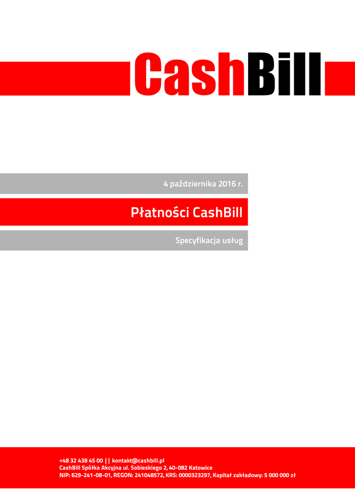 4 października 2016 r. Płatności CashBill Specyfikacja usług +48 32 438 45 00 || [email protected] CashBill Spółka Akcyjna ul. Sobieskiego 2, 40-082 Katowice NIP: 629-241-08-01, REGON: 241048572, KRS: 0000323297, Kapitał zakładowy: 5 000 000 zł Płatności CashBill Spis treści 1 O CashBill......................................................................................................................................... 3 2 Kanały płatności............................................................................................................................. 4 2.1 Przelewy bankowe (mechanizm Pay-By-Link)..........................................................................................4 2.2 Przelewy bankowe........................................................................................................................................5 2.3 Optymalizacja prowizji..................................................................................................................................6 2.4 Niedopłaty w przelewach.............................................................................................................................7 2.5 Linki płatności................................................................................................................................................7 2.6 Karty kredytowe i debetowe........................................................................................................................7 2.7 PayPal.............................................................................................................................................................7 3 Rozliczenia....................................................................................................................................... 7 4 Przebieg płatności.......................................................................................................................... 8 5 Rozwiązania autorskie i dedykowane........................................................................................... 8 5.1 Rozwiązania dedykowane............................................................................................................................8 5.2 Integracja z SMS Premium...........................................................................................................................9 2 Płatności CashBill 1 O CashBill Płatności CashBill to system szybkich i bezpiecznych płatności elektronicznych. Szeroka oferta kanałów płatniczych jest na bieżąco aktualizowana o nowe usługi płatnicze, dzięki integracjom z kolejnymi bankami oraz dostawcami alternatywnych form płatności. Stały monitoring systemu oraz całodobowy nadzór techniczny daje gwarancje prawidłowego działania usług 24 godziny na dobę. Od 2013 roku CashBill S.A. działa jako Krajowa Instytucja Płatnicza pod nadzorem KNF, natomiast już 4 lata wcześniej spółka została Agentem Rozliczeniowym pod nadzorem NBP. Jej kapitał zakładowy wynosi 5 000 000 PLN. W związku z powyższym, bezpieczeństwo i stabilność współpracy są gwarantem jakości, charakteryzującym współpracę z CashBill S.A. Elastyczność finansowa dowolna liczba wypłat zgromadzonych środków wypłata środków zgodna z zasadą D+1 możliwość automatycznej wypłaty środków Relacje z Akceptantem sukcesywnie staramy się uatrakcyjniać warunki współpracy, poprzez np. renegocjację stawek w instytucjach pośredniczących doceniamy wartość kontaktu bezpośredniego wspieramy wdrażanie nowych rozwiązań i usług, zarówno od strony technicznej, jak i formalnej jesteśmy otwarci na wszelkie sugestie i propozycje, mające na celu ulepszanie usług firmy CashBill jak i indywidualnej współpracy z Akceptantem 3 Płatności CashBill 2 Kanały płatności 2.1 Przelewy bankowe (mechanizm Pay-By-Link) BLIK mTransfer Płacę z Inteligo Płacę z iPKO Płać z ING Przelew z BPH Polski Standard Płatności mBank Inteligo PKO BP ING Bank Śląski Pocztowy24 Przelew 24 BZ WBK Pekao 24 Przelew Płacę z Alior Bank Alior Bank Getin Noble Bank e-płatność eBGŻ BGŻ BNP Paribas Płacę z Idea Bank Noble Bank Open Online Bank Pocztowy Bank PEKAO BGŻ BNP Paribas Getin Noble Bank Przelew online CA Bank Credit Agricole Płatności natychmiastowe Paysafecard PeoPay Bank Pekao Bank Zachodni WBK BGŻ BNP Paribas Open Finance eurobank płatność online Bank BPH db Transfer Deutsche Bank PBC Getin Bank Idea Bank Płać z BOŚ Bank Bank Ochrony Środowiska eurobank Płacę z Plus Bank Płacę z PBS T-Mobile Usługi Bankowe Bank BPS Płatności natychmiastowe PBS Bank Spółdzielcza Grupa Banków Plus Bank Alior Bank PayPal 4 Płatności CashBill 2.2 Przelewy bankowe ING Bank Śląski mBank Alior Bank Bank BPH Bank Millennium Bank Ochrony Środowiska Bank PEKAO Bank Pocztowy Bank Spółdzielczy we Wschowie Bank Zachodni WBK BIZ Bank BGŻ BNP Paribas BRE Bank Credit Agricole Bank Polska Deutsche Bank PBC Getin Bank Idea Bank neoBANK PKO BP Plus Bank PBS Bank Raiffeisen Polbank T-Mobile Usługi Bankowe Toyota Bank Polska Volkswagen Bank Polska 5 Płatności CashBill 2.3 Optymalizacja prowizji Mechanizm ten pozwala na określenie parametrów optymalizacji prowizji w panelu administracyjnym CashBill. Wiele kanałów płatności dostępnych jest w dwóch wariantach natychmiastowym i klasycznym. Użycie kanałów natychmiastowych wiąże się z większymi prowizjami, lecz wyróżnia się przede wszystkim mniejszym czasem na zaksięgowanie przelewu. Dzięki optymalizacji prowizji, korzystając z zakładki "Kanały płatności" w konfiguracji nowo uruchamianego sklepu internetowego można określić, które z kanałów będą udostępnione użytkownikowi sklepu w danym momencie. W ten sposób można dostosować ofertę CashBill do specyfiki konkretnego sklepu. Od właściciela sklepu zależy, czy wpłaty będą księgowane natychmiast, czy też prowizje zostaną obniżon