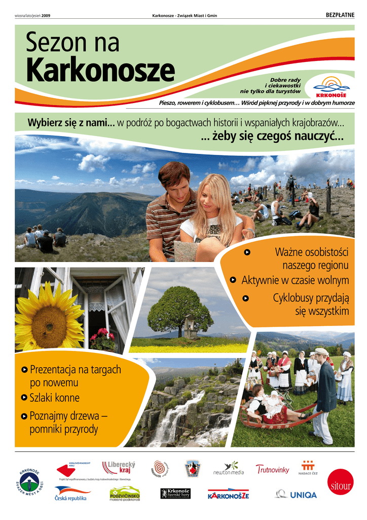 BEZPŁATNE Karkonosze - Związek Miast i Gmin wiosna/lato/jesień 2009 Sezon na Karkonosze Dobre rady i ciekawostki nie tylko dla turystów Pieszo, rowerem i cyklobusem… Wśród pięknej przyrody i w dobrym humorze Wybierz się z nami... w podróż po bogactwach historii i wspaniałych krajobrazów... ... żeby się czegoś nauczyć... Ważne osobistości naszego regionu Aktywnie w czasie wolnym Cyklobusy przydają się wszystkim Prezentacja na targach po nowemu Szlaki konne Poznajmy drzewa – pomniki przyrody Projekt był współfinansowany z budżetu kraju kralowohradeckiego i libereckiego. Strona 2 Karkonosze - Związek Miast i Gmin wiosna/lato/jesień 2009 Prezentacja targowa „po nowemu” W tym roku kraj kralowohradecki oraz region Karkonosze wraz z przedgórzem po raz pierwszy zaprezentowały się wspólnie. Związek Krkonoše – svazek měst a obcí promocję i prezentację najwyższych czeskich gór przygotował w ścisłej współpracy z kolegami z tutejszych ośrodków informacji. Odbywające się w Brnie krajowe targi turystyczne „Regiontour“ rokrocznie zaznaczamy w swoich kalendarzach na czerwono. W tym roku odbywały się w dniach 15 – 18 stycznia. W tym samym terminie można było uzyskać identyczne informacje na innych targach – w holenderskim Utrechcie. Pod koniec stycznia przedstawiciele Karkonoszy wyruszyli na prezentację do Drezna, Na potrzeby targów krajowych „Regiontour” w Brnie po raz pierwszy zaprezentowana została dwupoziomowa ekspozycja z dużą, bo mającą 182 m², przestrzenią wystawienniczą. Ekspozycja sfinansowana została z budżetu kraju kralowohradeckiego. Dominującym motywem był model najwyższej góry Czech – Śnieżki. Tuż koło jej szczytu na wyciągu krzesełkowym przedstawiono figurkę narciarza. Pod wspólnym dachem spotkali się przedstawiciele kraju kralowohradeckiego oraz regionów turystycznych Karkonosze + Podkrkonoší, Góry Orlickie + Podorlicko, Region Hradecki, Region Kłodzki. Zaprezentowano także tradycyjną produkcję ozdób choinkowych, biżuterii i rurek z kremem. Wystawiono panele z fotografiami, wyświetlano filmy. Gościem specjalnym ekspozycji był w tym roku wyjątkowo piękny okaz orła przedniego z ZOO Dvůr Králové nad Labem. Foto: Daniela Roudná. Współwystawiającym partnerem targów „Regiontour” w Brnie był region Podzvičinsko wraz z miastami Hořice i Dvůr Králové, ogrodem zoologicznym Dvůr Králové oraz uzdrowiskiem borowinowym Anenské slatinné lázně, a.s. Program towarzyszący przedstawiała firma produkująca oryginalne rurki z kremem – Pravé Hořické Trubičky s.r.o., a także wytwarzająca szklane ozdoby choinkowe firma Rautis z miejscowości Poniklá oraz pani Roudná ze swoją ręcznie wykonywaną miedzianą biżuterią. Ekspozycję kraju kralowohradeckiego odwiedził pan Lubomír Franc, hetman (czeski odpowiednik marszałka – przyp. tłum.) tego kraju. Foto: Jan Petera. zaś na początku lutego do Hamburga. W dniach 5 – 8 lutego Karkonosze wraz z przedgórzem zwanym Podkrkonoší „wyjechały“ do Pragi na Holiday Word. W tym samym terminie zaprezentowały się też we Wrocławiu podczas pierwszej edycji Międzynarodowych Targów Turystycznych. Marzec upłynął pod znakiem prezentacji w Berlinie (11 – 15 marca), Ostrawie (13 – 15 marca) i Wrocławiu (27 – 29 marca). W tym roku po raz pierwszy wykorzystano nowy model prezentowania turystycznych Trzydziestotysięczny gość ośrodka informacji RTIC Regionalny Ośrodek Informacji Turystycznej Karkonosze (Regionální turistické informační centrum Krkonoše, w skrócie RTIC) z siedzibą w Vrchlabí jest instytucją zajmującą się przepływem informacji na terenie całych Karkonoszy. Służy zarówno mieszkańcom tych terenów jak i turystom, a jej celem jest wspieranie rozwoju turystyki w tych najwyższych czeskich górach. Za jakość świadczonych usług odpowiedzialna jest regionalna organizacja turystyczna Związek Miast i Gmin Karkonosze (Krkonoše – svazek měst a obcí). Ośrodek informacji znajdziemy na parterze ratusza – narożnego budynku należącego do Urzędu Miejskiego Vrchlabí, na wychodzącej z rynku głównego ulicy Krkonošská. Jan Sobotka, burmistrz Vrchlabí i przewodniczący Związku Miast i Gmin Karkonosze, Klára Kroupová oraz dyrektorka Regionalnego Ośrodka Informacji Turystycznej Karkonosze wraz z gronem pracowników w czwartek 7 maja 2009 z radością przywitali trzydziestotysięcznego gościa ośrodka – panią Janę Paskovą z Vrchlabí. Pani Jana nagrodzona została podarunkami (figurką Ducha Gór, leczniczym winem ziołowym, domowym ciastem oraz materiałami promocyjnymi). Na pytanie, dlaczego zawitała do ośrodka informacji, odpowiedziała z uśmiechem, że przyszła wybrać prezent dla swojej koleżanki. Ze statystyk wynika, że podczas zeszłorocznych wakacji biuro informacyjne odwiedziło 45% turystów czeskojęzycznych, zaś 55% klientów pochodziło z zagranicy. W sezonie zimowym 2008/2009 ośrodek informacji odwiedziło 65 % turystów czeskojęzycznych oraz 35 % zagranicznych. regionów leżących na terenie dwóch czeskich województw – kraju kralowohradeckiego i libereckiego. Polega on na uproszczeniu kwestii administracyjno – finansowych między oboma krajami, na terenie których leżą Karkonosze. Michal Vávra ze Związku Karkonosze wyjaśnia: „Jest to logiczne. Vrchlabí, siedziba Związku Miast i Gmin, leży na terenie kraju kralowohradeckiego, a będący centrum Czeskiego Raju (Český ráj) Turnov – na terenie kraju libereckiego. Przede wszystkim pragniemy na jednym stoisku prezentować każdy region turystyczny jako całość, bez względu na „krajskie” granice. Dlatego kraj liberecki prezentuje Czeski Raj, Góry Izerskie oraz region Českolipsko, a kraj kralowohradecki – Karkonosze wraz z Podkrkonoším, Góry Orlickie wraz z przedgórzem (Podorlicko), Pogranicze Kłodzkie (Kladské pomezí, region Náchodsko) oraz Region Hrad