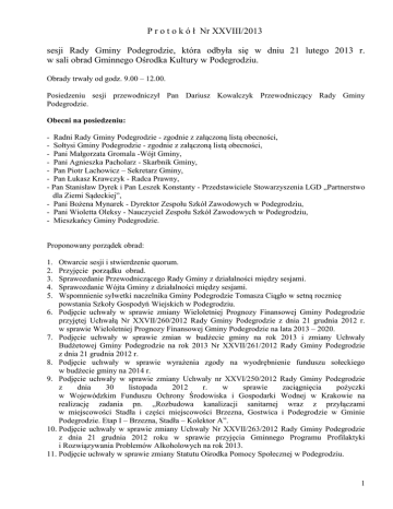 P r o t o k ó ł Nr XXVIII/2013 sesji Rady Gminy Podegrodzie, która odbyła się w dniu 21 lutego 2013 r. w sali obrad Gminnego Ośrodka Kultury w Podegrodziu. Obrady trwały od godz. 9.00 – 12.00. Posiedzeniu sesji przewodniczył Pan Dariusz Kowalczyk Przewodniczący Rady Gminy Podegrodzie. Obecni na posiedzeniu: - Radni Rady Gminy Podegrodzie - zgodnie z załączoną listą obecności, - Sołtysi Gminy Podegrodzie - zgodnie z załączoną listą obecności, - Pani Małgorzata Gromala -Wójt Gminy, - Pani Agnieszka Pacholarz - Skarbnik Gminy, - Pan Piotr Lachowicz – Sekretarz Gminy, - Pan Łukasz Krawczyk - Radca Prawny, - Pan Stanisław Dyrek i Pan Leszek Konstanty - Przedstawiciele Stowarzyszenia LGD „Partnerstwo dla Ziemi Sądeckiej”, - Pani Bożena Mynarek - Dyrektor Zespołu Szkół Zawodowych w Podegrodziu, - Pani Wioletta Oleksy - Nauczyciel Zespołu Szkół Zawodowych w Podegrodziu, - Mieszkańcy Gminy Podegrodzie. Proponowany porządek obrad: 1. 2. 3. 4. 5. Otwarcie sesji i stwierdzenie quorum. Przyjęcie porządku obrad. Sprawozdanie Przewodniczącego Rady Gminy z działalności między sesjami. Sprawozdanie Wójta Gminy z działalności między sesjami. Wspomnienie sylwetki naczelnika Gminy Podegrodzie Tomasza Ciągło w setną rocznicę powstania Szkoły Gospodyń Wiejskich w Podegrodziu. 6. Podjęcie uchwały w sprawie zmiany Wieloletniej Prognozy Finansowej Gminy Podegrodzie przyjętej Uchwałą Nr XXVII/260/2012 Rady Gminy Podegrodzie z dnia 21 grudnia 2012 r. w sprawie Wieloletniej Prognozy Finansowej Gminy Podegrodzie na lata 2013 – 2020. 7. Podjęcie uchwały w sprawie zmian w budżecie gminy na rok 2013 i zmiany Uchwały Budżetowej Gminy Podegrodzie na rok 2013 Nr XXVII/261/2012 Rady Gminy Podegrodzie z dnia 21 grudnia 2012 r. 8. Podjęcie uchwały w sprawie wyrażenia zgody na wyodrębnienie funduszu sołeckiego w budżecie gminy na 2014 r. 9. Podjęcie uchwały w sprawie zmiany Uchwały nr XXVI/250/2012 Rady Gminy Podegrodzie z dnia 30 listopada 2012 r. w sprawie zaciągnięcia pożyczki w Wojewódzkim Funduszu Ochrony Środowiska i Gospodarki Wodnej w Krakowie na realizację zadania pn. „Rozbudowa kanalizacji sanitarnej wraz z przyłączami w miejscowości Stadła i części miejscowości Brzezna, Gostwica i Podegrodzie w Gminie Podegrodzie. Etap I – Brzezna, Stadła – Kolektor A”. 10. Podjęcie uchwały w sprawie zmiany Uchwały Nr XXVII/263/2012 Rady Gminy Podegrodzie z dnia 21 grudnia 2012 roku w sprawie przyjęcia Gminnego Programu Profilaktyki i Rozwiązywania Problemów Alkoholowych na rok 2013. 11. Podjęcie uchwały w sprawie zmiany Statutu Ośrodka Pomocy Społecznej w Podegrodziu. 1 12. Podjęcie uchwały w sprawie zmiany Uchwały Nr 347/XLV/2010 Rady Gminy Podegrodzie z dnia 24 marca 2010 r. w sprawie zatwierdzenia Planu Odnowy Miejscowości Naszacowice na lata 2010 – 2018. 13. Podjęcie uchwały w sprawie przyjęcia Strategii Rozwoju Gminy Podegrodzie na lata 2013-2020. 14. Podjęcie uchwały w sprawie wyrażenia zgody na sprzedaż nieruchomości stanowiącej własność Gminy Podegrodzie położonej w miejscowości Podrzecze. 15. Podjęcie uchwały w sprawie wyrażenia zgody na nabycie nieruchomości gruntowej położonej w miejscowości Olszanka do gminnego zasobu nieruchomości. 16. Podjęcie uchwały w sprawie zmiany uchwały nr XXV/245/2012 Rady Gminy Podegrodzie z dnia 31 października 2012 r. w sprawie wyrażenia zgody na zawarcie z Ochotniczą Strażą Pożarną w Naszacowicach umowy użytkowania części nieruchomości wraz z częścią budynku, na czas nieoznaczony oraz wyrażenia zgody na odstąpienie od obowiązku przetargowego trybu zawarcia przedmiotowej umowy. 17. Podjęcie uchwały w sprawie upoważnienia Dyrektora Zakładu Gospodarki Komunalnej w Podegrodziu do załatwiania indywidualnych spraw z zakresu administracji publicznej. 18. Podjęcie uchwały w sprawie zmiany uchwały Nr XXVII/278/2012 Rady Gminy Podegrodzie z dnia 21 grudnia 2012 r. w sprawie określenia wzoru deklaracji o wysokości opłaty za gospodarowanie odpadami komunalnymi składanej przez właścicieli nieruchomości. 19. Podjęcie uchwały w sprawie przystąpienia do sporządzenia zmiany miejscowego planu zagospodarowania przestrzennego Gminy Podegrodzie. 20. Podjęcie uchwały w sprawie zatwierdzenia planów pracy Komisji Rady Gminy na 2013 rok. 21. Przyjęcie protokołu z poprzedniej sesji. 22. Interpelacje i zapytania radnych. 23. Wolne wnioski. Ad. 1 Otwarcie sesji i stwierdzenie quorum. Pan Dariusz Kowalczyk Przewodniczący Rady Gminy otwarł sesję Rady Gminy Podegrodzie, powitał serdecznie wszystkich obecnych, w tym gości z Zespołu Szkół Zawodowych w Podegrodziu, przedstawicieli LGD „Partnerstwo dla Ziemi Sądeckiej” oraz mieszkańców Gminy. Następnie na podstawie listy obecności stwierdził, że Rada Gminy ma wymagane prawem quorum do podejmowania prawomocnych decyzji. Ad. 2 Przyjęcie porządku obrad. Pan Dariusz Kowalczyk - Przew. RG - zapytał Panów Radnych czy są jakieś uwagi odnośnie zaproponowanego porządku obrad. Pan Stanisław Sikora - Radny - powiedział, że ma pewien dylemat, ponieważ punkt 12 dotyczy podjęcia uchwały w sprawie zmiany Uchwały Nr 347/XLV/2010 Rady Gminy Podegrodzie z dnia 24 marca 2010 r. w sprawie zatwierdzenia Planu Odnowy Miejscowości Naszacowice na lata 2010 – 2018, a punkt 13 podjęcia uchwały w sprawie przyjęcia Strategii Rozwoju Gminy Podegrodzie na lata 2013-2020. Zachodzi zatem pytanie czy nie powinna być odwrotna kolejność tych punktów, ponieważ plan odnowy jest związany ze Strategią Gminy Podegrodzie. Jego zdaniem wcześniej powinna być podjęta strategia, a następnie plan odnowy. Pani Małgorzata Gromala – Wójt – wyjaśniła, że w tym momencie nie ma to znaczenia, ponieważ Plan Odnowy Miejscowości przyjmowany jest oddzielnie dla konkretnej miejscowości i na pewno musi być spójny ze Strategią Rozwoju Gminy Podegrodzie. Dotychczas Gmina Podegrodzie nie m