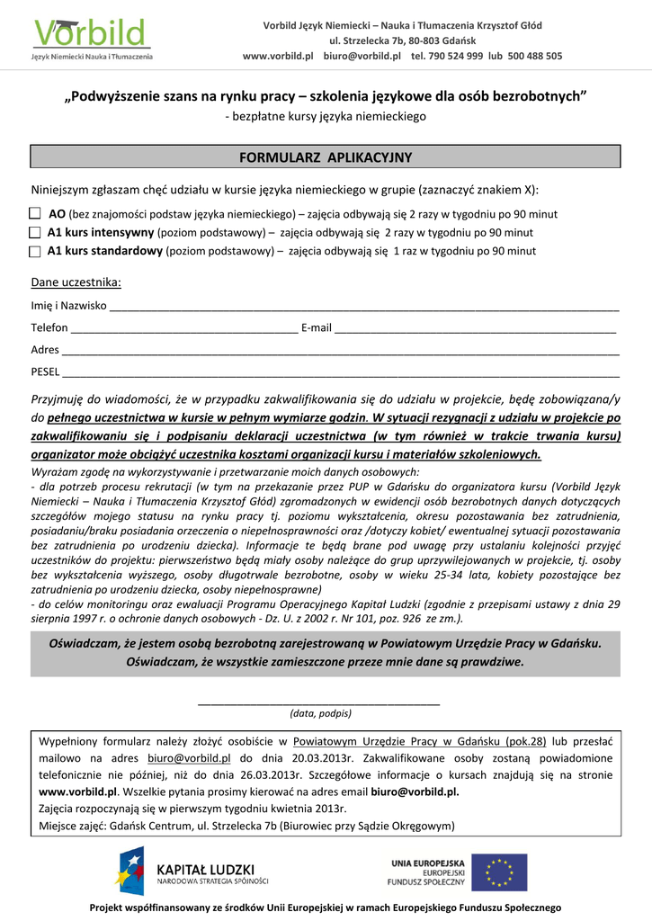 Vorbild Język Niemiecki – Nauka i Tłumaczenia Krzysztof Głód ul. Strzelecka 7b, 80-803 Gdańsk www.vorbild.pl [email protected] tel. 790 524 999 lub 500 488 505 „Podwyższenie szans na rynku pracy – szkolenia językowe dla osób bezrobotnych” - bezpłatne kursy języka niemieckiego FORMULARZ APLIKACYJNY Niniejszym zgłaszam chęć udziału w kursie języka niemieckiego w grupie (zaznaczyć znakiem X): AO (bez znajomości podstaw języka niemieckiego) – zajęcia odbywają się 2 razy w tygodniu po 90 minut A1 kurs intensywny (poziom podstawowy) – zajęcia odbywają się 2 razy w tygodniu po 90 minut A1 kurs standardowy (poziom podstawowy) – zajęcia odbywają się 1 raz w tygodniu po 90 minut Dane uczestnika: Imię i Nazwisko _____________________________________________________________________________________ Telefon ______________________________________ E-mail _______________________________________________ Adres _____________________________________________________________________________________________ PESEL _____________________________________________________________________________________________ Przyjmuję do wiadomości, że w przypadku zakwalifikowania się do udziału w projekcie, będę zobowiązana/y do pełnego uczestnictwa w kursie w pełnym wymiarze godzin. W sytuacji rezygnacji z udziału w projekcie po zakwalifikowaniu się i podpisaniu deklaracji uczestnictwa (w tym również w trakcie trwania kursu) organizator może obciążyć uczestnika kosztami organizacji kursu i materiałów szkoleniowych. Wyrażam zgodę na wykorzystywanie i przetwarzanie moich danych osobowych: - dla potrzeb procesu rekrutacji (w tym na przekazanie przez PUP w Gdańsku do organizatora kursu (Vorbild Język Niemiecki – Nauka i Tłumaczenia Krzysztof Głód) zgromadzonych w ewidencji osób bezrobotnych danych dotyczących szczegółów mojego statusu na rynku pracy tj. poziomu wykształcenia, okresu pozostawania bez zatrudnienia, posiadaniu/braku posiadania orzeczenia o niepełnosprawności oraz /dotyczy kobiet/ ewentualnej sytuacji pozostawania bez zatrudnienia po urodzeniu dziecka). Informacje te będą brane pod uwagę przy ustalaniu kolejności przyjęć uczestników do projektu: pierwszeństwo będą miały osoby należące do grup uprzywilejowanych w projekcie, tj. osoby bez wykształcenia wyższego, osoby długotrwale bezrobotne, osoby w wieku 25-34 lata, kobiety pozostające bez zatrudnienia po urodzeniu dziecka, osoby niepełnosprawne) - do celów monitoringu oraz ewaluacji Programu Operacyjnego Kapitał Ludzki (zgodnie z przepisami ustawy z dnia 29 sierpnia 1997 r. o ochronie danych osobowych - Dz. U. z 2002 r. Nr 101, poz. 926 ze zm.). Oświadczam, że jestem osobą bezrobotną zarejestrowaną w Powiatowym Urzędzie Pracy w Gdańsku. Oświadczam, że wszystkie zamieszczone przeze mnie dane są prawdziwe. _____________________________________ (data, podpis) Wypełniony formularz należy złożyć osobiście w Powiatowym Urzędzie Pracy w Gdańsku (pok.28) lub przesłać mailowo na adres [email protected] do dnia 20.03.2013r. Zakwalifikowane osoby zostaną powiadomione telefonicznie nie później, niż do dnia 26.03.2013r. Szczegółowe informacje o kursach znajdują się na stronie www.vorbild.pl. Wszelkie pytania prosimy kierować na adres email [email protected]. Zajęcia rozpoczynają się w pierwszym tygodniu kwietnia 2013r. Miejsce zajęć: Gdańsk Centrum, ul. Strzelecka 7b (Biurowiec przy Sądzie Okręgowym) Projekt współfinansowany ze środków Unii Europejskiej w ramach Europejskiego Funduszu Społecznego