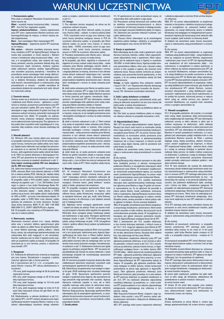 WARUNKI UCZESTNICTWA 1. Postanowienia ogólne: Przez u˝yte w niniejszych Warunkach Uczestnictwa okreÊlenia rozumie si´: Klient – uczestnik imprezy turystycznej (dalej – impreza), EPT – Euro Pol Tour, organizator wyjazdu, Impreza autokarowa/lotnicza – impreza organizowana przez EPT wraz z zapewnieniem Klientom przewozu autokarowego/lotniczego do miejsca, w którym impreza zosta∏a zorganizowana, Biuro – biuro sprzedajàce Wam imprez´/agent EPT, Agencja/Recepcja – zagraniczny partner EPT przyjmujàcy na miejscu, Si∏a wy˝sza – zdarzenie wywo∏ane przyczynà zewn´trznà, niezale˝ne od EPT lub Agencji/Recepcji, którego nie mo˝na by∏o przewidzieç w chwili zawarcia z Klientem umowy o Êwiadczenie us∏ug turystycznych (dalej – umowa), a w szczególnoÊci wojna, stan wojenny lub wyjàtkowy, zamieszki, rozruchy, powstania, blokady dróg, akty terrorystyczne, kl´ski ˝ywio∏owe, dzia∏ania organów w∏adz publicznych paƒstwa siedziby Agencji/Recepcji oraz wywo∏ane przyczynà zewn´trznà i niemo˝liwe do przewidzenia awarie powodujàce braki energii elektrycznej, wody lub ogrzewania, jak równie˝ powodujàce przerwy w dzia∏aniu klimatyzacji, dzia∏anie lub zaniechanie osób trzecich, nieuczestniczàcych w wykonywaniu us∏ug przewidzianych w umowie – wszelkie niemo˝liwe do przewidzenia dzia∏ania lub zaniechania tych osób, których nie mo˝na by∏o uniknàç. 2. Zawarcie umowy: Umow´ uwa˝a si´ za skutecznie zawartà po wype∏nieniu i podpisaniu przez Klienta umowy – zg∏oszenia o uczestnictwo w imprezie, jej pisemnym potwierdzeniu przez EPT oraz pod warunkiem wp∏aty 30% ceny imprezy. EPT ma obowiàzek w ciàgu maksymalnie 24 godzin (nie liczàc dni ustawowo wolnych od pracy), potwierdziç rezerwacj´ lub zaproponowaç inny obiekt. W przypadku nie zaakceptowania nowej propozycji nast´puje natychmiastowy zwrot wpłaconej kwoty rezerwacyjnej. Przy zg∏oszeniu nale˝y podaç dane wszystkich osób wyje˝d˝ajàcych tj. imi´, nazwisko, dat´ urodzenia, numer dowodu osobistego lub paszportu. 3. Warunki p∏atnoÊci: 3.1. Minimum 30% ceny imprezy płatne przy rezerwacji (w przypadku rezerwacji na mniej ni˝ 36 dni od daty rozpocz´cia turnusu, konieczna jest wp∏ata pe∏nej ceny imprezy). Zap∏ata reszty nale˝noÊci musi nastàpiç bez ponownego wezwania na co najmniej 36 dni przed rozpocz´ciem turnusu. JeÊli uzgodniona kwota wp∏aty zaliczki lub dop∏aty do 100% nie zostanie dokonana w obowiàzujàcym terminie, EPT jest uprawniony do rozwiàzania umowy i naliczenia kary umownej na zasadach okreÊlonych w pkt. 5. Ceny imprez zawierajà podatek VAT oraz ubezpieczenie KL, NW oraz baga˝u. 3.2. Je˝eli cena imprezy turystycznej EPT wyra˝ona jest w EURO, wówczas Klient mo˝e dokonaç płatnoÊci w EURO lub w walucie polskiej (PLN). Zaliczk´ jak i dopłat´ nale˝y uiÊciç w tej samej walucie, wybranej podczas rezerwacji. W przypadku wpłat w PLN wszelkie wpłaty i rozliczenia dokonuje si´ (zgodnie z par. 1 i 2 art. 358 Kodeksu Cywilnego) w oparciu o kurs Êredni Narodowego Banku Polskiego (publikowany na http://www.nbp.pl) obowiàzujàcy w dniu dokonania zapłaty – ka˝dà zaliczk´ w EURO przelicza si´ po kursie z dnia zapłaty zaliczki, ka˝dà dopłat´ do 100% w EURO – po kursie z dnia dokonania dopłaty. W przypadku wpłat w EURO Klient mo˝e dokonaç wpłaty gotówkà lub przelewem na konto dewizowe Touroperatora (konto dewizowe: IBAN: PL 63 1560 1108 0000 9060 0004 5712, SWIFT: GBGCPLPK) lub u Agenta. 3.3. W przypadku ceny wyra˝onej w PLN płatnoÊci dokonuje si´ w walucie polskiej. 4. Skierowania, vouchery: Skierowanie (voucher) zawiera m.in.: nazw´, dok∏adny adres wraz z numerem telefonu agencji/recepcji gdzie nale˝y si´ zg∏osiç po odbiór kluczy do apartamentu/pokoju, numer telefonu dy˝urnego, godziny odbioru i zdania kluczy, nazw´, typ wykupionego apartamentu/pokoju oraz maksymalnà iloÊç osób mogàcych w nim zamieszkaç. Voucher wydawany jest na oko∏o 2 tygodnie przed wyjazdem po uzupe∏nieniu wp∏aty za imprez´. W przypadku nie otrzymania go w w/w terminie, prosimy o natychmiastowy kontakt z EPT. 5. Rezygnacje: 5.1. Podstawà do obliczania kary umownej za rezygnacj´ jest cena imprezy. OÊwiadczenie o rezygnacji z podró˝y mo˝e byç zgłoszone tylko w formie pisemnej. 5.2. Z zastrze˝eniem pkt 5.3. i 5.4., w przypadku rezygnacji Klienta z imprezy, EPT nalicza odszkodowanie w wysokoÊci: – 10% ceny, je˝eli rezygnacja nastàpi do 36 dni przed datà rozpocz´cia turnusu, – 50% ceny, je˝eli rezygnacja nastàpi na 36-16 dni przed datà rozpocz´cia turnusu, – 70% ceny, je˝eli rezygnacja nastàpi na 15-9 dni przed datà rozpocz´cia turnusu, – 80 % ceny, je˝eli rezygnacja nastàpi na mniej ni˝ 9 dni przed datà rozpocz´cia turnusu lub gdy Klient nie dojedzie na miejsce. 5.3. Odszkodowanie, w zakresie okreÊlonym w pkt 5.2., jest nale˝ne EPT, o ile EPT zostanie obcià˝one przez Agencj´/Recepcj´ kosztami rezygnacji Klienta z imprezy w wysokoÊci odpowiadajàcej wysokoÊci takiego odszkodo- wania w zwiàzku z zaistnieniem okolicznoÊci okreÊlonych w pkt 5.2. 5.4. Uwaga: 1. Przy obliczaniu terminu rezygnacji nie wlicza si´ dni ustawowo wolnych od pracy. 2. W przypadku gdy Klient dokona∏ wp∏aty na poczet ceny imprezy (dalej – wp∏ata) w walucie polskiej (dalej – PLN), ewentualny zwrot na jego rzecz nale˝nej z tego tytu∏u kwoty pieni´˝nej nast´puje zawsze w PLN do wysokoÊci dokonanej wp∏aty; w przypadku gdy Klient dokona∏ wp∏aty na poczet ceny imprezy w walucie obcej (dalej – EURO), ewentualny zwrot na jego rzecz nale˝nej z tego tytu∏u kwoty pieni´˝nej nast´puje zawsze w EURO do wysokoÊci dokonanej wp∏aty. 3. Procedura przeniesienia przez Klienta praw i obowiàzków wynikajàcych z umowy na osob´ trzecià: a) W przypadku, gdy Klient, najpóêniej w momencie odstàpienia od umowy wska˝e osob´ trzecià (dalej – osoba wskazana przez Klienta) spe∏niajàc