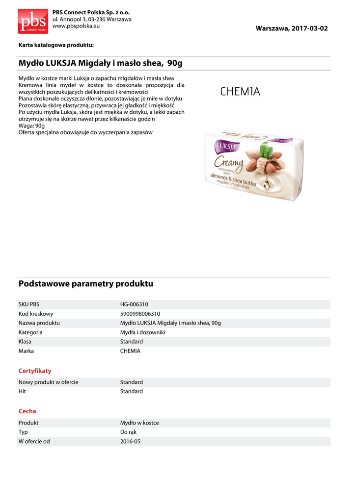 PBS Connect Polska Sp. z o.o. ul. Annopol 3, 03-236 Warszawa www.pbspolska.eu Karta katalogowa produktu: Mydło LUKSJA Migdały i masło shea, 90g Mydło w kostce marki Luksja o zapachu migdałów i masła shea Kremowa linia mydeł w kostce to doskonała propozycja dla wszystkich poszukujących delikatności i kremowości Piana doskonale oczyszcza dłonie, pozostawiając je miłe w dotyku Pozostawia skórę elastyczną, przywraca jej gładkość i miękkość Po użyciu mydła Luksja, skóra jest miękka w dotyku, a lekki zapach utrzymuje się na skórze nawet przez kilkanaście godzin Waga: 90g Oferta specjalna obowiązuje do wyczerpania zapasów Podstawowe parametry produktu SKU PBS HG-006310 Kod kreskowy 5900998006310 Nazwa produktu Mydło LUKSJA Migdały i masło shea, 90g Kategoria Mydła i dozowniki Klasa Standard Marka CHEMIA Certyfikaty Nowy produkt w ofercie Standard Hit Standard Cecha Produkt Mydło w kostce Typ Do rąk W ofercie od 2016-05 Warszawa, 2017-03-02 PBS Connect Polska Sp. z o.o. ul. Annopol 3, 03-236 Warszawa www.pbspolska.eu Karta katalogowa produktu cd. Mydło LUKSJA Migdały i masło shea, 90g Podstawowe parametry produktu Wspólny słownik zamówień CPV 33741000-6 Jednostki logistyczne Opakowanie 1 12 szt Opakowanie 2 72 szt Opakowanie 3 8064 szt Warszawa, 2017-03-02