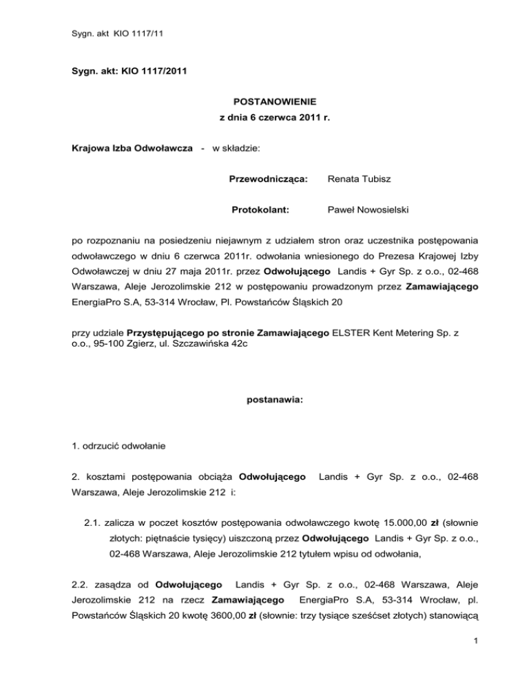 Sygn. akt KIO 1117/11 Sygn. akt: KIO 1117/2011 POSTANOWIENIE z dnia 6 czerwca 2011 r. Krajowa Izba Odwoławcza - w składzie: Przewodnicząca: Renata Tubisz Protokolant: Paweł Nowosielski po rozpoznaniu na posiedzeniu niejawnym z udziałem stron oraz uczestnika postępowania odwoławczego w dniu 6 czerwca 2011r. odwołania wniesionego do Prezesa Krajowej Izby Odwoławczej w dniu 27 maja 2011r. przez Odwołującego Landis + Gyr Sp. z o.o., 02-468 Warszawa, Aleje Jerozolimskie 212 w postępowaniu prowadzonym przez Zamawiającego EnergiaPro S.A, 53-314 Wrocław, Pl. Powstańców Śląskich 20 przy udziale Przystępującego po stronie Zamawiającego ELSTER Kent Metering Sp. z o.o., 95-100 Zgierz, ul. Szczawińska 42c postanawia: 1. odrzucić odwołanie 2. kosztami postępowania obciąŜa Odwołującego Landis + Gyr Sp. z o.o., 02-468 Warszawa, Aleje Jerozolimskie 212 i: 2.1. zalicza w poczet kosztów postępowania odwoławczego kwotę 15.000,00 zł (słownie złotych: piętnaście tysięcy) uiszczoną przez Odwołującego Landis + Gyr Sp. z o.o., 02-468 Warszawa, Aleje Jerozolimskie 212 tytułem wpisu od odwołania, 2.2. zasądza od Odwołującego Landis + Gyr Sp. z o.o., 02-468 Warszawa, Aleje Jerozolimskie 212 na rzecz Zamawiającego EnergiaPro S.A, 53-314 Wrocław, pl. Powstańców Śląskich 20 kwotę 3600,00 zł (słownie: trzy tysiące sześćset złotych) stanowiącą 1 Sygn. akt KIO 1117/11 uzasadnione koszty postępowania odwoławczego poniesione z tytułu wynagrodzenia pełnomocnika. Stosownie do art. 198a i 198b ustawy z dnia 29 stycznia 2004 r. - Prawo zamówień publicznych (t.j. Dz. U. z 2010 r. 113, poz. 759 ze zm.) na niniejsze postanowienie w terminie 7 dni od dnia jego doręczenia - przysługuje skarga za pośrednictwem Prezesa Krajowej Izby Odwoławczej do Sądu Okręgowego we Wrocławiu. Przewodnicząca: 2 Sygn. akt KIO 1117/11 Uzasadnienie W dniu 27 maja 2011r. Landis + Gyr Sp. z o.o., 02-468 Warszawa, Aleje Jerozolimskie 212 zwany dalej „Odwołującym” wniósł odwołanie. Odwołanie zostało wniesione w toku prowadzonego postępowania o udzielenie zamówienia publicznego na dostawę liczników przemysłowych i bilansowych na potrzeby EnergiaPro S.A., które zostało ogłoszone w Dzienniku Urzędowym Unii Europejskiej w dniu 16.03.2011r. pod poz.2011/S 52-085706. Odwołujący zaskarŜył czynność wyboru najkorzystniejszej oferty dokonanej w tym postępowaniu przez EnergiaPro S.A. pl. Powstańców Śląskich 20, 53-314 Wrocław zwany dalej „Zamawiającym”. W dniu 1 czerwca 2011r. do postępowania odwoławczego po stronie Zamawiającego przystąpił wykonawca wybrany to jest Elster Kent Metering sp. z o.o. ul. Szczawińska 42 c 95100 Zgierz zwany dalej „Przystępującym pod stronie Zamawiającego”. W dniu 3 czerwca 2011r. Zamawiający złoŜył odpowiedź na odwołanie, w którym wniósł o odrzucenie odwołania na podstawie art. 189 ust.2 pkt 2 ustawy z dnia 29 stycznia 2004 r. Prawo zamówień publicznych (t.j. Dz. U. z 2010 r. 113, poz. 759 ze zm.) zwanej dalej „Ustawą Pzp” podnosząc, Ŝe Odwołujący jako podwykonawca jest podmiotem nieuprawnionym do wniesienia odwołania, poniewaŜ występuje w bezpośrednich relacjach prawnych z wykonawcą, a nie z zamawiającym. Skład orzekający Izby ustalił i zwaŜył co następuje. Izba ustaliła co następuje Z treści odwołania wynika, Ŝe Odwołujący zawarł umowę ze spółką Energia pro Pomiary sp. z o.o. z siedzibą w Świdnicy, która to spółka złoŜyła ofertę Zamawiającemu w przetargu nieograniczonym, na dostawę liczników w związku z przedmiotowym postępowaniem o udzielenie zamówienia. PowyŜsze okoliczności znajdują potwierdzenie w doręczonej przez Zamawiającego dokumentacji postępowania o udzielenie zamówienia jak i okazały się bezsporne pomiędzy stronami w dniu 6 czerwca 2011r. na posiedzeniu z udziałem stron. 3 Sygn. akt KIO 1117/11 Odwołujący w czasie posiedzenia, po zapoznaniu się z odpowiedzią Zamawiającego na odwołanie, podtrzymał zarzuty i Ŝądania zawarte w odwołaniu. Na poparcie twierdzenia, Ŝe jako podwykonawca jest podmiotem uprawnionym do wniesienia odwołania, powołał się na zmianę treści art. 179 ust.1 ustawy Pzp oraz wyrok Krajowej Izby Odwoławczej z dnia 9 lutego 2010r. o Sygn. akt KIO/UZP 1983/09 zamieszczony w zielonym zeszycie nr 6 wydanie grudzień 2010r. Zamawiający i popierający Przystępujący pod stronie Zamawiającego wnosili o odrzucenie odwołania motywując, Ŝe ostatnie zmiany treści art. 179 ust.1 ustawy Pzp nie dają uprawnienia podwykonawcom do wnoszenia odwołania. Izba zwaŜyła co następuje Ustawą z dnia 2 grudnia 2009r. o zmianie ustawy Prawo zamówień publicznych oraz niektórych innych ustaw zwaną „duŜą nowelizacją” wprowadzono zmianę dotychczasowego brzmienia art. 179 ust. 1 ustawy Pzp ”Środki ochrony prawnej określone w niniejszym dziale przysługują wykonawcom i uczestnikom konkursu, a takŜe innym osobom, jeŜeli ich interes prawny w uzyskaniu zamówienia doznał lub moŜe doznać uszczerbku w wyniku naruszenia przez zamawiającego przepisów ustawy” na następujące brzmienie: „Środki ochrony prawnej określone w niniejszym, dziale przysługują wykonawcy, uczestnikowi konkursu, a takŜe innemu podmiotowi, jeŜeli miał lub ma interes w uzyskaniu zamówienia oraz poniósł lub moŜe ponieść szkodę w wyniku naruszenia przez zamawiającego przepisów niniejszej ustawy.” Nowa redakcja wyŜej cytowanego przepisu art.179 ust.1 ustawy Pzp wprowadziła zamiast pojęcia „interesu prawnego” pojęcie „interesu’, co odpowiada formule pojęcia „interesu” uŜytego w artykułach 1 ust.3 zmienionej Dyrektywy Rady 89/665/EWG i 92/13/EWG, Dyrektywą 2007/66/WE Parlamentu Europejskiego i Rady z dnia 11 grudnia 2007r. PowyŜsza zmiana „interesu prawnego” na „interes” nie zmienia faktu, Ŝe interes wykonawcy nadal wynika z normy prawa, w tym wypadku ustawy Prawo zamówień publicznych.
