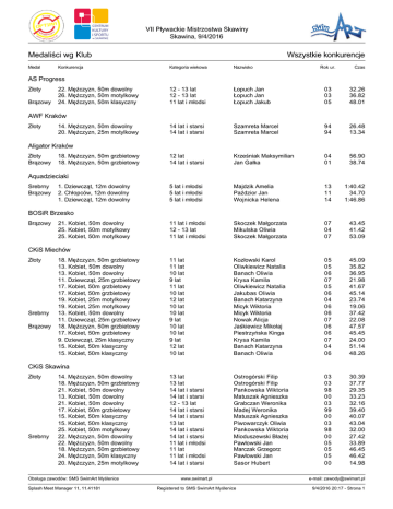 VII Pływackie Mistrzostwa Skawiny Skawina, 9/4/2016 Medaliści wg Klub Medal Konkurencja Wszystkie konkurencje Kategoria wiekowa Nazwisko Rok ur. Czas 12 - 13 lat 12 - 13 lat 11 lat i młodsi Łopuch Jan Łopuch Jan Łopuch Jakub 03 03 05 32.26 36.82 48.01 14 lat i starsi 14 lat i starsi Szamreta Marcel Szamreta Marcel 94 94 26.48 13.34 12 lat 14 lat i starsi Krześniak Maksymilian Jan Gałka 04 01 56.90 38.74 5 lat i młodsi 5 lat i młodsi 5 lat i młodsi Majdzik Amelia Paździor Jan Wojnicka Helena 13 11 14 1:40.42 34.70 1:46.86 11 lat i młodsi 12 - 13 lat 11 lat i młodsi Skoczek Małgorzata Mikulska Oliwia Skoczek Małgorzata 07 04 07 43.45 41.42 53.09 11 lat 11 lat 10 lat 9 lat 11 lat 10 lat 12 lat 10 lat 10 lat 9 lat 10 lat 10 lat 9 lat 12 lat 10 lat Kozłowski Karol Oliwkiewicz Natalia Banach Oliwia Krysa Kamila Oliwkiewicz Natalia Jakubas Oliwia Banach Katarzyna Micyk Wiktoria Micyk Wiktoria Nowak Alicja Jaśkiewicz Mikołaj Piestrzyńska Kinga Krysa Kamila Banach Katarzyna Banach Oliwia 05 05 06 07 05 06 04 06 06 07 06 06 07 04 06 45.09 35.82 36.95 21.98 41.67 45.14 23.74 19.06 37.42 22.08 47.57 45.45 24.00 51.14 48.26 13 lat 13 lat 14 lat i starsi 14 lat i starsi 12 - 13 lat 14 lat i starsi 14 lat i starsi 13 lat 14 lat i starsi 14 lat i starsi 11 lat i młodsi 11 lat 11 lat i młodsi 14 lat i starsi Ostrogórski Filip Ostrogórski Filip Pankowska Wiktoria Matuszak Agnieszka Grabczan Weronika Madej Weronika Matuszak Agnieszka Piwowarczyk Oliwia Pankowska Wiktoria Mioduszewski Błażej Pawłowski Jan Marczak Grzegorz Pawłowski Jan Sasor Hubert 03 03 98 00 03 99 00 03 98 00 05 05 05 00 30.39 37.77 29.35 33.23 32.16 39.40 40.07 43.04 32.00 27.42 33.89 46.45 46.42 14.98 AS Progress Złoty Brązowy 22. Mężczyzn, 50m dowolny 26. Mężczyzn, 50m motylkowy 24. Mężczyzn, 50m klasyczny AWF Kraków Złoty 14. Mężczyzn, 50m dowolny 20. Mężczyzn, 25m motylkowy Aligator Kraków Złoty Brązowy 18. Mężczyzn, 50m grzbietowy 18. Mężczyzn, 50m grzbietowy Aquadzieciaki Srebrny Brązowy 1. Dziewcząt, 12m dowolny 2. Chłopców, 12m dowolny 1. Dziewcząt, 12m dowolny BOSiR Brzesko Brązowy 21. Kobiet, 50m dowolny 25. Kobiet, 50m motylkowy 25. Kobiet, 50m motylkowy CKiS Miechów Złoty Srebrny Brązowy 18. Mężczyzn, 50m grzbietowy 13. Kobiet, 50m dowolny 13. Kobiet, 50m dowolny 11. Dziewcząt, 25m grzbietowy 17. Kobiet, 50m grzbietowy 17. Kobiet, 50m grzbietowy 19. Kobiet, 25m motylkowy 19. Kobiet, 25m motylkowy 13. Kobiet, 50m dowolny 11. Dziewcząt, 25m grzbietowy 18. Mężczyzn, 50m grzbietowy 17. Kobiet, 50m grzbietowy 9. Dziewcząt, 25m klasyczny 15. Kobiet, 50m klasyczny 15. Kobiet, 50m klasyczny CKiS Skawina Złoty Srebrny 14. Mężczyzn, 50m dowolny 18. Mężczyzn, 50m grzbietowy 21. Kobiet, 50m dowolny 13. Kobiet, 50m dowolny 21. Kobiet, 50m dowolny 17. Kobiet, 50m grzbietowy 15. Kobiet, 50m klasyczny 15. Kobiet, 50m klasyczny 25. Kobiet, 50m motylkowy 22. Mężczyzn, 50m dowolny 22. Mężczyzn, 50m dowolny 18. Mężczyzn, 50m grzbietowy 24. Mężczyzn, 50m klasyczny 20. Mężczyzn, 25m motylkowy Obsługa zawodów: SMS SwimArt Myślenice Splash Meet Manager 11, 11.41181 www.swimart.pl Registered to SMS SwimArt Myślenice e-mail: [email protected] 9/4/2016 20:17 - Strona 1 VII Pływackie Mistrzostwa Skawiny Skawina, 9/4/2016 Brązowy 26. Mężczyzn, 50m motylkowy 13. Kobiet, 50m dowolny 17. Kobiet, 50m grzbietowy 15. Kobiet, 50m klasyczny 23. Kobiet, 50m klasyczny 14. Mężczyzn, 50m dowolny 14. Mężczyzn, 50m dowolny 14. Mężczyzn, 50m dowolny 13. Kobiet, 50m dowolny 17. Kobiet, 50m grzbietowy 23. Kobiet, 50m klasyczny 14 lat i starsi 12 lat 12 lat 14 lat i starsi 14 lat i starsi 14 lat i starsi 11 lat 11 lat 13 lat 14 lat i starsi 12 - 13 lat Mioduszewski Błażej Budzeniusz Pola Budzeniusz Pola Madej Weronika Śliwińska Marta Sasor Hubert Sobota Roch Kierzkowski Eryk Piwowarczyk Oliwia Rzeszutko Weronika Grabczan Weronika 00 04 04 99 00 00 05 05 03 00 03 30.54 35.77 40.99 40.89 40.32 29.82 39.92 39.92 34.12 52.12 42.16 14 - 16 lat Surówka Krzysztof 00 15.67 8 lat 8 lat 8 lat 7 lat 11 lat 8 lat 7 lat 11 lat Pińczak Mateusz Pińczak Mateusz Jakubczyk Natalia Berent Ksawery Jakubczyk Amelia Jakubczyk Natalia Berent Ksawery Jakubczyk Amelia 08 08 08 09 05 08 09 05 19.09 26.23 19.70 29.29 40.91 23.95 29.77 24.12 9 lat 9 lat Pyrcioch Mikołaj Pyrcioch Mikołaj 07 07 17.51 21.07 14 - 16 lat 14 - 16 lat 14 - 16 lat 14 - 16 lat Łukasik Julia Tyrpa Michał Adam Wiktoria Jaworska Oliwia 00 02 02 00 15.34 16.39 16.26 16.89 11 lat i młodsi 11 lat i młodsi 11 lat i młodsi Mędrysa Martyna Mędrysa Martyna Mędrysa Martyna 05 05 05 33.95 45.63 42.16 9 lat Sowa Barbara 07 17.50 12 - 13 lat 12 - 13 lat 12 - 13 lat 11 lat i młodsi Tokarz Dawid Tarnowska Martyna Bajgrowicz Paweł Król Małgorzata 04 03 04 05 47.01 40.70 39.55 1:03.92 11 lat i młodsi 14 lat i starsi 12 - 13 lat 8 lat 14 lat i starsi 12 - 13 lat 12 - 13 lat 11 lat 12 - 13 lat Pajerski Jakub Mitka Klaudia Stefanowski Maciej Chrobak Tomasz Waga Mateusz Płusa Maksymilian Rudek Aleksandra Bartuś Maria Rudek Aleksandra 05 02 04 08 02 04 03 05 03 40.09 40.03 34.33 27.92 38.90 49.09 32.68 46.16 41.82 Camena kurs pływania Złoty 4. Chłopców, 25m dowolny Dragon Będzin Złoty Srebrny Brązowy 8. Chłopców, 25m dowolny 10. Chłopców, 25m klasyczny 7. Dziewcząt, 25m dowolny 12. Chłopców, 25m grzbietowy 13. Kobiet, 50m dowolny 11. Dziewcząt, 25m grzbietowy 8. Chłopców, 25m dowolny 19. Kobiet, 25m motylkowy Fala Gorlice Złoty Brązowy 8. Chłopców, 25m dowolny 12. Chłopców, 25m grzbietowy GIM 1 Skawina Złoty Srebrny Brązowy 3. Dziewcząt, 25m dowolny 4. Chłopców, 25m dowolny 3. Dziewcząt, 25m dowolny 3. Dziewcząt, 25m dowolny Glosator Kraków Złoty Srebrny 21. Kobiet, 50m dowolny 23. Kobiet, 50m klasyczny 25. Kobiet, 50m motylkowy Jasień Sucha Besk. Złoty 7. Dziewcząt, 25m dowolny Jordan Kraków Złoty Srebrny 24. Mężczyzn, 50m klasyczny 23. Kobiet, 50m klasyczny 26. Mężczyzn, 50m motylkowy 23. 