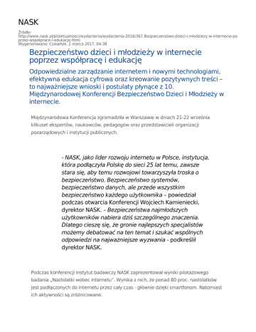 NASK Źródło: http://www.nask.pl/pl/aktualnosci/wydarzenia/wydarzenia-2016/367,Bezpieczenstwo-dzieci-i-mlodziezy-w-internecie-po przez-wspolprace-i-edukacje.html Wygenerowano: Czwartek, 2 marca 2017, 04:38 Bezpieczeństwo dzieci i młodzieży w internecie poprzez współpracę i edukację Odpowiedzialne zarządzanie internetem i nowymi technologiami, efektywna edukacja cyfrowa oraz kreowanie pozytywnych treści – to najważniejsze wnioski i postulaty płynące z 10. Międzynarodowej Konferencji Bezpieczeństwo Dzieci i Młodzieży w internecie. Międzynarodowa Konferencja zgromadziła w Warszawie w dniach 21-22 września kilkuset ekspertów, naukowców, pedagogów oraz przedstawicieli organizacji pozarządowych i instytucji publicznych. - NASK, jako lider rozwoju internetu w Polsce, instytucja, która podłączyła Polskę do sieci 25 lat temu, zawsze stara się, aby temu rozwojowi towarzyszyła troska o bezpieczeństwo. Bezpieczeństwo systemów, bezpieczeństwo danych, ale przede wszystkim bezpieczeństwo każdego użytkownika – powiedział podczas otwarcia Konferencji Wojciech Kamieniecki, dyrektor NASK. – Bezpieczeństwa najmłodszych użytkowników nabiera dziś szczególnego znaczenia. Dlatego cieszę się, że gronie najlepszych specjalistów możemy debatować na ten temat i szukać wspólnych odpowiedzi na najważniejsze wyzwania - podkreślił dyrektor NASK. Podczas konferencji instytut badawczy NASK zaprezentował wyniki pilotażowego badania „Nastolatki wobec internetu”. Wynika z nich, że ponad 80 proc. nastolatków jest podłączonych do internetu przez cały czas - głównie dzięki smartfonom. Natomiast ich aktywności są zróżnicowane. - Chociaż niemal wszyscy młodzi ludzie korzystają z internetu do komunikacji i rozrywki, to nie można powiedzieć, że jest to ich wyłączna aktywność w sieci – mówiła dr Agnieszka Wrońska z Akademii NASK. - 46,5 proc. badanych zadeklarowało, że codziennie korzysta z internetu dla poszerzenia swojej wiedzy związanej z hobby lub zainteresowaniami, 32,3 proc. do odrabiania lekcji, 27,1 proc. do poszerzania wiedzy potrzebnej do szkoły – podała dr Wrońska. Jednym z najbardziej istotnych wyzwań, związanych w korzystaniem z internetu, jest ochrona prywatnych informacji. Młodzież, wbrew obiegowej opinii, zasadniczo dba o ochronę swojej prywatności. Ograniczenie dostępu do swoich profili społecznościowych z tego powodu deklaruje 59,7 proc. nastolatków. Mają też konieczną do tego wiedzę. Zaledwie 1,4 proc. nie wie, jak korzystać z ustawień prywatności. - Jest jednak zauważalna grupa – 18 proc. respondentów – która nie widzi potrzeby ograniczania dostępu do publikowanych przez siebie treści – zaznacza dr Wrońska. Jak jednak przypomniał w czasie konferencji David Wright z brytyjskiego centrum Safer Internet, posiadacze smartfonów zezwalają na udostępnianie wielu osobistych danych, gdy instalują na nich aplikacje. Aplikacje wymagają dostępu m.in. do zdjęć, zapisanych kontaktów czy lokalizacji. Użytkownik przeważnie nie wie, do jakich celów wykorzystywane są te dane. Jeśli jednak chce korzystać z potrzebnych mu funkcji aplikacji, musi wyrazić zgodę. David Wright przekonywał, że szkoła, chcąc efektywnie uczyć dzieci bezpiecznego korzystania z nowych technologii, musi unikać powielania rad, które się zdezaktualizowały i nie pasują do dzisiejszych funkcjonalności wirtualnego świata oraz uważnie śledzić aktywności dzieci online. Z kolei Boris Radanović, z chorwackiego centrum Safer Internet, przedstawił złożoność istniejących aplikacji oraz dynamikę ich powstawania. Konkurencja na tym rynku jest ogromna, a same cechy aplikacji tak zróżnicowane, że znajdują się wśród nich zarówno faktycznie pomocne w codziennym życiu, funkcjonalne i oferujące ciekawą i często mądrą rozrywkę produkty, jak również aplikacje, które są wręcz niebezpieczne dla zdrowia i bezpieczeństwa użytkowników. Uczestnicy dyskusji panelowej podkreślali, że nie da się zmienić rzeczywistości. Smartfony nie znikną, a dzieci i młodzież będą w internecie oglądać filmy, korespondować ze znajomymi i grać w gry. Niestety dorośli pozwalają, by takie rozrywki pochłaniały coraz więcej ich czasu. Dzieci po prostu biorą z nich przykład. Tymczasem dorasta pokolenie dzieci dosłownie wychowywanych przez elektroniczną rozrywkę. Jak mówiła podczas dyskusji Anna Rywczyńska – Koordynatorka Polskiego Centrum Programu Safer Internet z NASK, wielu rodziców zbyt wcześnie przekazuje w ręce najmłodszych dzieci sprzęt elektroniczny - telefony komórkowe, tablety. -Nie wiadomo jeszcze, jakie to będzie miało skutki dla rozwoju społecznego i psychicznego tych dzieci. Ocenimy to za kilka lub kilkanaście lat. Wiadomo np. że empatia wykształca się dzięki obserwacji twarzy najbliższych. Ekran nie może zdominować innych bodźców; jeśli częściej niż twarze rodziców dziecko będzie widziało ekran, może to mieć negatywne skutki – podkreśliła, dodając, że - w najbliższych latach największym wyzwaniem będzie właściwe zarządzanie internetem i technologiami w naszym życiu – tak abyśmy nie dali się technologii zdominować. Międzynarodowa Konferencji „Bezpieczeństwo dzieci i młodzieży w internecie” odbyła się już po raz dziesiąty. Organizatorem konferencji jest Polskie Centrum Programu Safer Internet, które tworzy NASK - instytut badawczy i Fundacja Dajemy Dzieciom Siłę (dawniej Fundacja Dzieci Niczyje) oraz niemieckie konsorcjum realizujące projekt klicksafe. Współorganizatorem jest ITU (Międzynarodowy Związek Telekomunikacyjny), a głównym partnerem – Fundacja Orange. 10. Międzynarodowa Konferencja Bezpieczeństwo Dzieci i Młodzieży w internecie