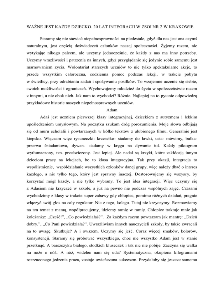 WAŻNE JEST KAŻDE DZIECKO. 20 LAT INTEGRACJI W ZSOI NR 2 W KRAKOWIE. Staramy się nie stawiać niepełnosprawności na piedestale, gdyż dla nas jest ona czymś naturalnym, jest częścią doświadczeń członków naszej społeczności. Żyjemy razem, nie wytykając nikogo palcem, ale uczymy jednocześnie, że każdy z nas ma inne potrzeby. Uczymy wrażliwości i patrzenia na innych, gdyż przyglądanie się jedynie sobie samemu jest marnowaniem życia. Wolontariat starszych uczniów to nie tylko spektakularne akcje, to przede wszystkim całoroczna, codzienna pomoc podczas lekcji, w trakcie pobytu w świetlicy, przy odrabianiu zadań i spożywaniu posiłków. To wzajemne uczenie się siebie, swoich możliwości i ograniczeń. Wychowujemy młodzież do życia w społeczeństwie razem z innymi, a nie obok nich. Jak nam to wychodzi? Różnie. Najlepiej na to pytanie odpowiedzą przykładowe historie naszych niepełnosprawnych uczniów. Adam Adaś jest uczniem pierwszej klasy integracyjnej, dzieckiem z autyzmem i lekkim upośledzeniem umysłowym. Na początku szukam dróg porozumienia. Moje słowa odbijają się od muru echolalii i powtarzanych w kółko tekstów z ulubionego filmu. Generalnie jest kiepsko. Włączam więc rysuneczki: krzesełko- siadamy do ławki, usta- mówimy, bułkaprzerwa śniadaniowa, dywan- siadamy w kręgu na dywanie itd. Każdy piktogram wytłumaczony, tzn. przećwiczony. Jest lepiej. Ale nadal są krzyki, które zakłócają innym dzieciom pracę na lekcjach, bo to klasa integracyjna. Tak przy okazji, integracja to współistnienie, współdziałanie wszystkich członków danej grupy, więc należy dbać o interes każdego, a nie tylko tego, który jest sprawny inaczej. Dostosowujemy się wszyscy, by korzystać mógł każdy, a nie tylko wybrany. To jest idea integracji. Więc uczymy się z Adasiem nie krzyczeć w szkole, a już na pewno nie podczas wspólnych zajęć. Czasami wychodzimy z klasy w trakcie super zabawy gdy chłopiec, pomimo różnych działań, pragnie włączyć swój głos na cały regulator. Nic z tego, kolego. Tutaj nie krzyczymy. Rozmawiamy na ten temat z mamą, współpracujemy, idziemy ramię w ramię. Chłopiec traktuje mnie jak koleżankę: „Cześć!”, „Co powiedziałaś?”. Za każdym razem powtarzam jak mantrę: „Dzień dobry.”, „Co Pani powiedziała?”. Uwrażliwiam innych nauczycieli szkoły, by także zwracali na to uwagę. Skutkuje? A i owszem. Uczymy się jeść. Coraz więcej smaków, kolorów, konsystencji. Staramy się próbować wszystkiego, choć nie wszystko Adam jest w stanie przełknąć. A barszczyku białego, słodkich kluseczek i tak nic nie pobije. Zaczyna się walka na noże o nóż. A nóż, widelec nam się uda? Systematyczna, okupiona kilogramami rozrzuconego jedzenia praca, zostaje uwieńczona sukcesem. Przydałoby się jeszcze samemu docierać do szkolnej stołówki, więc rozpracowujemy topografię budynku szkoły. Miesiącami prowadzimy siebie nawzajem po zaułkach naszej Prima Schola. I tak dokonujemy wejścia na kolejny szczebel, prowadzący do usamodzielnienia się chłopca. Ale to nie koniec, bo na szkole życie się nie kończy. To może spróbujemy podbić pobliski market? Pierwsza wycieczka jest jedynie próbą wejścia w dziki tłum. Spacerujemy, oglądamy towary. Uczeń niewiele mówi, jedynie łowi wzrokiem miejsca. Kolejne wejście to poznawanie stoiska owocowo - warzywnego. Kupujemy banana. Podchodzimy do kasy samoobsługowej: koszyk na półkę, banan na wagę, na ekranie wyszukujemy artykuł, klikamy, płacimy, wychodzimy i… jemy. „Ale zaszaleliście. Przy takich wydatkach z torbami raczej nie pójdziemy.”- słyszę lekką ironię w głosie taty Adama. Kolejna eskapada kończy się równie „szaleńczymi” zakupami, ale przy kasie chłopiec radzi sobie już sam. Podczas najbliższego zebrania ojciec ucznia z ciągłym niedowierzaniem opowiada, jak to Adaś zakasował go przy samoobsługowej kasie: „Ja tego nadal nie potrafię”. Po sześciu latach nikt nie wierzy, że jesteśmy klasą integracyjną. Adam nie jest już „inny”. Nie krzyczy podczas lekcji. Prezentuje bardzo wysoką kulturę osobistą. Osiąga dobre i bardzo dobre wyniki w nauce. Samodzielnie porusza się po szkole, docierając i wracając z miejsc, które wytycza mu się na bieżąco. Wyjeżdża z nami na zielone szkoły, podczas których staje się dwudziestoczterogodzinnym, przebojowym radiem klasowym. Zna chyba wszystkie piosenki zarówno polsko, jaki i anglojęzyczne. Wykonuje je fantastyczne! Jest wyjątkowo uzdolniony muzycznie. W międzyszkolnym konkursie piosenki angielskiej zdobywa wyróżnienie. W powiatowym konkursie fotograficznym otrzymuje pierwsze miejsce. W klasie niejeden raz rozbawia nas do łez swoimi „celnymi” ripostami. Wszyscy go bardzo lubimy. Teraz jest uczniem gimnazjum, najlepiej przygotowanym, spośród innych dzieci z autyzmem, do podjęcia tego trudnego zadania. Tak twierdzą nauczyciele tejże szkoły. Sukces Adama to wynik świetnej, ale i ciężkiej współpracy szkoły oraz domu, wszystkich nauczycieli, dzieci i rodziców. Aurelia Przygotowując się do objęcia klasy pierwszej czytam i przypominam sobie sporo wiadomości na temat autyzmu. W orzeczeniu przyszłej uczennicy jedyne zalecenie brzmi: „Kształcenie specjalne dla uczniów autystycznych”. Dziewczynka, która przychodzi z mamą na rozpoczęcie szkoły, ma twarz zasłoniętą włosami i spuszczoną głowę. Oto Aurelia, dziecko niemówiące, wycofane, nie nawiązujące kontaktu, w trakcie medycznej diagnozy w kierunku autyzmu. Cała postać kuli się, a wszelkie próby mamy dołączenia córki do klasy kończą się przeraźliwym, długotrwałym krzykiem, połączonym ze stawianiem oporu i próbą ciągnięcia kobiety w przeciwną stronę. Czy taka dziewczynka na pewno powinna rozpocząć naukę w pierwszej klasie integracyjnej? Niezbyt miła niespodzianka, w postaci drącego się wniebogłosy dziecka, krótka