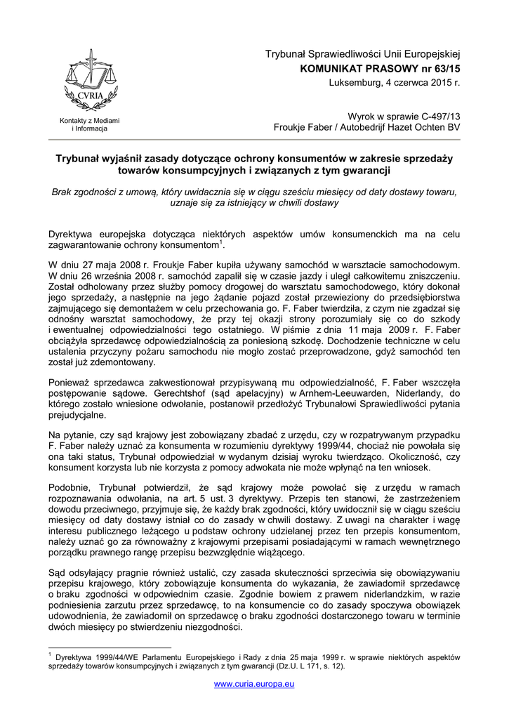 Trybunał Sprawiedliwości Unii Europejskiej KOMUNIKAT PRASOWY nr 63/15 Luksemburg, 4 czerwca 2015 r. Kontakty z Mediami i Informacja Wyrok w sprawie C-497/13 Froukje Faber / Autobedrijf Hazet Ochten BV Trybunał wyjaśnił zasady dotyczące ochrony konsumentów w zakresie sprzedaży towarów konsumpcyjnych i związanych z tym gwarancji Brak zgodności z umową, który uwidacznia się w ciągu sześciu miesięcy od daty dostawy towaru, uznaje się za istniejący w chwili dostawy Dyrektywa europejska dotycząca niektórych aspektów umów konsumenckich ma na celu zagwarantowanie ochrony konsumentom1. W dniu 27 maja 2008 r. Froukje Faber kupiła używany samochód w warsztacie samochodowym. W dniu 26 września 2008 r. samochód zapalił się w czasie jazdy i uległ całkowitemu zniszczeniu. Został odholowany przez służby pomocy drogowej do warsztatu samochodowego, który dokonał jego sprzedaży, a następnie na jego żądanie pojazd został przewieziony do przedsiębiorstwa zajmującego się demontażem w celu przechowania go. F. Faber twierdziła, z czym nie zgadzał się odnośny warsztat samochodowy, że przy tej okazji strony porozumiały się co do szkody i ewentualnej odpowiedzialności tego ostatniego. W piśmie z dnia 11 maja 2009 r. F. Faber obciążyła sprzedawcę odpowiedzialnością za poniesioną szkodę. Dochodzenie techniczne w celu ustalenia przyczyny pożaru samochodu nie mogło zostać przeprowadzone, gdyż samochód ten został już zdemontowany. Ponieważ sprzedawca zakwestionował przypisywaną mu odpowiedzialność, F. Faber wszczęła postępowanie sądowe. Gerechtshof (sąd apelacyjny) w Arnhem-Leeuwarden, Niderlandy, do którego zostało wniesione odwołanie, postanowił przedłożyć Trybunałowi Sprawiedliwości pytania prejudycjalne. Na pytanie, czy sąd krajowy jest zobowiązany zbadać z urzędu, czy w rozpatrywanym przypadku F. Faber należy uznać za konsumenta w rozumieniu dyrektywy 1999/44, chociaż nie powołała się ona taki status, Trybunał odpowiedział w wydanym dzisiaj wyroku twierdząco. Okoliczność, czy konsument korzysta lub nie korzysta z pomocy adwokata nie może wpłynąć na ten wniosek. Podobnie, Trybunał potwierdził, że sąd krajowy może powołać się z urzędu w ramach rozpoznawania odwołania, na art. 5 ust. 3 dyrektywy. Przepis ten stanowi, że zastrzeżeniem dowodu przeciwnego, przyjmuje się, że każdy brak zgodności, który uwidocznił się w ciągu sześciu miesięcy od daty dostawy istniał co do zasady w chwili dostawy. Z uwagi na charakter i wagę interesu publicznego leżącego u podstaw ochrony udzielanej przez ten przepis konsumentom, należy uznać go za równoważny z krajowymi przepisami posiadającymi w ramach wewnętrznego porządku prawnego rangę przepisu bezwzględnie wiążącego. Sąd odsyłający pragnie również ustalić, czy zasada skuteczności sprzeciwia się obowiązywaniu przepisu krajowego, który zobowiązuje konsumenta do wykazania, że zawiadomił sprzedawcę o braku zgodności w odpowiednim czasie. Zgodnie bowiem z prawem niderlandzkim, w razie podniesienia zarzutu przez sprzedawcę, to na konsumencie co do zasady spoczywa obowiązek udowodnienia, że zawiadomił on sprzedawcę o braku zgodności dostarczonego towaru w terminie dwóch miesięcy po stwierdzeniu niezgodności. 1 Dyrektywa 1999/44/WE Parlamentu Europejskiego i Rady z dnia 25 maja 1999 r. w sprawie niektórych aspektów sprzedaży towarów konsumpcyjnych i związanych z tym gwarancji (Dz.U. L 171, s. 12). www.curia.europa.eu Trybunał przypomniał w tym zakresie, że dyrektywa 1999/442 stanowi, iż państwa członkowskie mogą postanowić, że w celu skorzystania ze swoich uprawnień konsument musi powiadomić sprzedawcę o braku zgodności w okresie dwóch miesięcy od daty, kiedy odkrył taki brak zgodności. Zgodnie z pracami przygotowawczymi do tej dyrektywy, możliwość ta jest podyktowana chęcią wzmocnienia pewności prawa, poprzez zachęcenie kupującego do „zachowania określonej staranności, uwzględniając interesy sprzedawcy”, „bez wprowadzenia ścisłego obowiązku dokładnego zbadania towaru”. Trybunał wyjaśnił, że obowiązek nałożony w tym zakresie na konsumenta nie może wykraczać poza konieczność zawiadomienia sprzedawcy o braku zgodności. Konsument nie może na tym etapie być zobowiązany do przedstawienia dowodu, że brak zgodności rzeczywiście wpływa na zakupiony przez niego towar ani nie może być zobowiązany do wskazania szczegółowej przyczyny tego braku zgodności. Natomiast, aby zawiadomienie mogło być przydatne sprzedawcy, powinno zawierać określone informacje, których stopień szczegółowości będzie różnić się w zależności od szczególnych okoliczności danego przypadku. Wreszcie sąd odsyłający zmierza do ustalenia, w jaki sposób należy stosować rozkład ciężaru dowodu, a w szczególności, jakie okoliczności powinien wykazać konsument. Trybunał orzekł, że w przypadku gdy brak zgodności ujawnił się w ciągu sześciu miesięcy od dnia dostawy towaru, dyrektywa łagodzi ciężar dowodu spoczywający na konsumencie stanowiąc, iż przyjmuje się, że brak zgodności istniał w momencie dostawy. W celu skorzystania z takiego złagodzenia ciężaru dowodu, konsument musi jednakże przedstawić dowód na określone okoliczności. W pierwszej kolejności konsument musi podnieść i wykazać, że sprzedany towar nie jest zgodny z umową, na przykład z tego powodu, że nie posiada cech uzgodnionych w umowie lub też nie nadaje się do użytku, jakiego można by normalnie spodziewać się w przypadku tego rodzaju towaru. Konsument ma obowiązek udowodnić jedynie występowanie braku zgodności. Nie jest on zobowiązany udowodnić przyczyny takiego braku zgodności ani wykazać, że za jego powstanie odpowiada sprzedawca. W drugiej kolejności konsument musi udowodnić, że dany brak zgodności ujawnił się, to znaczy stał się fizycznie widoczny w ci