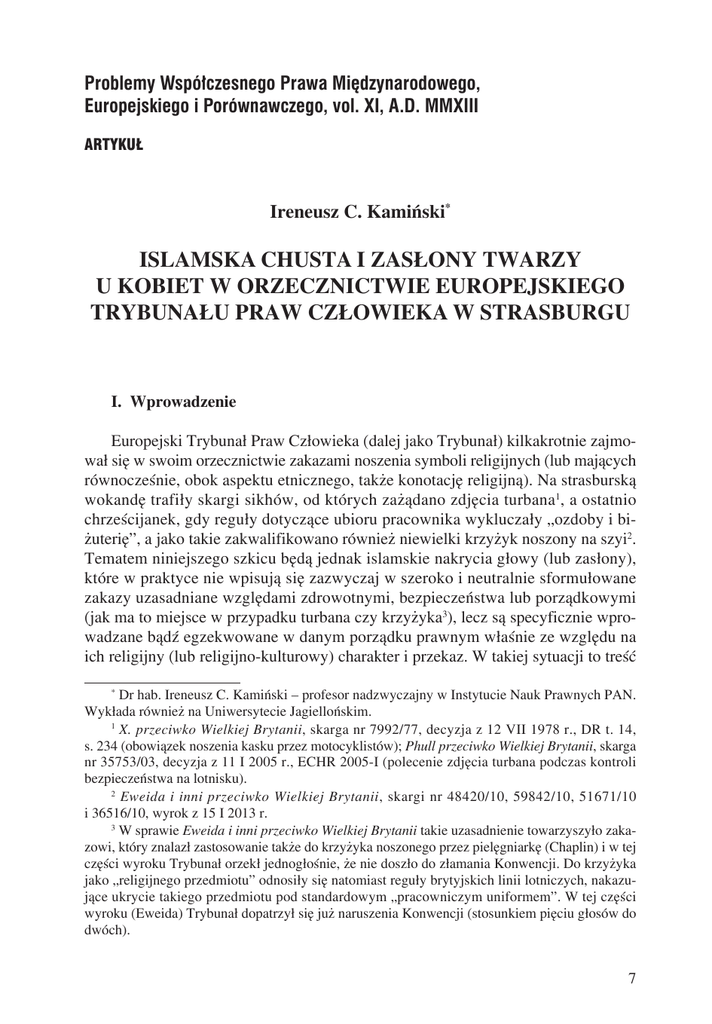Problemy Współczesnego Prawa Międzynarodowego, Europejskiego i Porównawczego, vol. XI, A.D. MMXIII ARTYKUŁ Ireneusz C. Kamiński* ISLAMSKA CHUSTA I ZASŁONY TWARZY U KOBIET W ORZECZNICTWIE EUROPEJSKIEGO TRYBUNAŁU PRAW CZŁOWIEKA W STRASBURGU I. Wprowadzenie Europejski Trybunał Praw Człowieka (dalej jako Trybunał) kilkakrotnie zajmował się w swoim orzecznictwie zakazami noszenia symboli religijnych (lub mających równocześnie, obok aspektu etnicznego, także konotację religijną). Na strasburską wokandę trafiły skargi sikhów, od których zażądano zdjęcia turbana1, a ostatnio chrześcijanek, gdy reguły dotyczące ubioru pracownika wykluczały „ozdoby i biżuterię”, a jako takie zakwalifikowano również niewielki krzyżyk noszony na szyi2. Tematem niniejszego szkicu będą jednak islamskie nakrycia głowy (lub zasłony), które w praktyce nie wpisują się zazwyczaj w szeroko i neutralnie sformułowane zakazy uzasadniane względami zdrowotnymi, bezpieczeństwa lub porządkowymi (jak ma to miejsce w przypadku turbana czy krzyżyka3), lecz są specyficznie wprowadzane bądź egzekwowane w danym porządku prawnym właśnie ze względu na ich religijny (lub religijno-kulturowy) charakter i przekaz. W takiej sytuacji to treść Dr hab. Ireneusz C. Kamiński – profesor nadzwyczajny w Instytucie Nauk Prawnych PAN. Wykłada również na Uniwersytecie Jagiellońskim. 1 X. przeciwko Wielkiej Brytanii, skarga nr 7992/77, decyzja z 12 VII 1978 r., DR t. 14, s. 234 (obowiązek noszenia kasku przez motocyklistów); Phull przeciwko Wielkiej Brytanii, skarga nr 35753/03, decyzja z 11 I 2005 r., ECHR 2005-I (polecenie zdjęcia turbana podczas kontroli bezpieczeństwa na lotnisku). 2 Eweida i inni przeciwko Wielkiej Brytanii, skargi nr 48420/10, 59842/10, 51671/10 i 36516/10, wyrok z 15 I 2013 r. 3 W sprawie Eweida i inni przeciwko Wielkiej Brytanii takie uzasadnienie towarzyszyło zakazowi, który znalazł zastosowanie także do krzyżyka noszonego przez pielęgniarkę (Chaplin) i w tej części wyroku Trybunał orzekł jednogłośnie, że nie doszło do złamania Konwencji. Do krzyżyka jako „religijnego przedmiotu” odnosiły się natomiast reguły brytyjskich linii lotniczych, nakazujące ukrycie takiego przedmiotu pod standardowym „pracowniczym uniformem”. W tej części wyroku (Eweida) Trybunał dopatrzył się już naruszenia Konwencji (stosunkiem pięciu głosów do dwóch). * 7 komunikatu wpisującego się w chustę (zasłonę) okazuje się zasadniczo kontrowersyjna i wywołuje reakcję. Normatywną podstawą skarg kierowanych w związku z zakazem noszenia chusty (lub wymierzoną za to sankcją) jest przede wszystkim art. 9 Europejskiej Konwencji o Ochronie Praw Człowieka i Podstawowych Wolności (dalej jako Konwencja)4, który dotyczy wolności myśli, sumienia i wyznania. Stanowi on, że: 1. Każdy ma prawo do wolności myśli, sumienia i wyznania; prawo to obejmuje wolność zmiany wyznania lub przekonań oraz wolność uzewnętrzniania indywidualnie lub wspólnie z innymi, publicznie lub prywatnie, swego wyznania lub przekonań przez uprawianie kultu, nauczanie, praktykowanie i czynności rytualne. 2. Wolność uzewnętrzniania wyznania lub przekonań może podlegać jedynie takim ograniczeniom, które są przewidziane przez prawo i konieczne w społeczeństwie demokratycznym z uwagi na interesy bezpieczeństwa publicznego, ochronę porządku publicznego, zdrowia i moralności lub ochronę praw i wolności innych osób. Artykuł 9 należy do tych postanowień Konwencji, które posługują się tzw. klauzulą limitacyjną. Wolność myśli, sumienia i wyznania, której zakres został określony w ustępie 1 art. 9, nie jest absolutna. Można ją ograniczać, ale jedynie po łącznym spełnieniu trzech warunków (trójelementowy test). Każda ingerencja musi być przewidziana przez prawo (legalność), służyć ochronie co najmniej jednego z wyraźnie zidentyfikowanych interesów bądź dóbr (celowość) i być konieczna w demokratycznym społeczeństwie (konieczność). Obok art. 9 skarżący podnosili też czasami zarzut dyskryminacyjnego traktowania (art. 14)5 oraz naruszenia prawa do nauki (art. 2 Protokołu nr 1), gdyż następstwem noszenia chusty było niewpuszczenie na teren szkoły (uczelni) lub niedopuszczenie do zajęć bądź egzaminów. II. Pierwsza sprawa – Karaduman przeciwko Turcji Pierwsza strasburska sprawa związana z islamską chustą to Karaduman przeciwko Turcji6. Skargę wniosła absolwentka studiów z zakresu farmacji, której nie wydano dyplomu, bo na przekazanym uniwersyteckiej administracji zdjęciu na głowie Polski tekst w Dz. U. z 1993 r. Nr 61, poz. 284 z późn. zm. Zarzut dyskryminacji na podstawie art. 14 nie ma samodzielnego charakteru; może zostać podniesiony tylko wtedy, gdy w danej sprawie ma zastosowanie prawo (swoboda) poddane już ochronie Konwencji. Samodzielność zarzutowi dyskryminacji nadał dopiero Protokół nr 12 z 4 XI 2000 r., który wszedł w życie 1 IV 2005 r. Tym protokołem związało się jednak tylko osiemnaście z czterdziestu siedmiu państw stron Konwencji (dalszych dziewiętnaście go podpisało; dane na kwiecień 2013 r.). 6 Skarga nr 16278/90, decyzja z 3 V 1993 r., DR 74, s. 93. Tego samego dnia Komisja rozpoznała w analogiczny sposób sprawę Bulut przeciwko Turcji, skarga nr 18783/91. 4 5 8 studentki znajdowała się chusta7. Należy dodać, że Karaduman mogła nosić chustę na uniwersytecie podczas studiów8. Zanim Europejska Komisja Praw Człowieka (dalej jako Komisja)9 mogła przystąpić do weryfikacji, czy ograniczenie spełniało rygory Konwencji, musiała najpierw ustalić, czy wymóg przedstawienia zdjęcia do dyplomu bez nakrycia głowy stanowił w ogóle ingerencję w wolność religii skarżącej. Komisja uznała, że celem fotografii dołączanej do dyplomu jako dokumentu poświadczającego uzyskanie wykształcenia i uprawnień zawodowych jest identyfikacja osoby. Dokument 