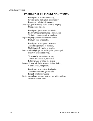 Jan Kasprowicz PAMIĘTAM TE PIASKI NAD WODĄ Pamiętam te piaski nad wodą, Gromniczne pamiętam dziewanny I poszept tych fal nieustanny, Co swoją, pozbawioną słów, pieśnią więziły Moją duszę młodą. Pamiętam, jak trzcina się kładła Pod wiatru przyjaznym podmuchem; Te jaskry pamiętam i w głuchem Uśpieniu pogrążone w białe noce letnie Białych chat widziadła. Pamiętam to wszystko, te rowy, Zarosłe łopianem, te miedze, Na których, bywało, ja siedzę, I rzucam listki głogu na wróżbę dni przyszłych, Na świt szczęścia nowy. Te wierzby pamiętam, te osty, To kawek krakanie, te wiśnie I ślaz ten, co w okna się ciśnie I starca, który wiedział, czemu słońce świeci, Czemu wiąz jest prosty. Pamiętam to wzgórze śród pola, Zarosłe wrzosami, gdzie leże Polegli znaleźli rycerze I trakt ten dobrze pomnę, którym po wiek wieków Smutna chodzi Dola. 76 KRESOWE STANICE
